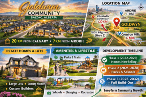 Goldwyn is a master-planned prairie estate community in Balzac, Alberta, part of Rocky View County — just north of Calgary and south of Airdrie.