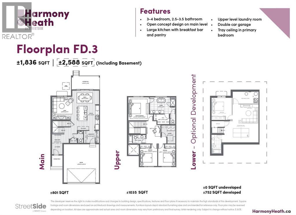 Experience the height of sophisticated living in this highly coveted luxury townhome, where a generous floor plan meets modern comfort and refined finishes. Proudly presented by StreetSide – this thoughtfully designed unit features 3 bedrooms, 2.5 bathrooms, and a front attached double car garage. The heart of the home is a spacious kitchen with a large central island, polished white quartz countertops, upgraded stainless steel appliances, and elegant sliding French patio doors that open to your covered deck area—ideal for both everyday living and entertaining. Light floods into the living room with ease through the large window, while luxury vinyl plank flooring flows throughout the main floor living areas, and carpeted stairs leading to the upper level and bedrooms provide extra warmth. The primary ensuite is a private sanctuary, complete with tile flooring, double sinks, a freestanding soaker tub, and an oversized tile-and-glass shower delivering spa-inspired comfort at home. The unfinished basement with roughed-in plumbing provides future potential for additional living space tailored to your needs. Professional landscaping and fencing complete your new home. Ideally located in the award-winning community of Harmony, residents enjoy Mickelson National Golf Course, private lake amenities, scenic walking and biking trails, and a wellness-focused lifestyle—just a shorty drive from Calgary city minutes and 45 minutes from the Rocky Mountains, where nature and convenience come together effortlessly. Please note Photos are renderings. (id:51989)