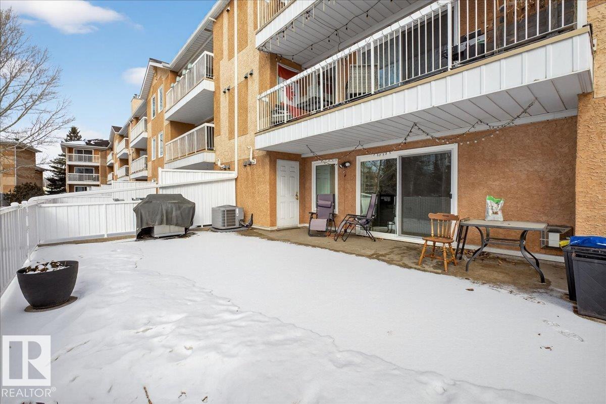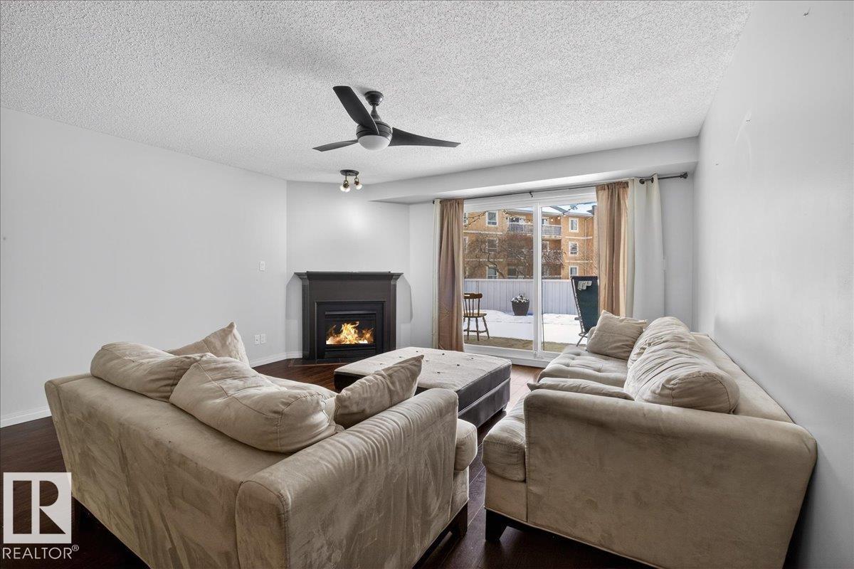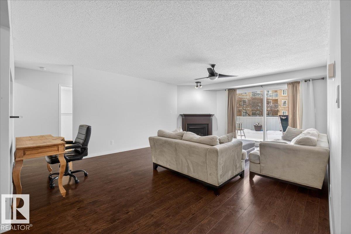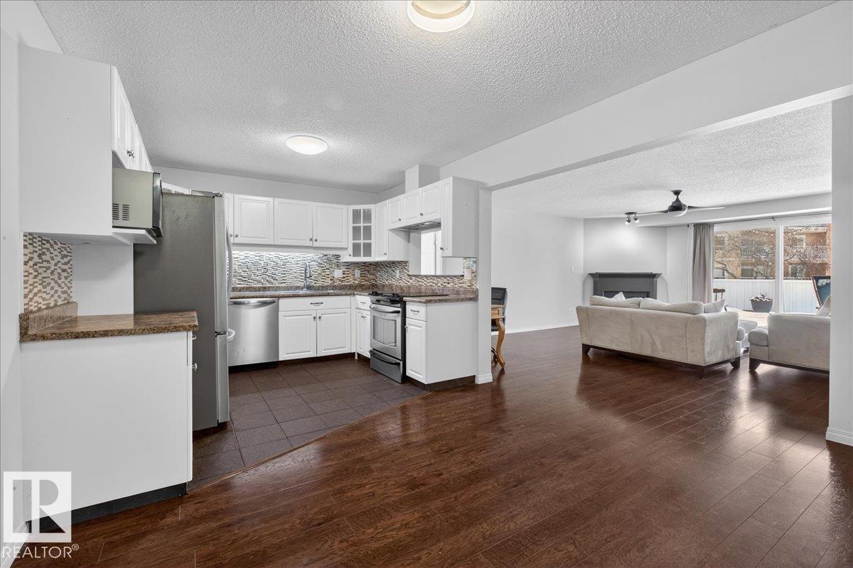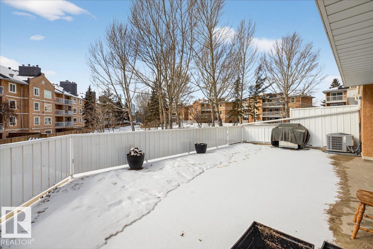Enjoy downtown living without sacrificing space in this spacious condo offering over 1,300 sq ft of living space, just steps from the River Valley. This bright 3 bedroom, 2 full bathroom unit features a large exclusive-use south-facing patio/deck overlooking the courtyard—perfect for summer, complete with a natural gas BBQ line and additional storage. The updated kitchen offers white cabinetry, newer stainless steel appliances, ample counter space, and laminate flooring, opening to the dining area with a passthrough to the expansive living room filled with natural light from patio doors. The primary bedroom fits a king-sized bed and includes a 4-piece ensuite. Additional highlights include central A/C, a gas fireplace, in-suite laundry, and TWO heated underground parking stalls. Building amenities include an exercise room and sauna. Ideally located minutes to Downtown, Rogers Place, LRT, Little Italy, and Commonwealth Stadium. (id:51989)