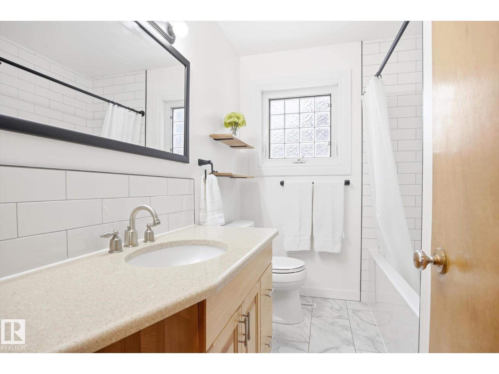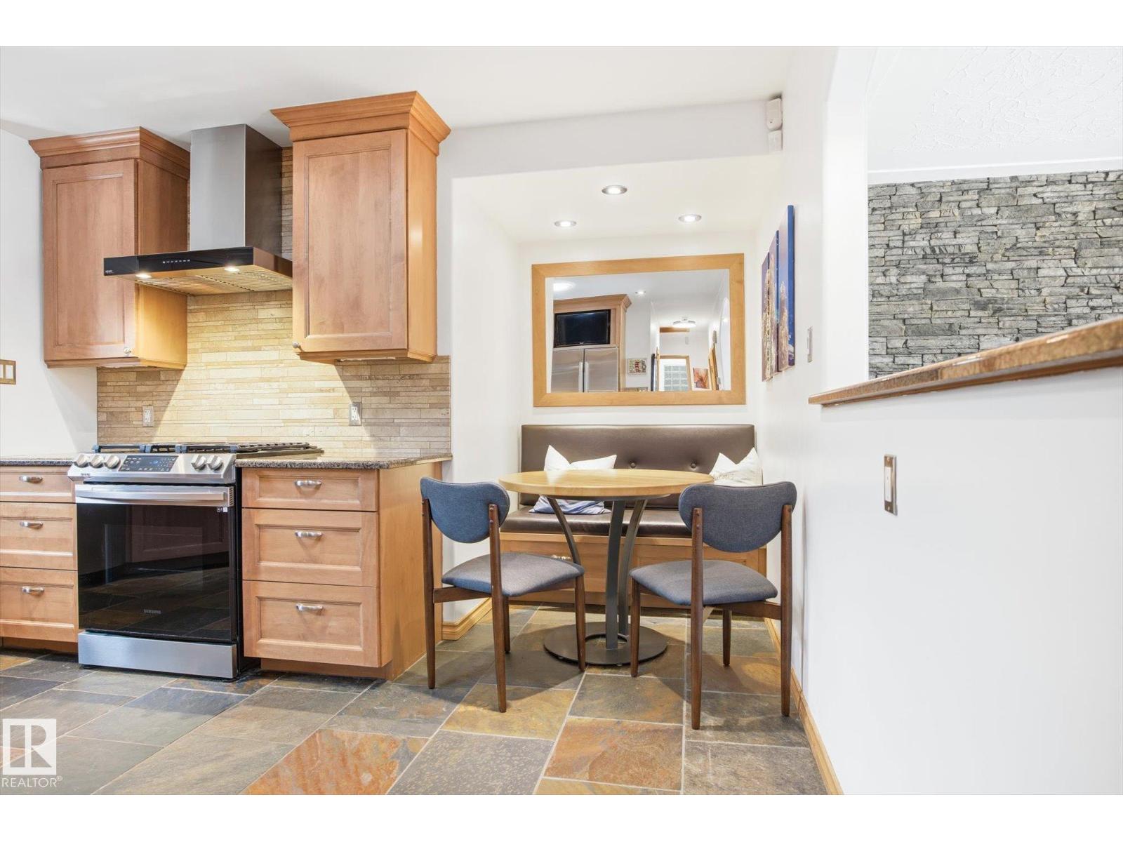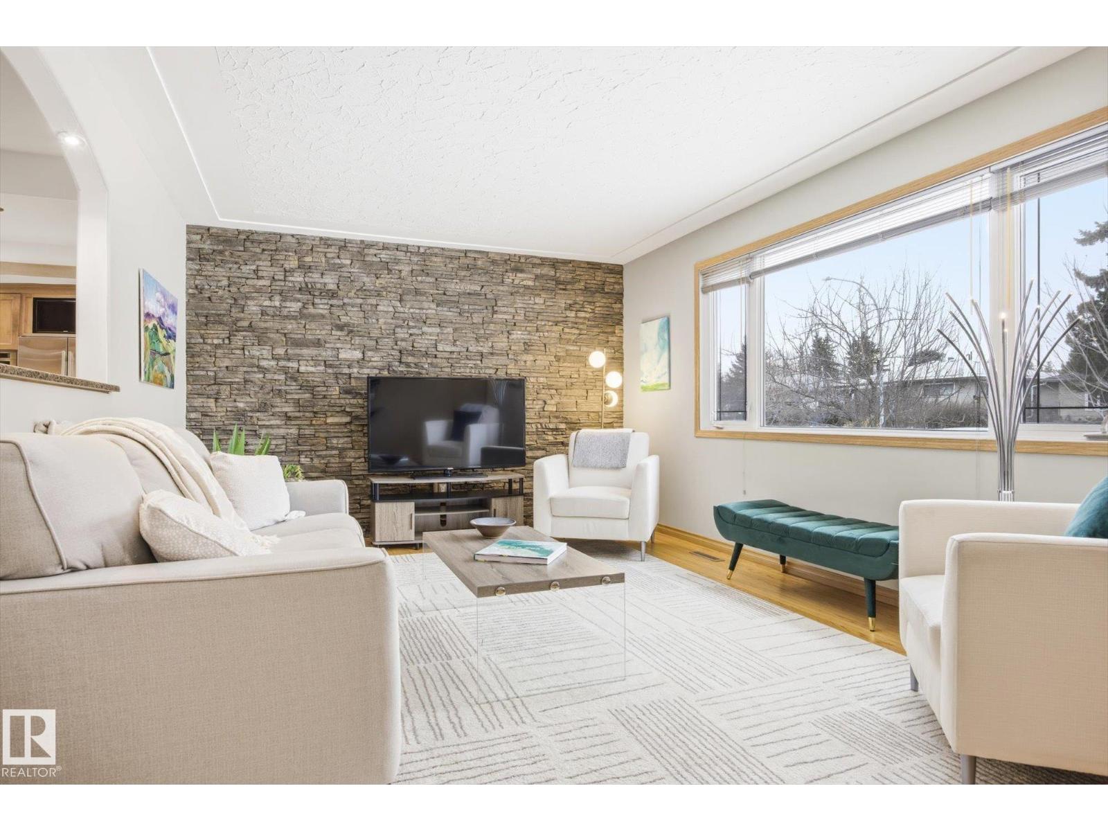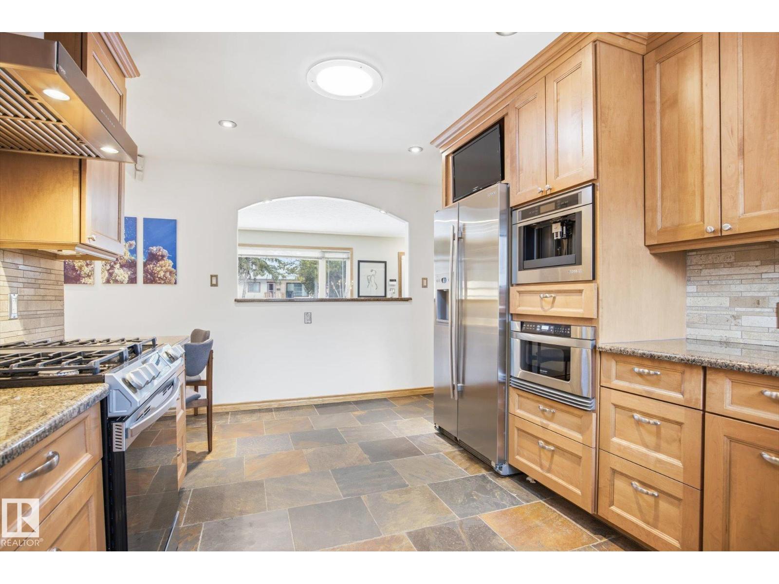 Extensively upgraded bungalow in Terrace Heights on a quiet street steps to the ravine, river valley & bike trails. This 3+1 bedroom home offers refined finishes & exceptional functionality. The main floor features a stunning primary suite with custom feature wall & fully built-out closet with integrated lighting, + 2 additional bedrooms. The Huntwood custom kitchen showcases solid wood cabinetry, dovetail drawers, granite countertops, travertine backsplash & premium JennAir fridge & built-in espresso machine, SAMSUNG NG oven / stove & Bosch dishwasher. Slate & hardwood flooring, pot lighting & bright dining nook complete the space. The fully finished basement offers a huge bedroom, upgraded 3-piece bath with custom concrete floors & rec space wired for home theatre . Upgrades include Navien on-demand hot water, A/C, water conditioner, newer shingles, triple pane windows. Heated 22x24 garage with epoxy floor. Prime Terrace Heights location half block from Ravine & close to excellent schools & amenities (id:51989)