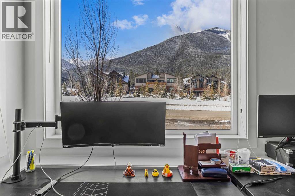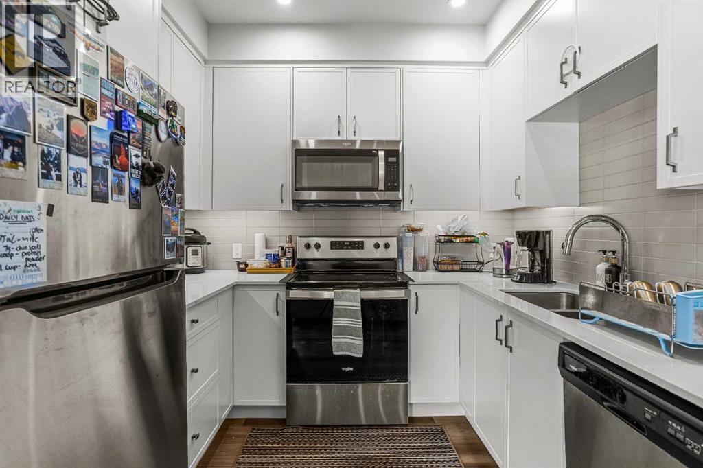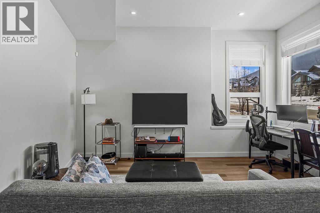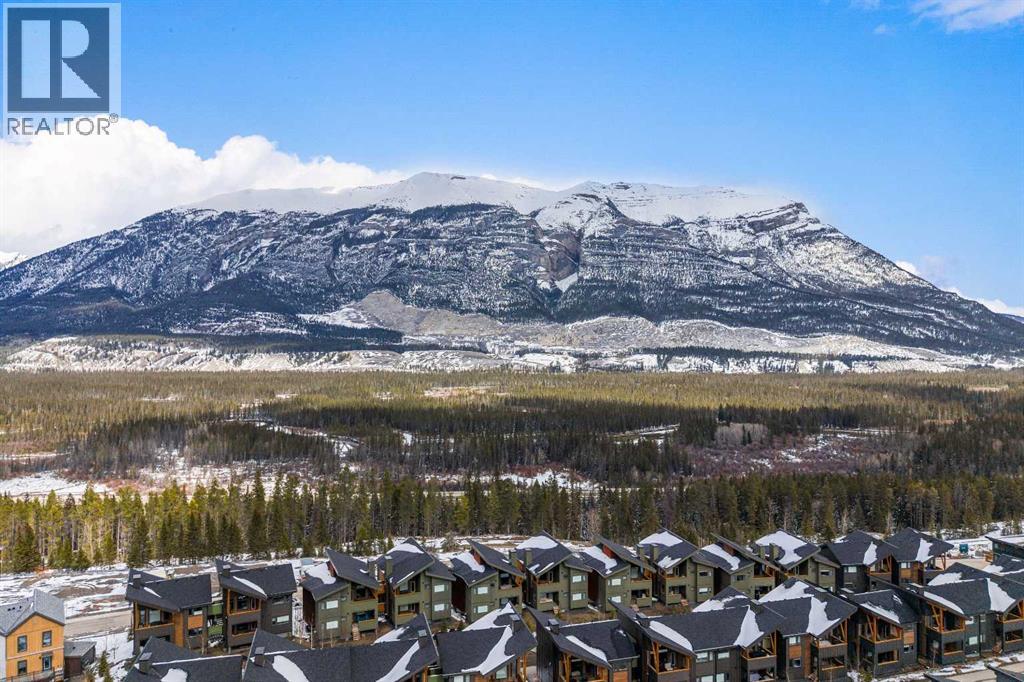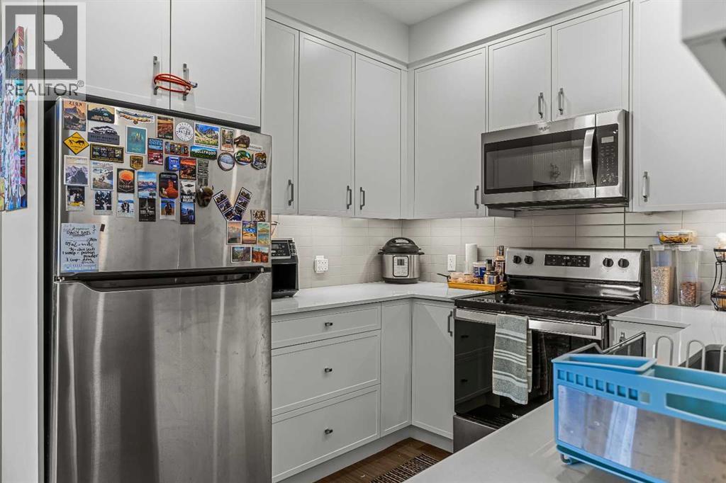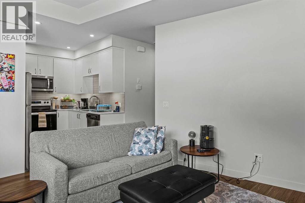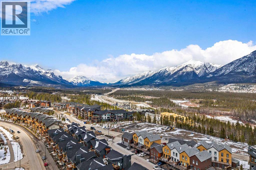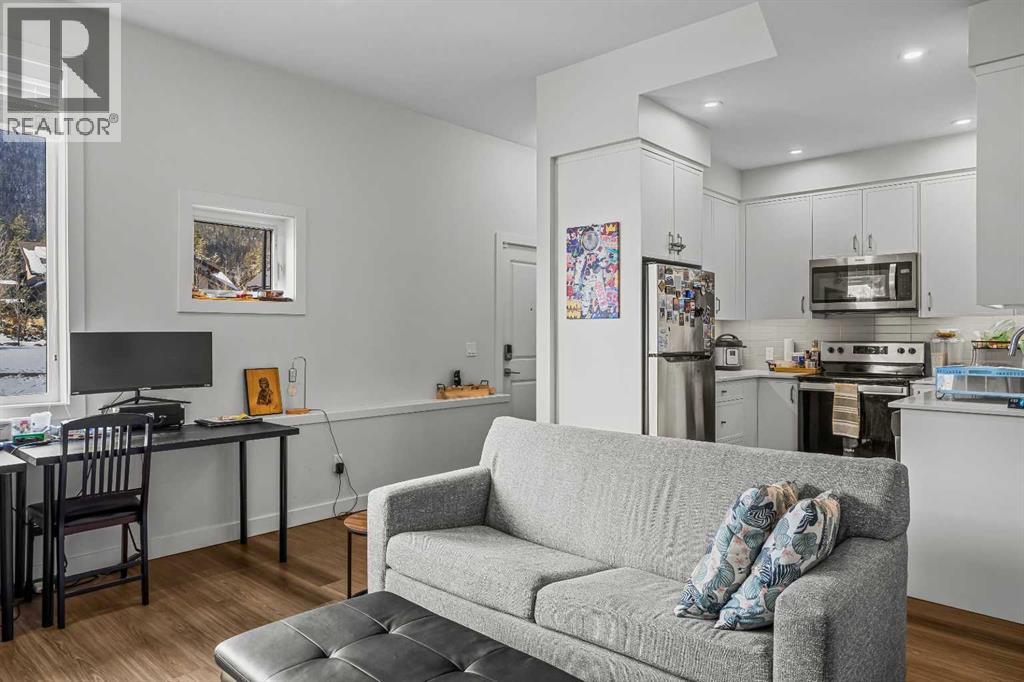 Welcome to 102G – 1200 Three Sisters Parkway, a beautifully designed 1-bedroom condominium in the highly desirable community of Stewart Creek, offering modern mountain living in one of Canmore’s fastest growing neighbourhoods.This thoughtfully laid-out home features over 620 sq ft of bright, open living space with large windows that flood the interior with natural light and showcase stunning mountain views right from your living area and workspace. The open-concept living room provides a comfortable place to relax, complete with warm wood flooring and seamless flow into the kitchen.The modern kitchen offers clean contemporary finishes including quartz countertops, stainless steel appliances, full-height cabinetry, and a stylish tile backsplash. Its efficient design provides excellent storage and workspace while maintaining an open connection to the living area—ideal for both everyday living and entertaining.A standout feature of this home is the flexible workspace positioned beside oversized windows, creating a bright and inspiring area for working from home while enjoying views of the surrounding peaks.The spacious bedroom provides a quiet retreat with generous closet space and easy access to the well-appointed 4-piece bathroom. In-suite stacked laundry and additional storage add convenience and practicality.Situated on the ground level with easy access, this home is perfect for full-time living, a mountain getaway, or an investment property. Stewart Creek continues to grow as one of Canmore’s most desirable communities, and this location is conveniently close to the upcoming Three Sisters Gateway commercial district, future home to an IGA grocery store, cafés, restaurants, and services—bringing everyday amenities just minutes from your door.Surrounded by world-class hiking, biking, and cross-country ski trails, and just steps from the Stewart Creek Golf Course, this home offers the perfect balance of mountain lifestyle and modern convenience. (id:51989)