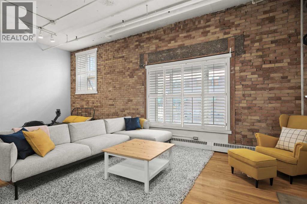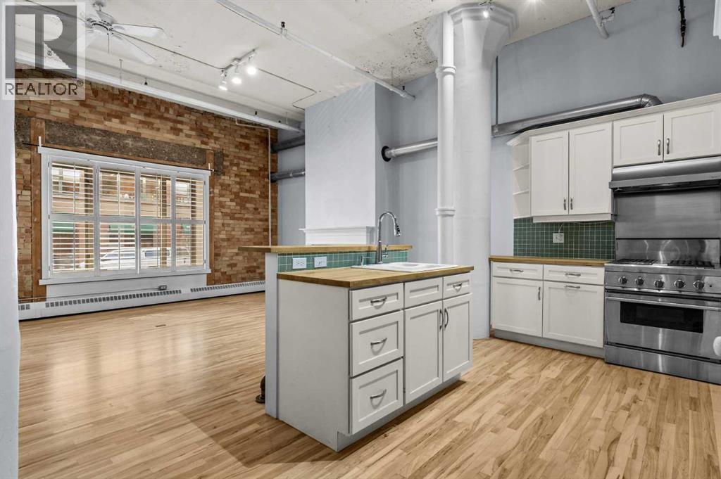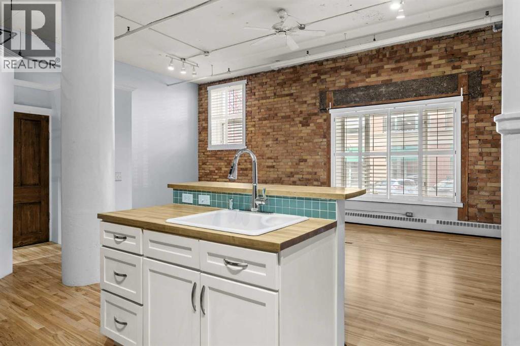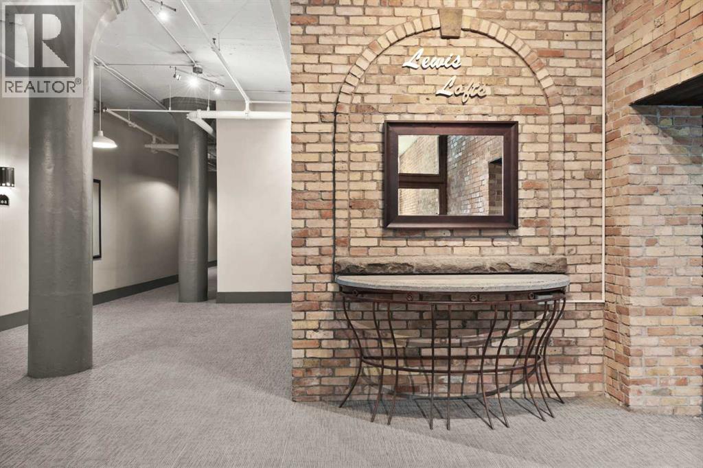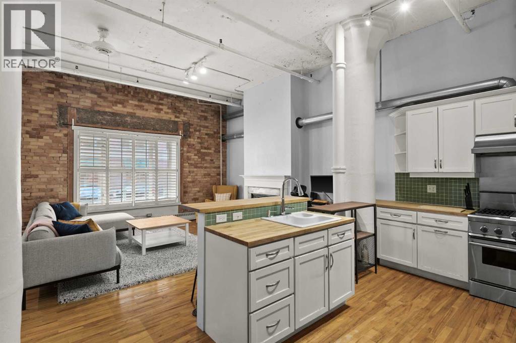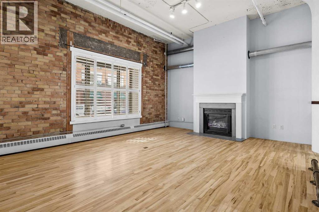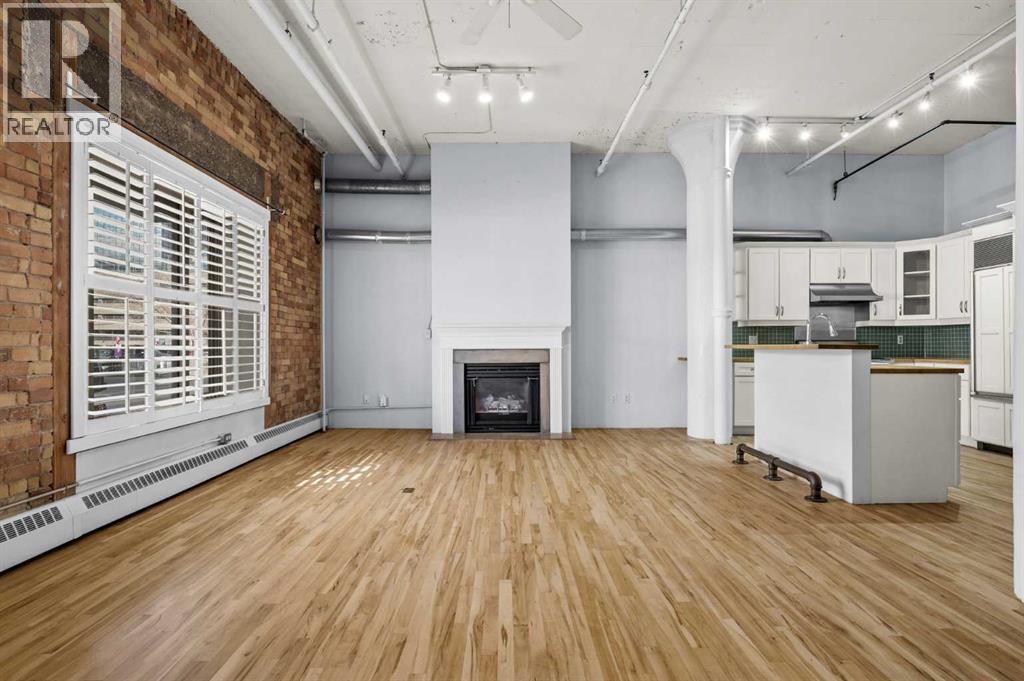 Welcome to the Lewis Loft Building, a historic gem nestled in the vibrant Beltline district of Downtown Calgary. This stunning unit boasts an open layout that seamlessly combines modern luxury with vintage charm. Hardwood floors and soaring high ceilings complement the exposed brick walls, creating an inviting and spacious atmosphere. The kitchen features stainless steel appliances, gas range, and striking butcher block countertops. A breakfast bar and ample cupboard space make this kitchen as functional as it is stylish. The living room is a cozy retreat with a large window that floods the space with natural light and a gas fireplace that adds a touch of warmth and elegance. Convenience is key with in-suite laundry, underground heated parking ( #45), and an additional storage locker (#56). Note the exceptional roof top retreat/patio area just one floor above. Attention to detail and meticulous care of this unit includes … Floors - repaired, sanded and refinished (January), ceiling painted (March), unit painted (2022), cabinets refinished (2024), wash/dryer (2022).The location is unbeatable, situated close to transit, tennis courts, parks, and an array of restaurants. Just a few blocks from both Stephen Avenue and 17th Avenue, you'll be in the heart of Calgary's cultural and social scene. Lewis Lofts is in the process of applying for Heritage Status. Pet lovers will be pleased to know that, with Board approval, the Lewis Loft Building allows for one dog and one cat or two cat. Come and experience the perfect blend of historic character and contemporary comfort. (id:51989)