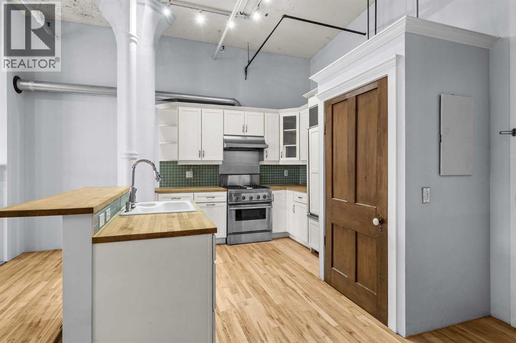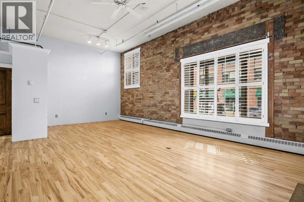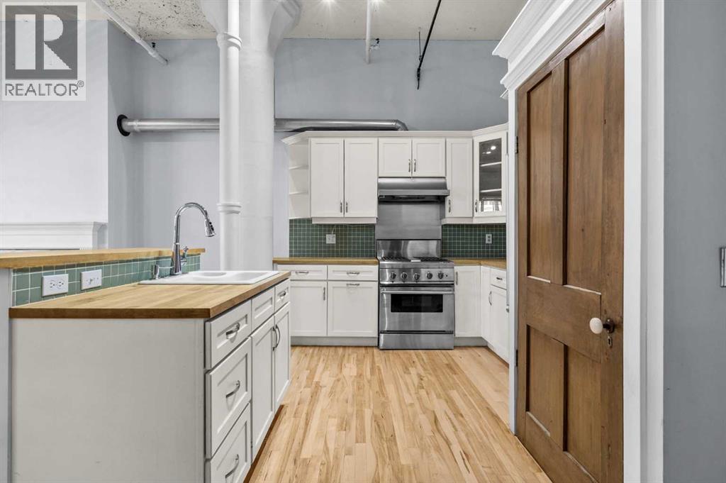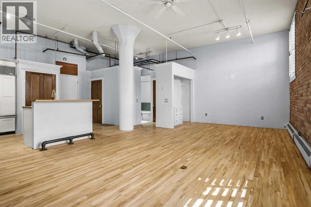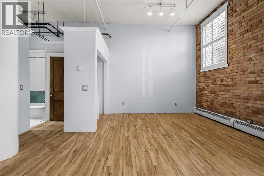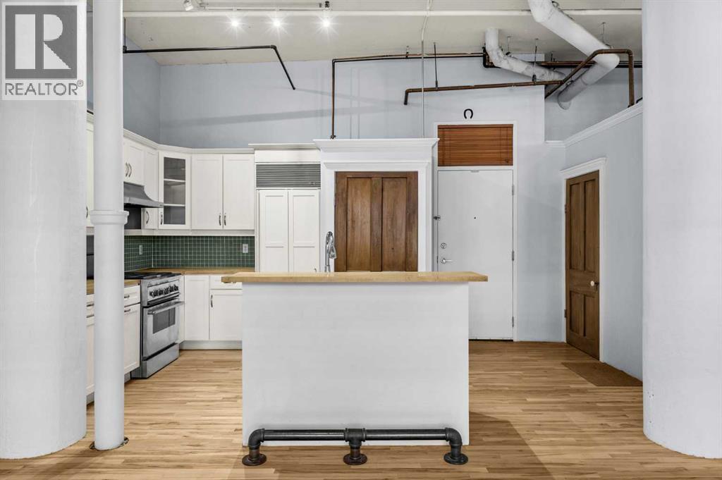 Welcome to the Lewis Loft Building, a historic gem nestled in the vibrant Beltline district of Downtown Calgary. This stunning unit boasts an open layout that seamlessly combines modern luxury with vintage charm. Hardwood floors and soaring high ceilings complement the exposed brick walls, creating an inviting and spacious atmosphere. The kitchen features stainless steel appliances, gas range, and striking butcher block countertops. A breakfast bar and ample cupboard space make this kitchen as functional as it is stylish. The living room is a cozy retreat with a large window that floods the space with natural light and a gas fireplace that adds a touch of warmth and elegance. Convenience is key with in-suite laundry, underground heated parking ( #45), and an additional storage locker (#56). Note the exceptional roof top retreat/patio area just one floor above. Attention to detail and meticulous care of this unit includes … Floors - repaired, sanded and refinished (January), ceiling painted (March), unit painted (2022), cabinets refinished (2024), wash/dryer (2022).The location is unbeatable, situated close to transit, tennis courts, parks, and an array of restaurants. Just a few blocks from both Stephen Avenue and 17th Avenue, you'll be in the heart of Calgary's cultural and social scene. Lewis Lofts is in the process of applying for Heritage Status. Pet lovers will be pleased to know that, with Board approval, the Lewis Loft Building allows for one dog and one cat or two cat. Come and experience the perfect blend of historic character and contemporary comfort. (id:51989)
