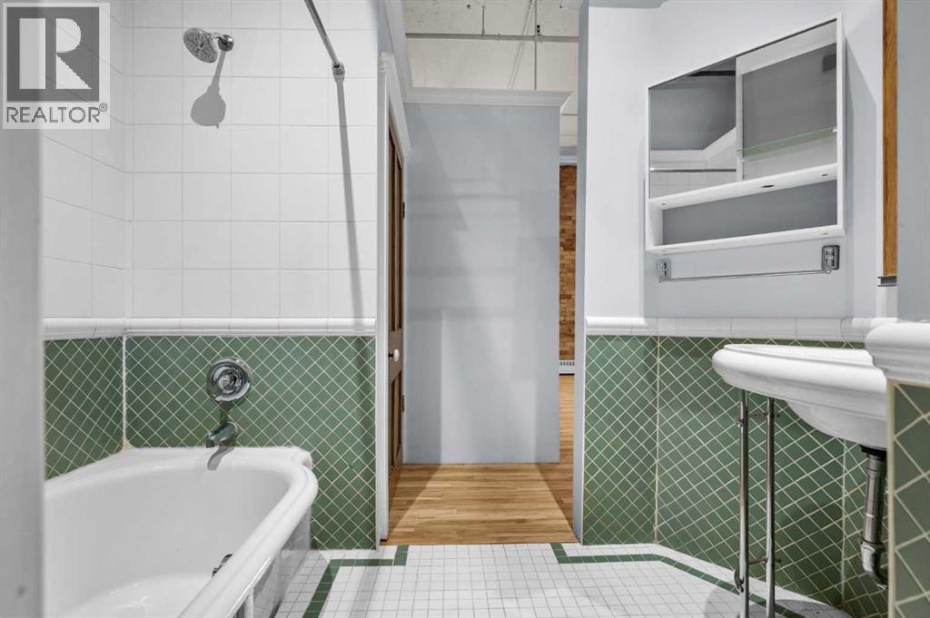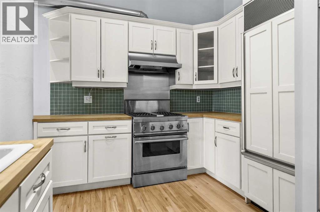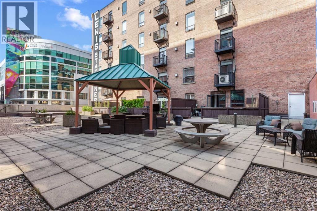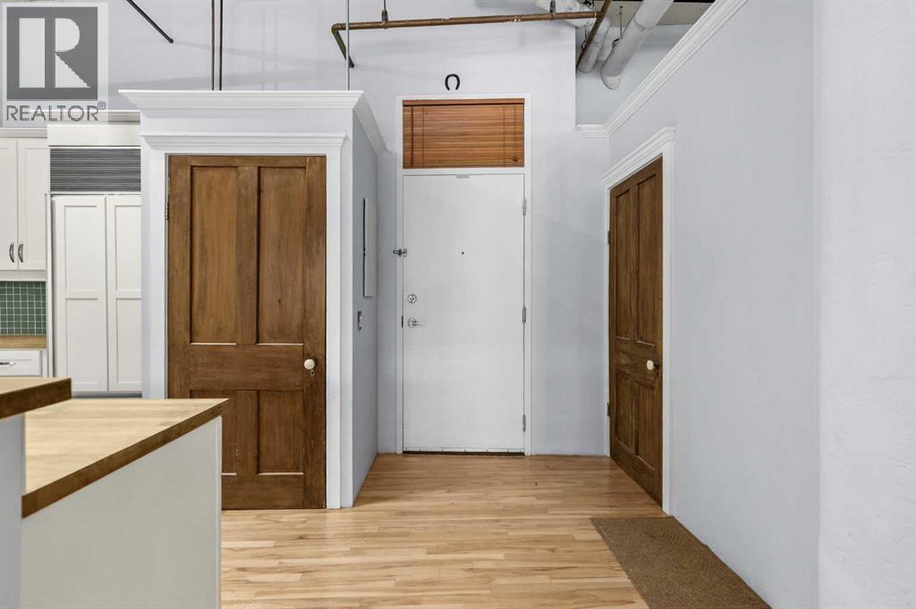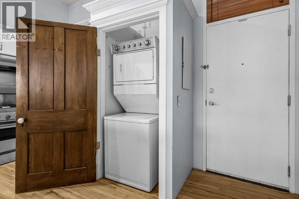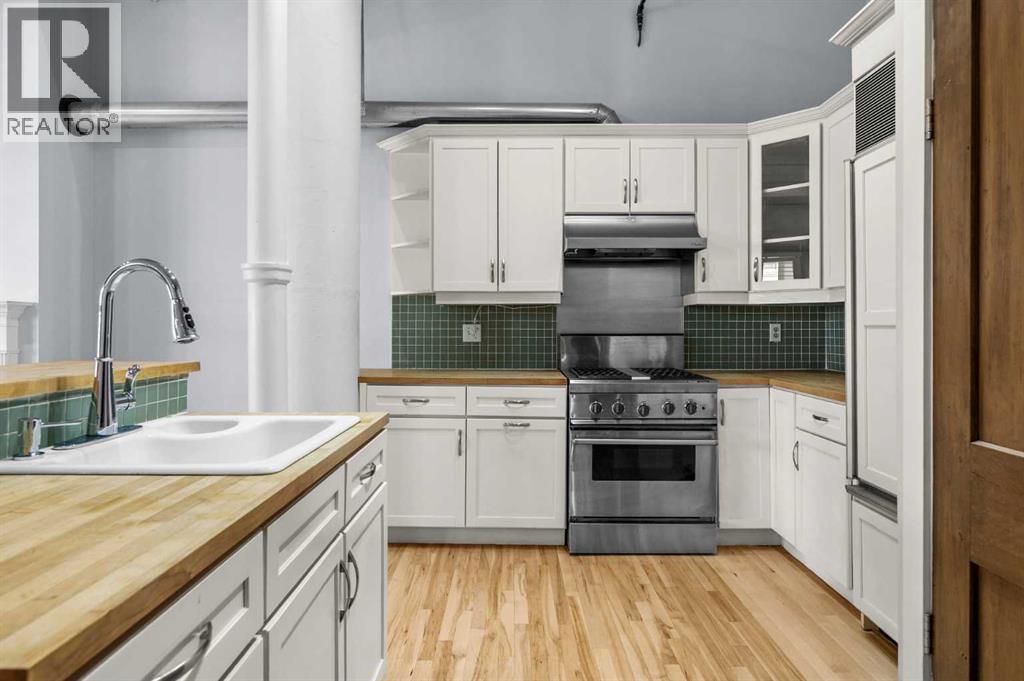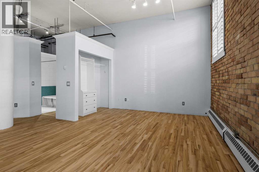 Welcome to the Lewis Loft Building, a historic gem nestled in the vibrant Beltline district of Downtown Calgary. This stunning unit boasts an open layout that seamlessly combines modern luxury with vintage charm. Hardwood floors and soaring high ceilings complement the exposed brick walls, creating an inviting and spacious atmosphere. The kitchen features stainless steel appliances, gas range, and striking butcher block countertops. A breakfast bar and ample cupboard space make this kitchen as functional as it is stylish. The living room is a cozy retreat with a large window that floods the space with natural light and a gas fireplace that adds a touch of warmth and elegance. Convenience is key with in-suite laundry, underground heated parking ( #45), and an additional storage locker (#56). Note the exceptional roof top retreat/patio area just one floor above. Attention to detail and meticulous care of this unit includes … Floors - repaired, sanded and refinished (January), ceiling painted (March), unit painted (2022), cabinets refinished (2024), wash/dryer (2022).The location is unbeatable, situated close to transit, tennis courts, parks, and an array of restaurants. Just a few blocks from both Stephen Avenue and 17th Avenue, you'll be in the heart of Calgary's cultural and social scene. Lewis Lofts is in the process of applying for Heritage Status. Pet lovers will be pleased to know that, with Board approval, the Lewis Loft Building allows for one dog and one cat or two cat. Come and experience the perfect blend of historic character and contemporary comfort. (id:51989)