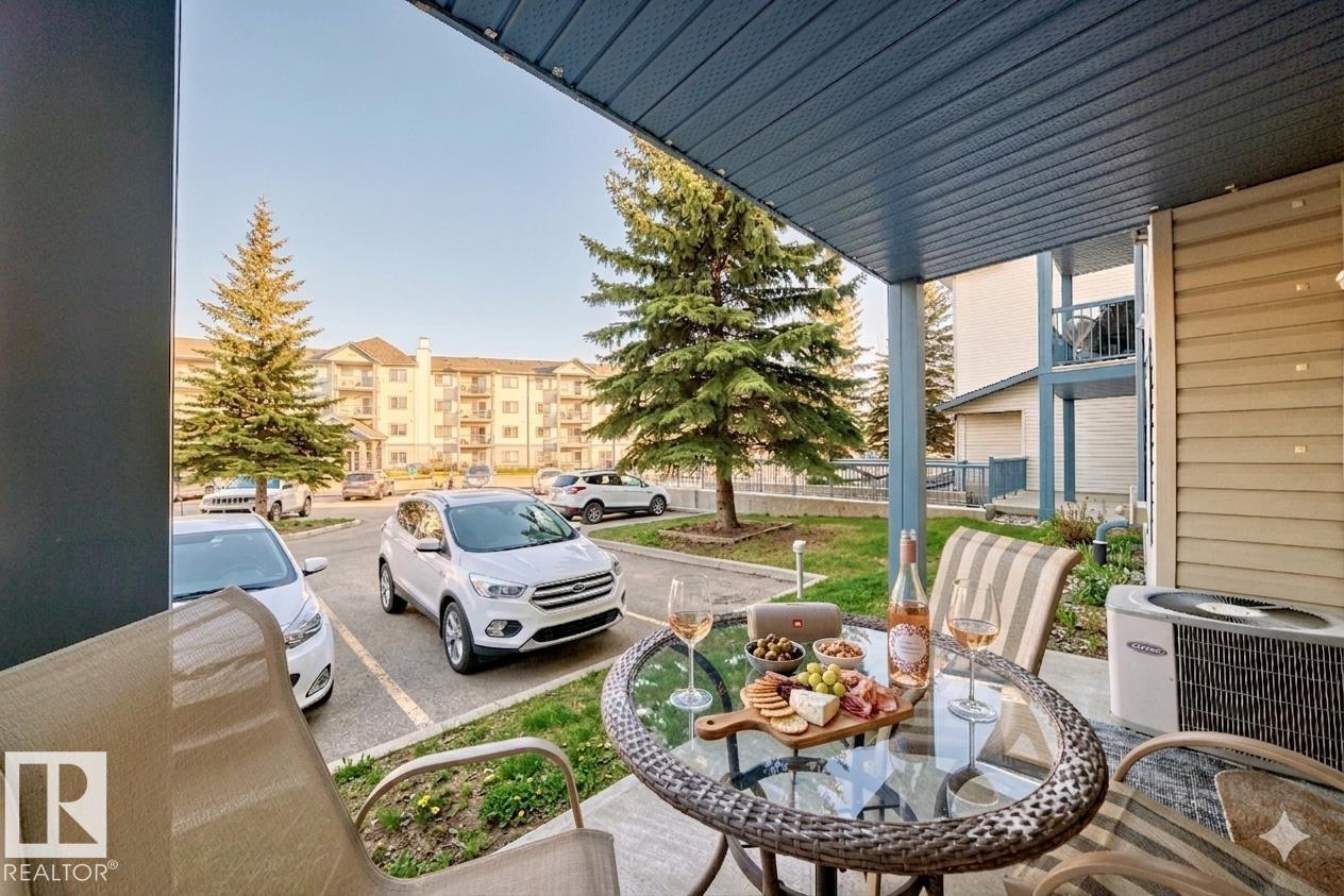 Welcome to this beautifully maintained main floor unit offering over 1000 sq ft of thoughtfully designed living space. Featuring bedrooms and 2 full bathrooms, including an ensuite with a relaxing jacuzzi tub. This home showcases pride of ownership from the original owner. The interior has been professionally painted and features engineered hardwood flooring throughout, with ceramic tile in the entry and bathrooms. The kitchen is finished with quartz countertops, ceramic backsplash, and a moveable island with seating. Enjoy the cozy gas fireplace, in-suite laundry with oversized stackable washer/dryer, and air conditioning for year-round comfort. This home includes 2 TITLED PARKING spaces, a powered stall, plus an additional heated underground stall with storage. Building amenities include a gym, recreation room, library, guest suite, and outdoor gathering spaces. Ideally located near Namao shopping centre; grocery shopping, banks, transit, and quick access to the Anthony Henday and CFB Edmonton. (id:51989)