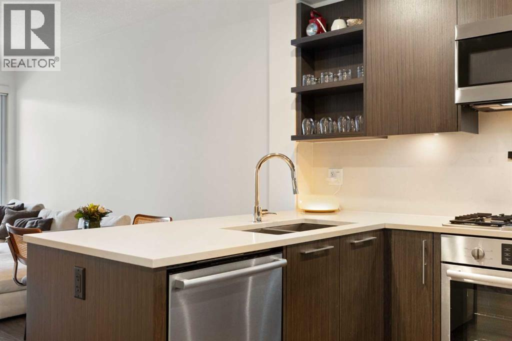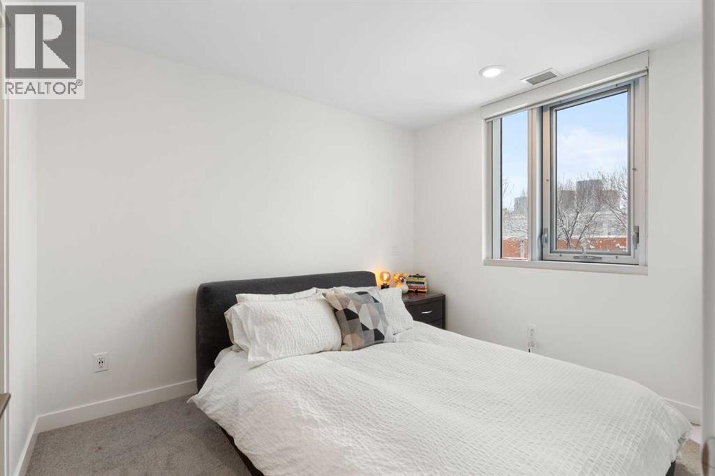 Welcome to Radius in Bridgeland, where modern design meets exceptional inner-city convenience. This bright 2-bedroom, 2-bathroom condo features a desirable west-facing exposure and is steps from green space, offering great natural light and a peaceful setting within the city.The open-concept living area is designed for both everyday comfort and entertaining, centred around a contemporary kitchen with quartz countertops, sleek cabinetry, a gas range, and a premium appliance package. The layout flows seamlessly into the dining and living areas, creating a welcoming and functional space.The primary bedroom includes a walk-through closet leading to a private ensuite with additional built-in storage. The second bedroom offers excellent flexibility, easily functioning as a comfortable guest bedroom, home office, or workspace depending on your needs. A generously sized in-suite laundry and storage room adds valuable convenience.This unit also includes secure underground parking and an additional storage locker for larger items.Residents enjoy an impressive selection of amenities, including concierge service, two fitness centres, spin studio, yoga studio, rooftop patio with city views, dog wash station, car wash bay, secure bike storage, and visitor parking.Located just steps from Bridgeland’s cafés, restaurants, shops, parks, dog parks, and the Bow River pathway system, with downtown only minutes away, this home offers the perfect blend of lifestyle, walkability, and urban convenience. (id:51989)