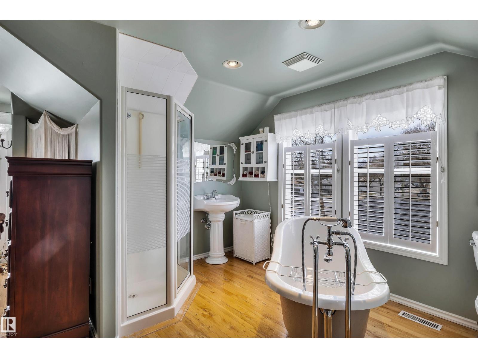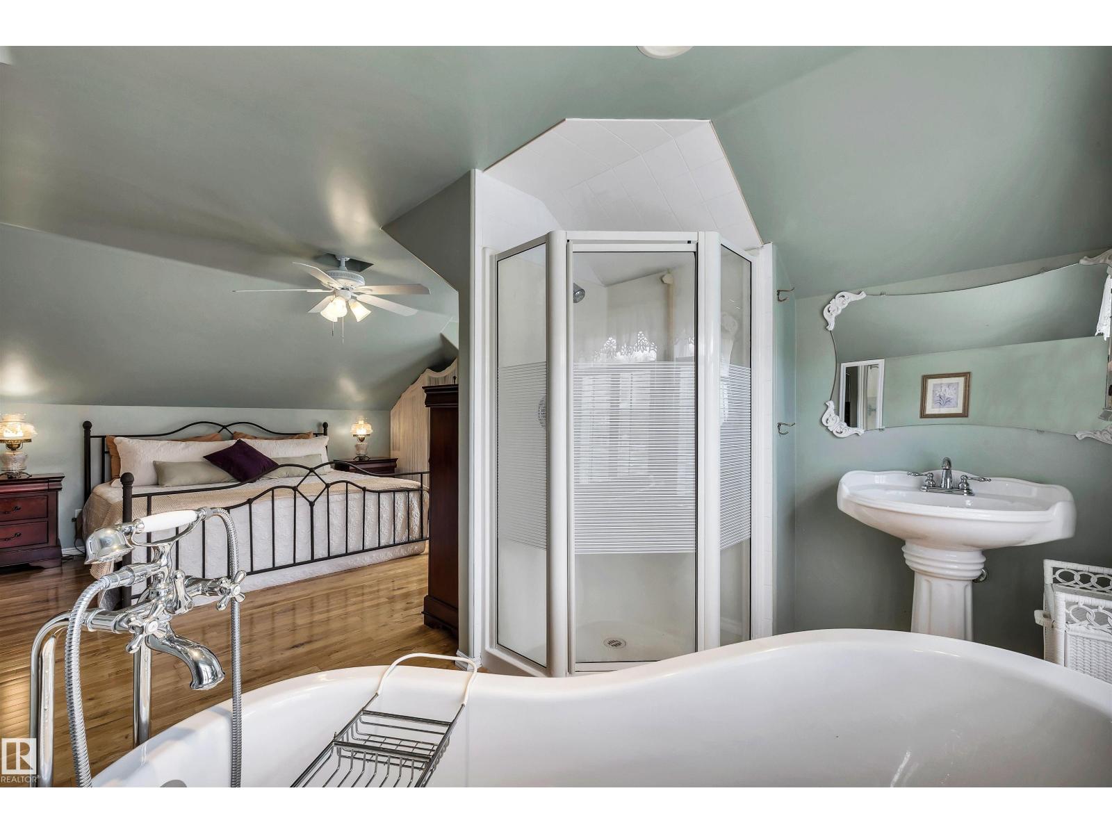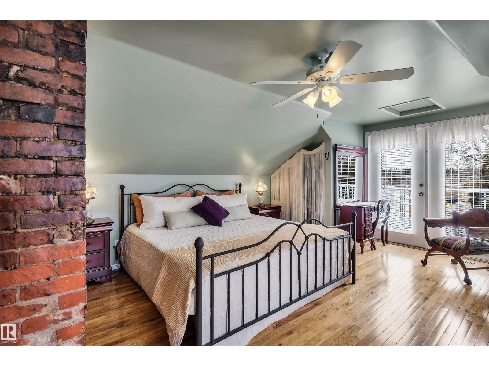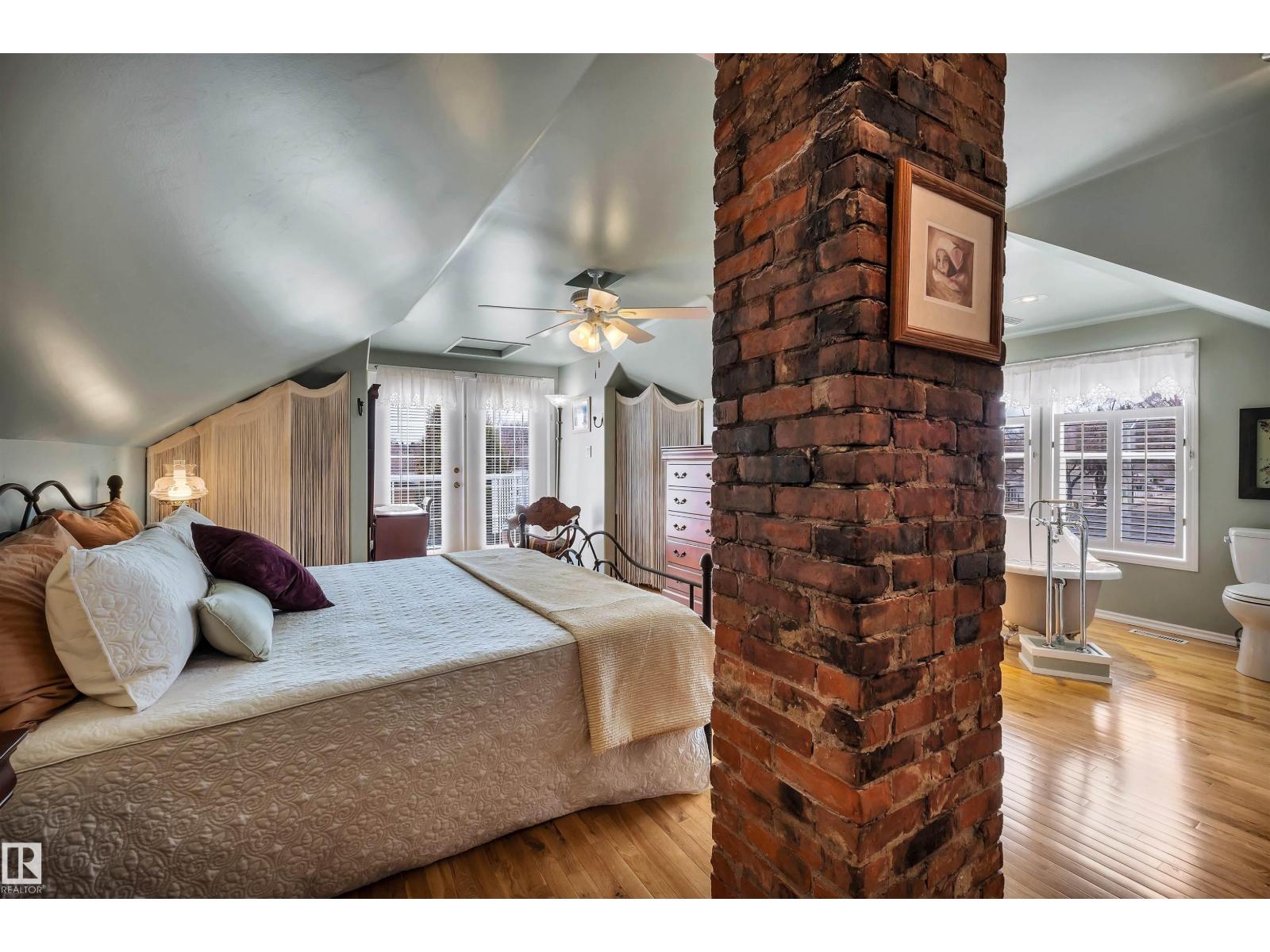One-of-a-kind historical home in the heart of St. Albert! Built in 1910 and meticulously restored, this house once belonged to Bertha Kennedy, and features gleaming hardwood floors and an open design on the main floor with archways and crown moulding. The modern white kitchen has stainless steel appliances, pantry and lots of counter space. Enjoy the spacious living room with gas fireplace, the original brick chimney in the center and formal dining room. An office and 2 pce bath complete the main floor. The entire upper floor is the primary suite, featuring hardwood floors, a 4 pce ensuite with claw foot tub and garden doors to a balcony. The basement is finished as a one bedroom in-law suite with 2nd kitchen, laundry facilities and storage. There is also a guest suite at the back with its own 3 pce bath, sleeping loft with rolling ladder and its own washer and dryer! A 3 season sunroom with wood stove is great for fall nights! Maintenance free decks at front and back. Central A/C. Newer furnace and HWT. (id:51989)