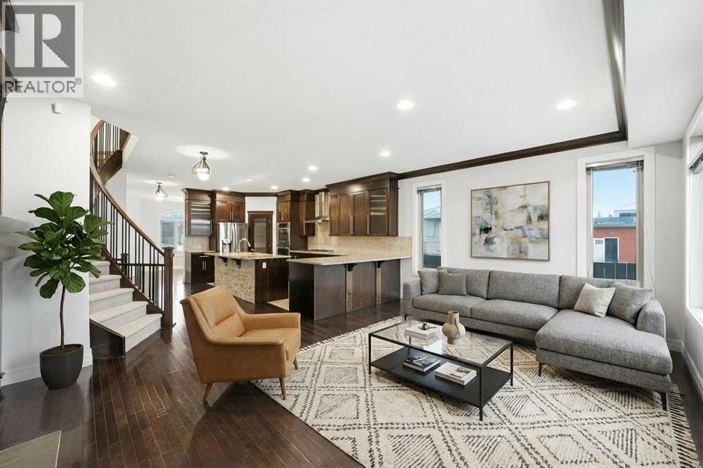 Welcome to this beautifully appointed 4-bedroom semi-detached home offering exceptional accessibility to downtown and nearby amenities in the sought-after community of Tuxedo Park. The main floor showcases an open-concept layout highlighted by a custom curved staircase, rich hardwood flooring, and 9-foot ceilings throughout.The open plan kitchen features full-height custom espresso-stained cabinetry, granite countertops, stainless steel appliances with a gas cooktop and wall oven, a central island, breakfast bar, and a walk-in pantry. Flowing seamlessly from the kitchen, the spacious great room is anchored by a cozy fireplace with custom built-in cabinetry on both sides—ideal for relaxing or entertaining. A dedicated dining room with ample space for a full-sized table is perfect for entertaining.Upstairs, the primary suite offers a luxurious retreat with a 5-piece ensuite, including a Jacuzzi tub, separate tiled shower, and a walk-in closet. Two additional generously sized bedrooms with large closets, an upper-floor laundry area, a 4-piece bathroom, and a skylight that fills the space with natural light complete the upper level.The professionally developed lower level adds valuable living space with a large recreation room and a fourth bedroom, and is roughed in for a third full bathroom. Additional features include central A/C, full-height custom cabinetry, built-in great room cabinets, a skylight above the staircase, gas line to BBQ, central vacuum rough-in, rear deck, window coverings throughout, and 9-foot main-floor ceilings. All of this is located just minutes from the city core.Available for quick possession, book your showing today! (id:51989)