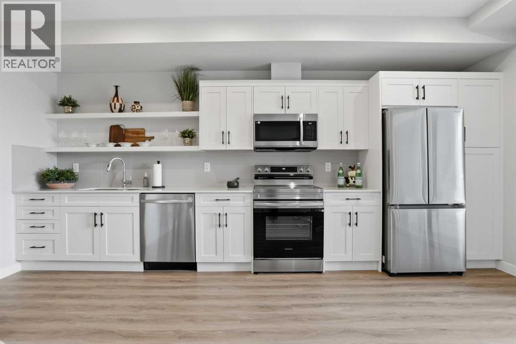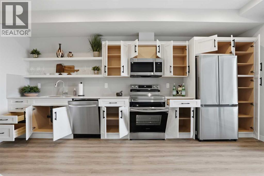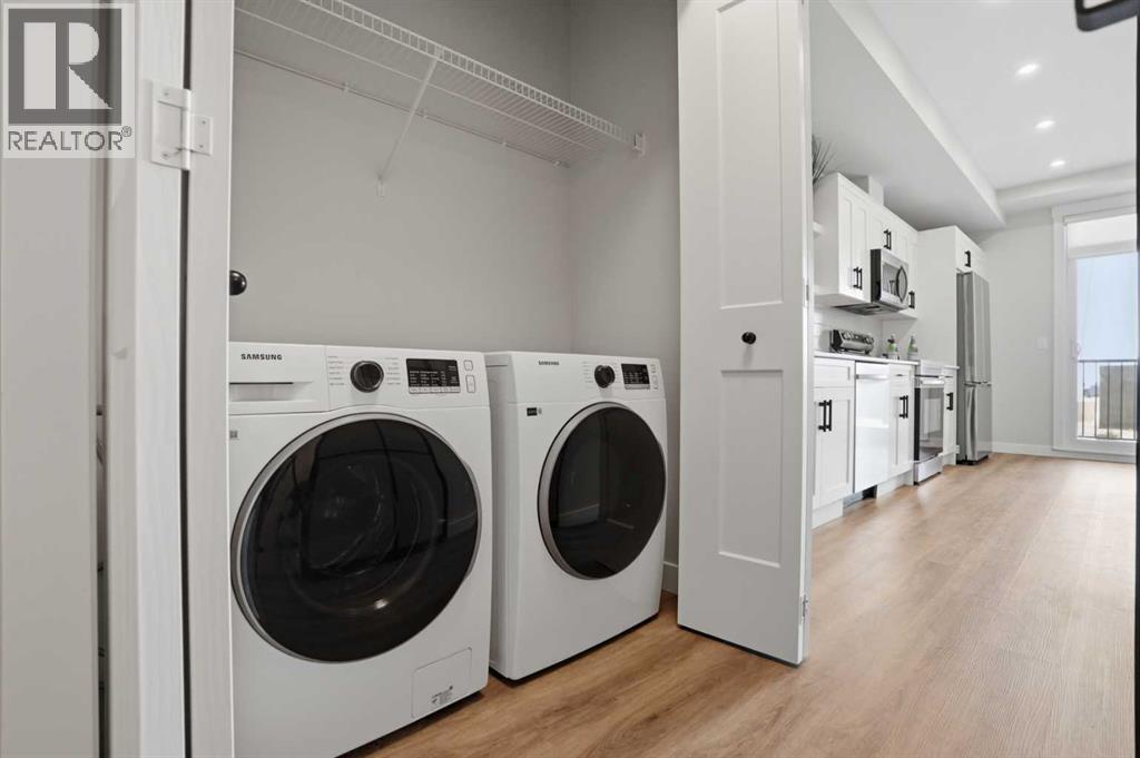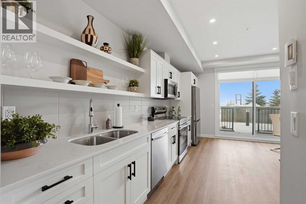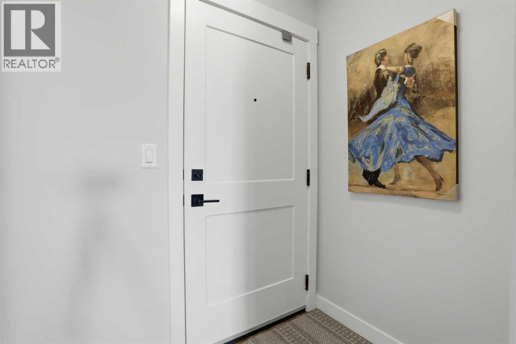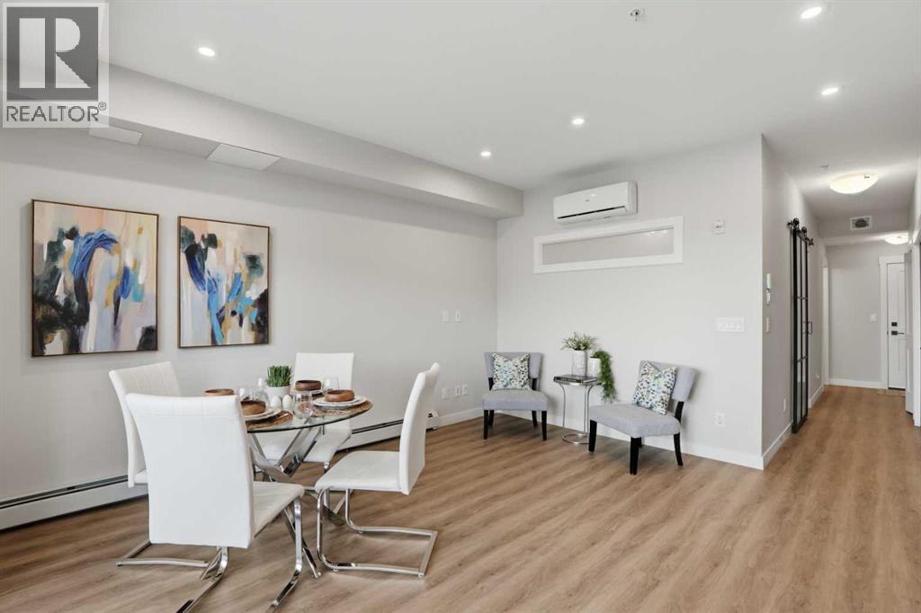 This is THE ONE! - 1 bed 1 bath on the 1st floor. | TOP 10 FEATURES: .1. 9' Ceilings .2. Dogs/Cats Allowed .3. Smart Vibrant Finishes & Design .4. Upgraded unit .5. A/C & Air Recirculation .6. 1 Titled Parking Stall (exterior) .7. Walk-Out to Grade/Courtyard .8. Quiet - Sound Attenuation .9. Convenient walk to Grocery, Restaurants, Shopping , Work, Transit, Greenspace .10. Life Simplified. | *****Welcome to Unit 1102 at 200 Seton Circle SE—a stylish upgraded 500 Sq Ft, 1 bedroom, 1 bathroom condo designed for simplicity, comfort, and connection. Perfectly positioned on the main floor, this home offers true walk-out living to a spacious courtyard, making it ideal for pet owners, retirees, or anyone who values easy access and low-maintenance living. Step inside and you’ll immediately notice the 9’ ceilings and the light, airy feel, enhanced by a smart, open-concept layout that maximizes both space and function.The large functional kitchen is a standout feature within the central living area, showcasing higher end cabinetry, quartz countertops, stainless steel appliances, and modern open shelving that adds both style and practicality. It grounds the the dining and living area, where large patio doors allow ample natural light and create a smooth transition to your personal outdoor patio and outdoor space. The oversized bedroom offers a calm and comfortable retreat, while the sleek 4-piece bathroom and convenient in-suite laundry complete the home.This upgraded unit also includes air conditioning and air recirculation for year-round comfort, along with Logel Homes’ Acoustic Shield system that enhances sound attenuation for a quieter living experience. You’ll also have a titled exterior parking stall, and the building is pet-friendly, allowing up to two pets with board approval. For dog owners, the lifestyle here is unmatched—simply walk out your door and head across the street to the off-leash park, or enjoy the enclosed dog run within the central courtyard.Located in the heart of Seton, you’re just steps from Market Street amenities including cafes, restaurants, grocery stores, fitness facilities, and more. The nearby South Health Campus, transit options, greenspaces and walking paths make this an incredibly convenient and connected place to live. Rentals are allowed (no short-term hotel style), making this a flexible option for both homeowners and investors.Whether you’re a retiree looking to right size, a working professional wanting a short commute, or a buyer seeking modern, low-maintenance living in a walkable community, this home delivers on every level. Life is simply easier here—book your private showing today and experience why this is THE ONE. (id:51989)