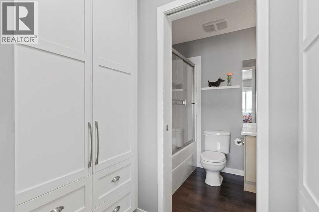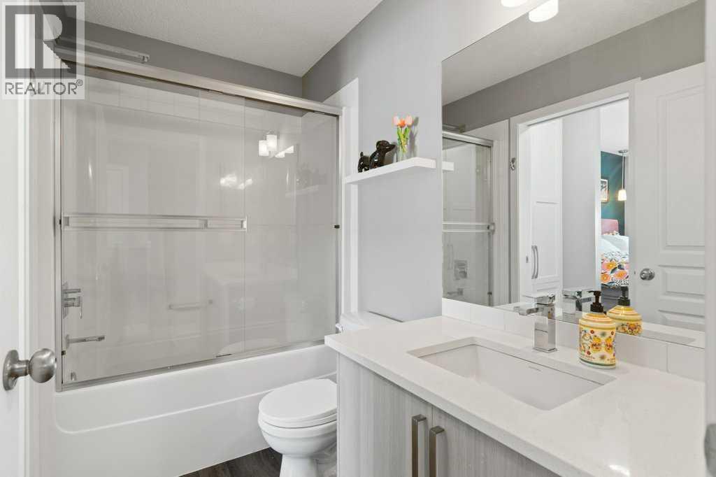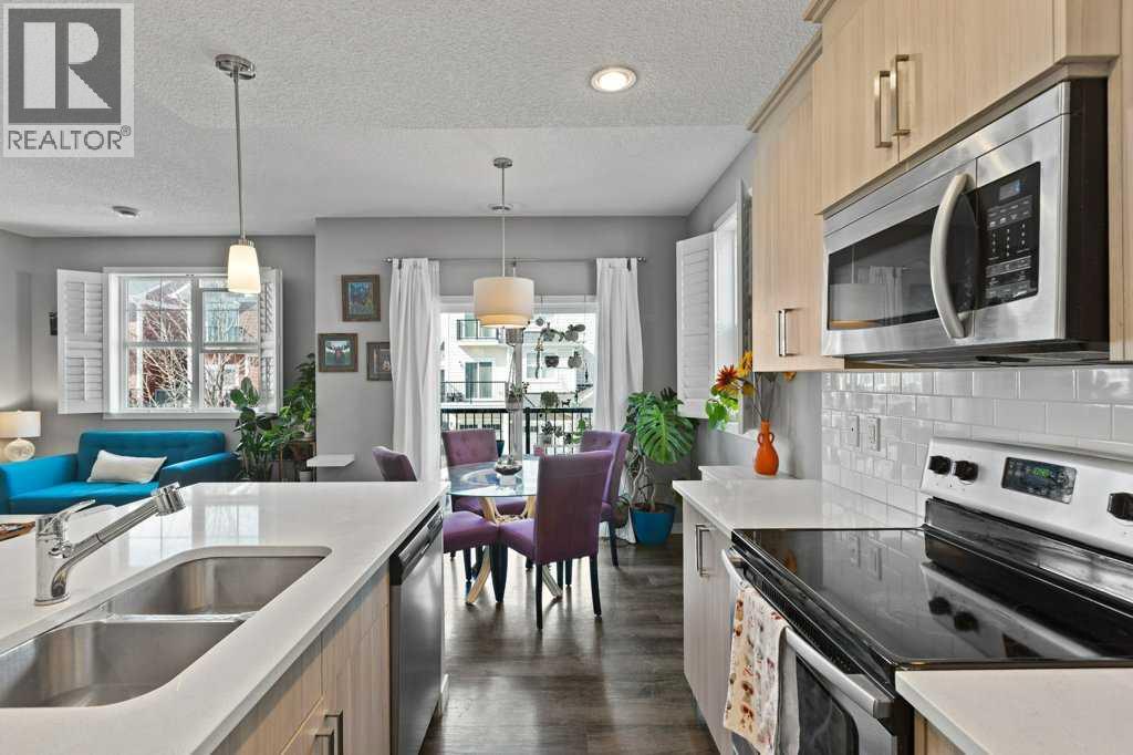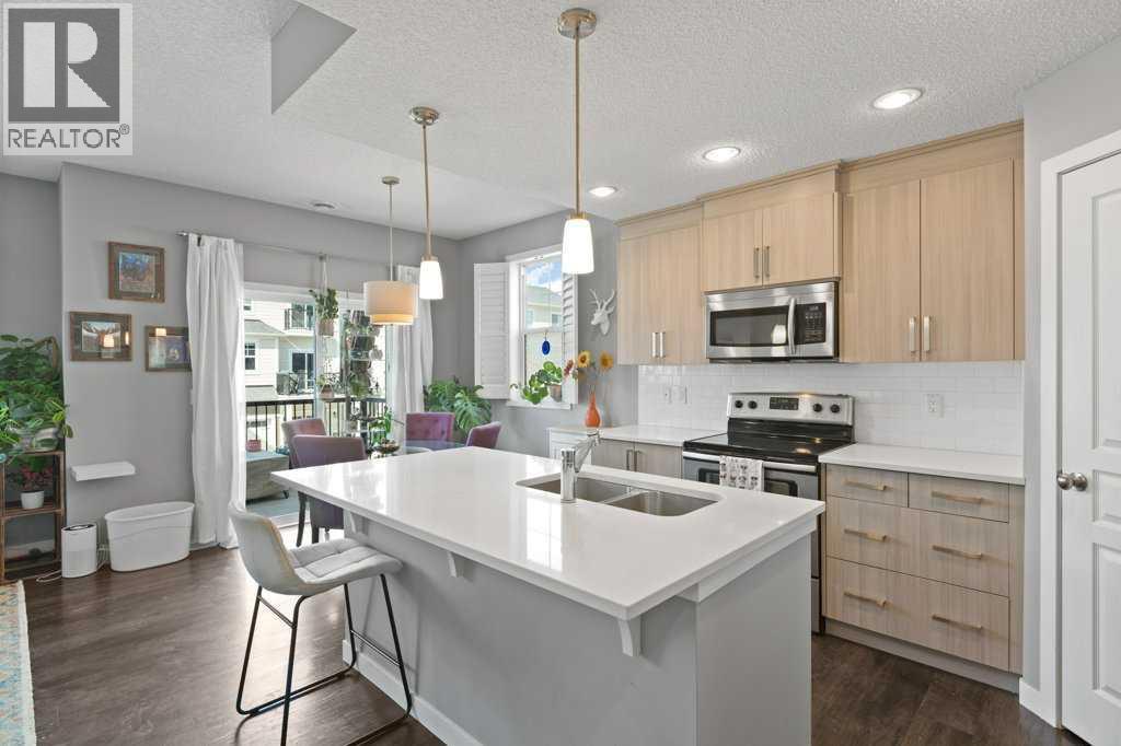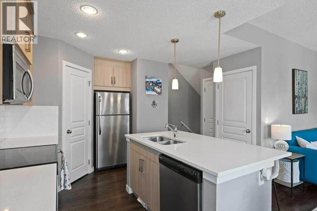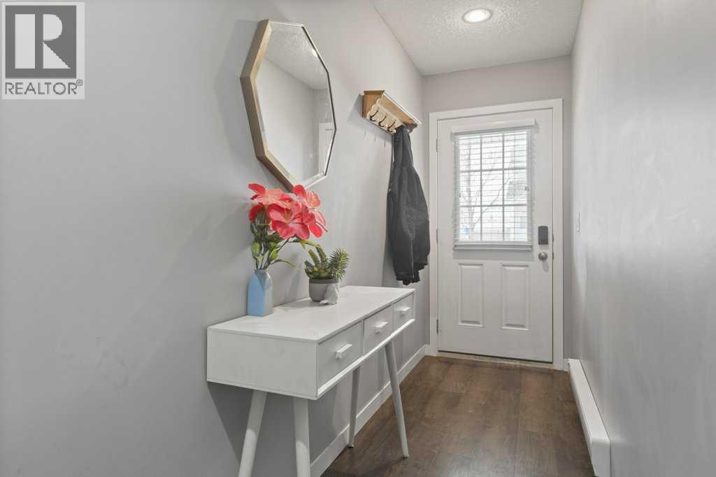This thoughtfully designed, pet friendly, end-unit townhome offers upgrades and features not always found in other units within the complex. You'll appreciate quartz countertops in the kitchen and 4-piece bathroom, a built-in central vacuum system with toe kicks at the kitchen island and upper bathroom, custom walk-through closet built-ins and a garage that can accommodate a small truck. Upon entry, you’re welcomed by a functional foyer with access to the single attached garage. Upstairs, the open-concept kitchen, dining, and living area is filled with natural light from the southwest-facing windows and features vinyl plank flooring throughout. The kitchen is finished with trendy cabinetry, stainless steel appliances and a spacious corner pantry. The dining area sits beside the balcony, making it perfect for both hosting and BBQing, while also benefiting from an extra window as one of the many perks of being an end unit. The bright and inviting living room is the perfect place to relax, especially for those who love houseplants and natural light. Both main floor windows are also enhanced with upgraded shutters. The second level is complete with a convenient stacked laundry area and a 2-piece bathroom. On the upper floor, you’ll find a spacious primary bedroom featuring a Juliette balcony, bedside pendant lighting, and a walk-through closet with high-end built-in cabinetry leading to the 4-piece bathroom. The bathroom includes a tub with a glass sliding panel, a rain-head style shower attachment, and an additional central vacuum toe kick at the vanity. The second bedroom is also generously sized and offers a large closet. This well-managed complex is known for its excellent neighbours and strong sense of community. Whether you’re looking for a place where your kids can enjoy the complex bike rides or somewhere peaceful to unwind, this home offers both. Residents can also enjoy the recently updated landscaping throughout the complex. Ideally situated close to every am enity you could need, including Costco, Walmart, parks, walking paths, and with easy access to major roadways throughout the city. Check out the 3D Virtual Tour and book your showing today! (id:51989)