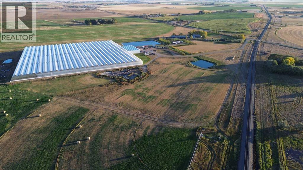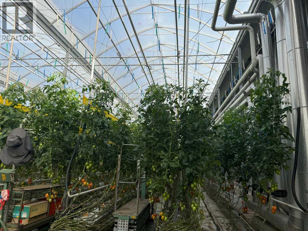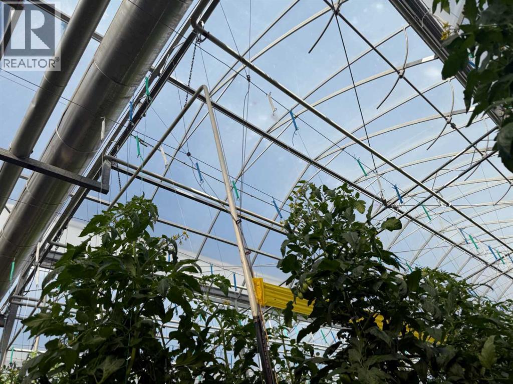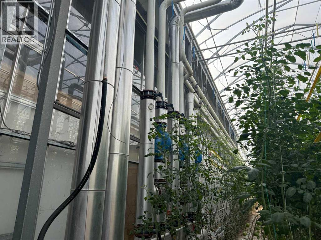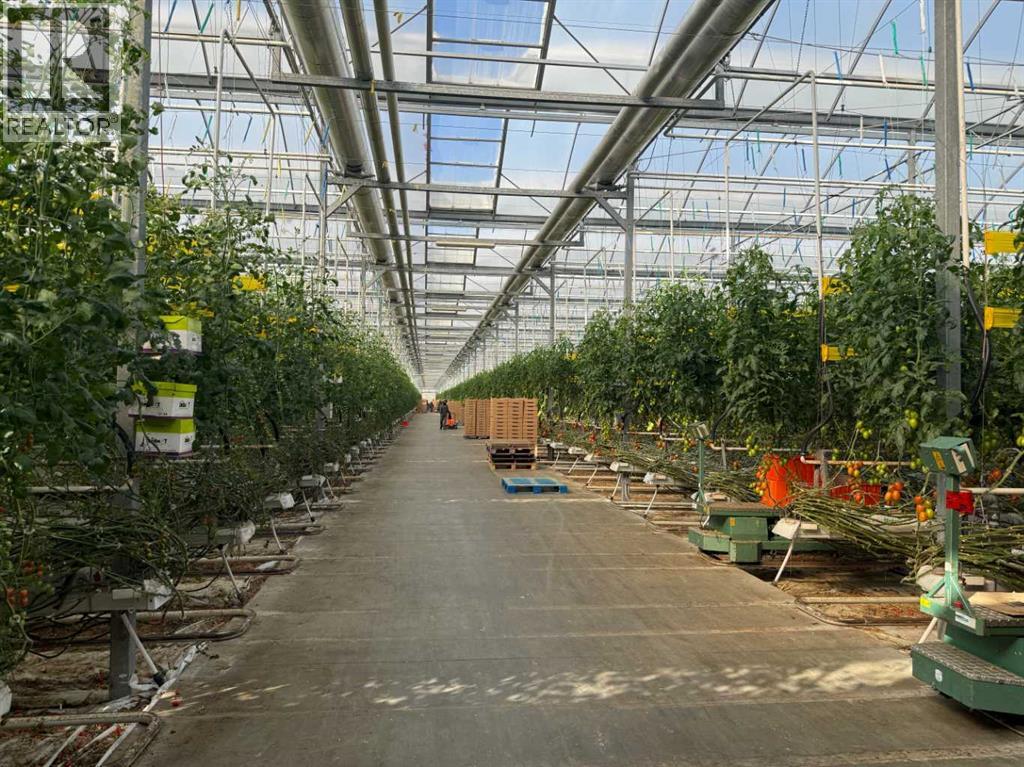 Modern 10-Acre Greenhouse Facility on 93 Irrigated Acres – Near Medicine Hat, Alberta. Outstanding opportunity to acquire a modern, large-scale greenhouse operation located just 15km from Medicine Hat. This 93-acre irrigated property is zoned Horticulture, offering significant room for expansion and future development. The centerpiece of the property is a state-of-the-art 10-acre (419,328 sq. ft.) Venlo-style poly greenhouse featuring 26 bays (24’ x 672’ x 21’ gutter height) designed for efficient, high-output production. The operation is supported by an 84’ x 170’ Venlo shop that houses the boiler and irrigation rooms (separated by glass walls) and includes a fully air-conditioned office, accessible washrooms, lunchroom, and mezzanine—all built to commercial code standards. A 17’ x 11’ walk-in cooler provides additional storage capacity. The water management system is designed for sustainability and efficiency. Rainwater is collected from the greenhouse roof and directed to a 5,000,000-gallon dugout, which is replenished via the SMRID system during summer months to ensure ample supply through the winter. Heating is provided by two 800 HP Crone boilers with Zantingh burners, distributing heat through an integrated pipe and rail system that doubles as transport for electric and hand carts. Key operational highlights include:-CO2 capture system improving plant growth and heat efficiency-Central inflation system for optimal insulation-Argus Titan climate and irrigation control software with 24-hour support-Backup diesel generator with automatic switchover-Fog cooling system for summer operation-Two 41,000-gallon water silos (fresh and recirculated) with advanced filtration-Electric, hand, and maintenance carts included. The property also features a modern Valley pivot with pumping unit irrigating approximately 40 acres of hayland, and a wheel line with PTO pump servicing an additional 10 acres. A 2007 mobile home (20’ x 76’, 1,520 sq. ft.) provides comfortable on-sit e accommodation with 3 bedrooms, 2 bathrooms, central air conditioning, and a 14’ x 24’ deck—ideal for staff housing or management use. Currently employing approximately 35 workers through the Foreign Worker Program, the operation packages its produce through Redhat Co-op in Redcliff, located just 22 km away. The property is easily accessible, with a paved road within 800 meters of the entrance. This well-maintained and fully equipped facility represents a rare opportunity to acquire a turnkey commercial horticultural enterprise with modern infrastructure, expansion potential, and excellent logistics in a prime Southern Alberta location. (id:51989)