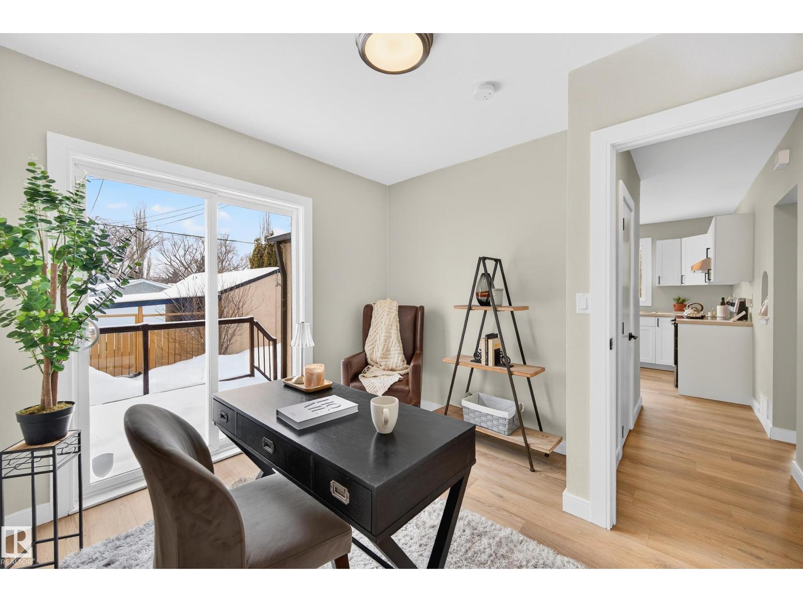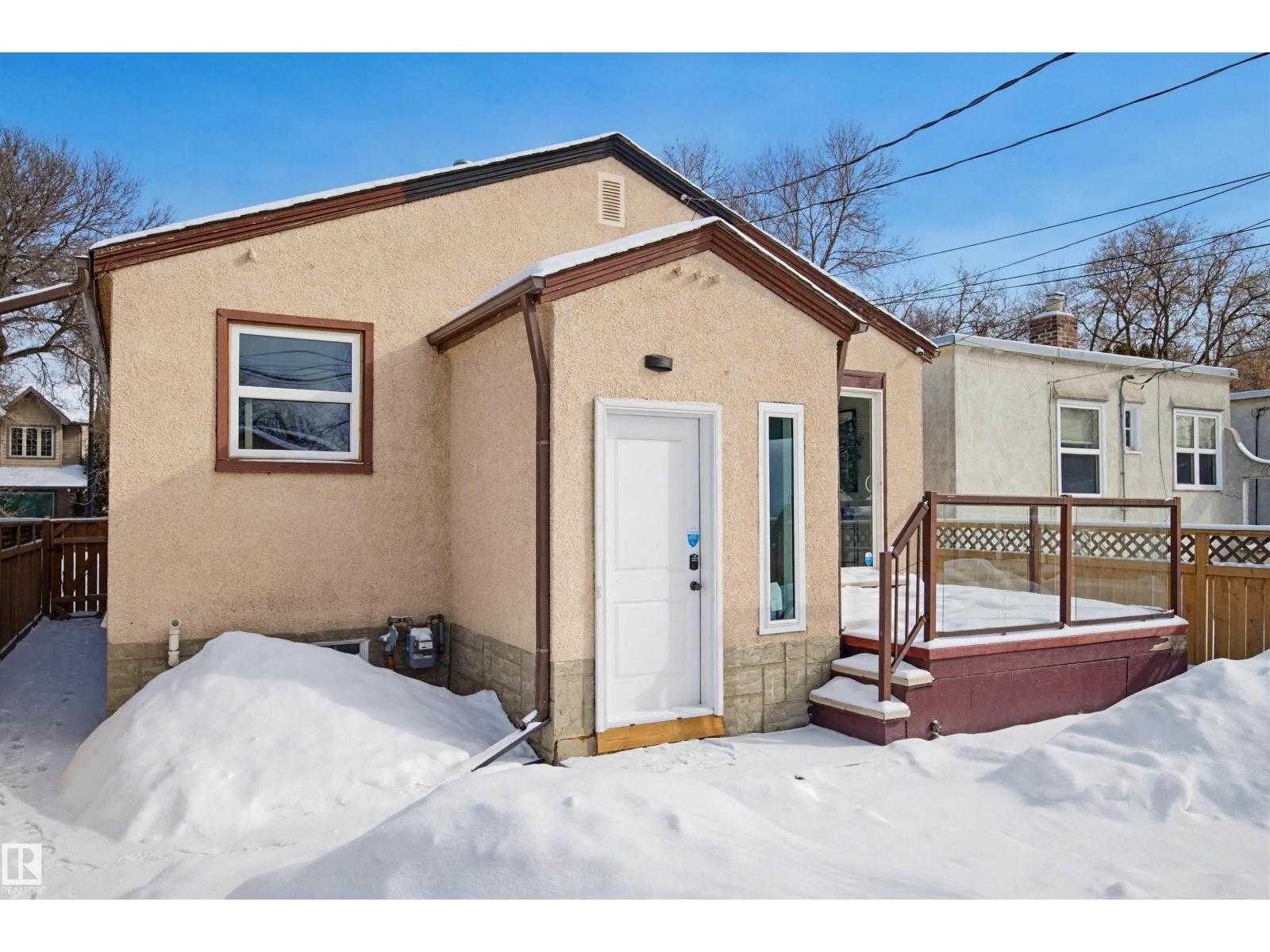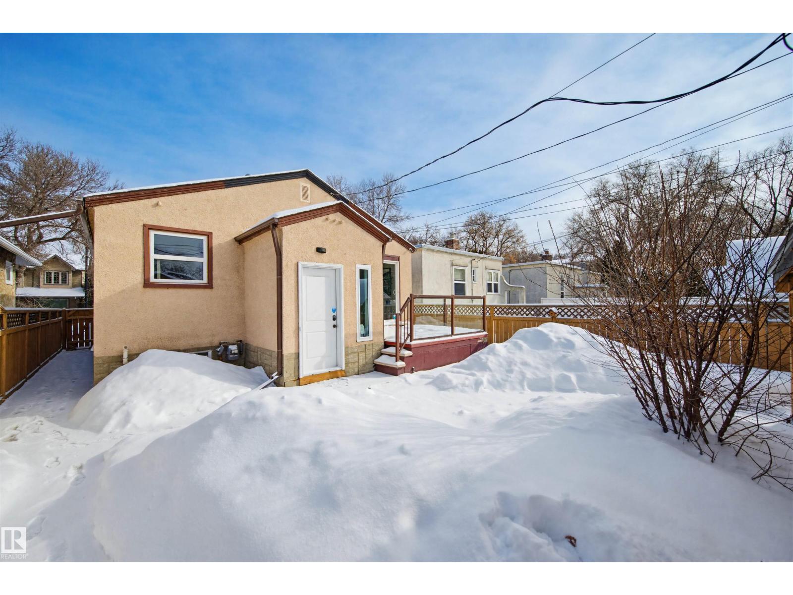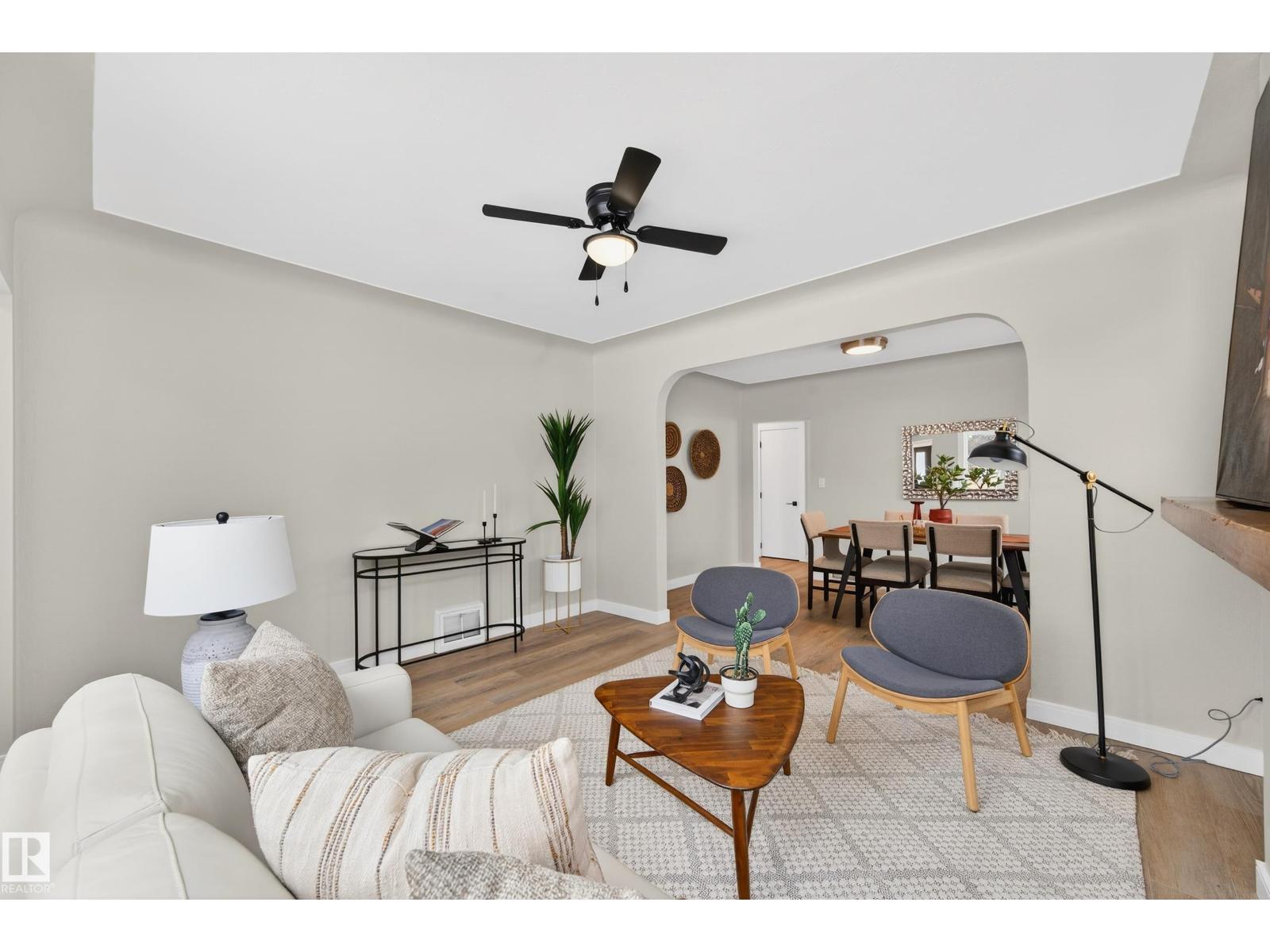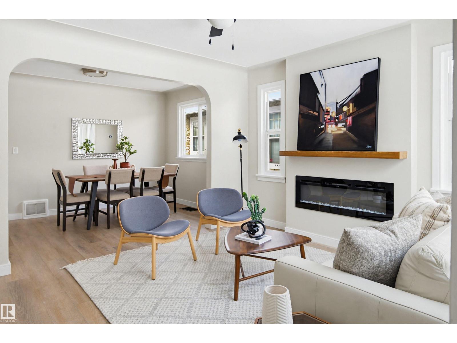 Beautifully renovated bungalow in Bellevue, perfectly positioned near the Highlands district and River Valley. This move-in ready home offers 3 bedrooms, 2 bathrooms, and 941 sqft above grade plus a fully finished basement with separate entrance and excellent suite potential. The main floor features large windows that fill the home with natural light, new vinyl plank flooring, a bright modern kitchen, dedicated dining area, and a cozy electric fireplace in the living room. Two bedrooms and an updated bathroom complete the main level, with patio doors from the second bedroom leading to the west-facing backyard - perfect for a home office or flex space. The basement includes a living room, bedroom, full bathroom, and a small office or yoga room. Major upgrades include windows, electrical, furnace (2021), hot water tank (2020), and shingles (2015). Located just minutes from the River Valley, Ada Boulevard, Highlands Golf Club, Concordia University, parks, cafés, and downtown. (id:51989)