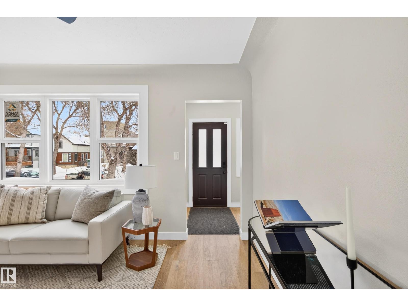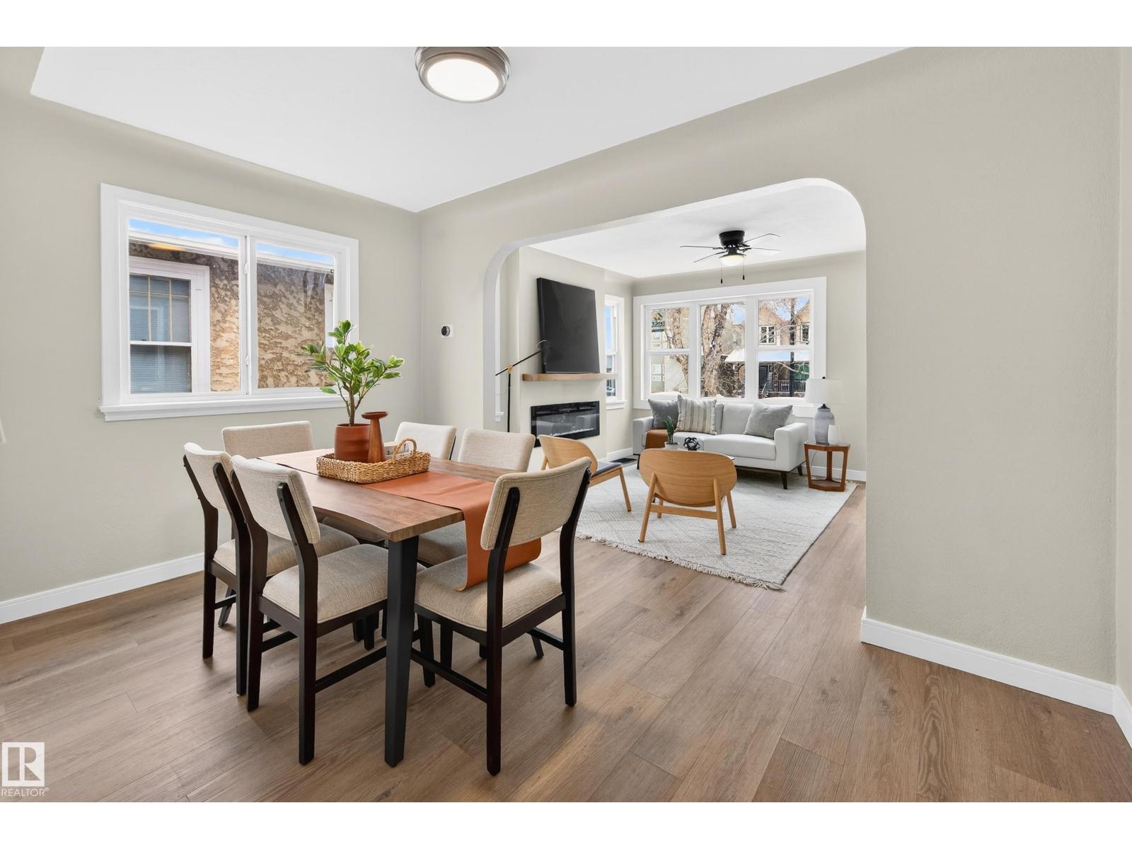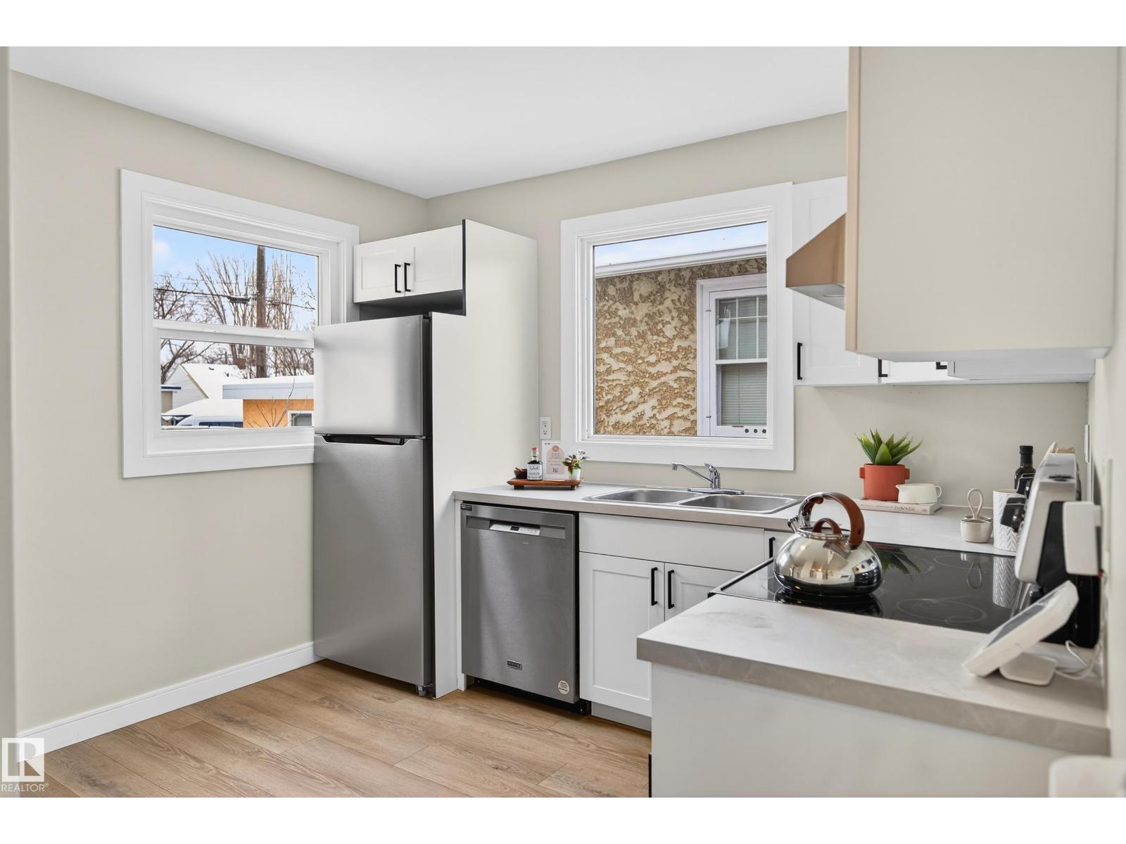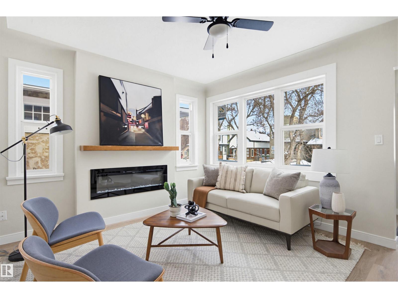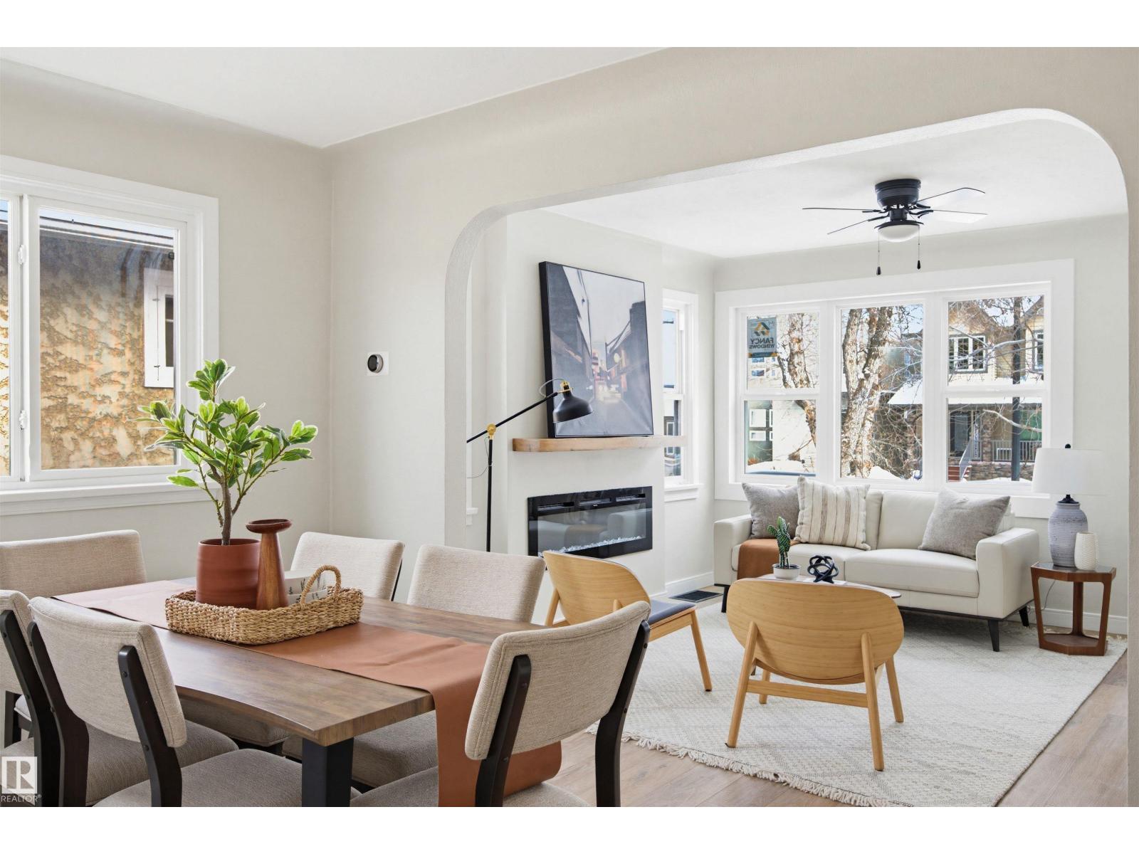 Beautifully renovated bungalow in Bellevue, perfectly positioned near the Highlands district and River Valley. This move-in ready home offers 3 bedrooms, 2 bathrooms, and 941 sqft above grade plus a fully finished basement with separate entrance and excellent suite potential. The main floor features large windows that fill the home with natural light, new vinyl plank flooring, a bright modern kitchen, dedicated dining area, and a cozy electric fireplace in the living room. Two bedrooms and an updated bathroom complete the main level, with patio doors from the second bedroom leading to the west-facing backyard - perfect for a home office or flex space. The basement includes a living room, bedroom, full bathroom, and a small office or yoga room. Major upgrades include windows, electrical, furnace (2021), hot water tank (2020), and shingles (2015). Located just minutes from the River Valley, Ada Boulevard, Highlands Golf Club, Concordia University, parks, cafés, and downtown. (id:51989)