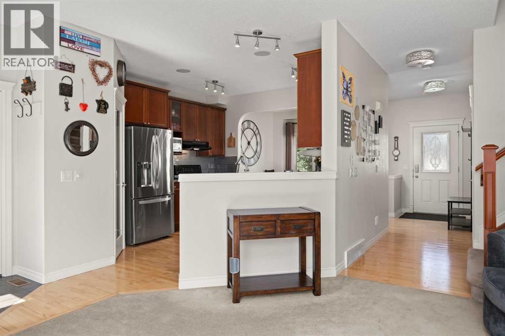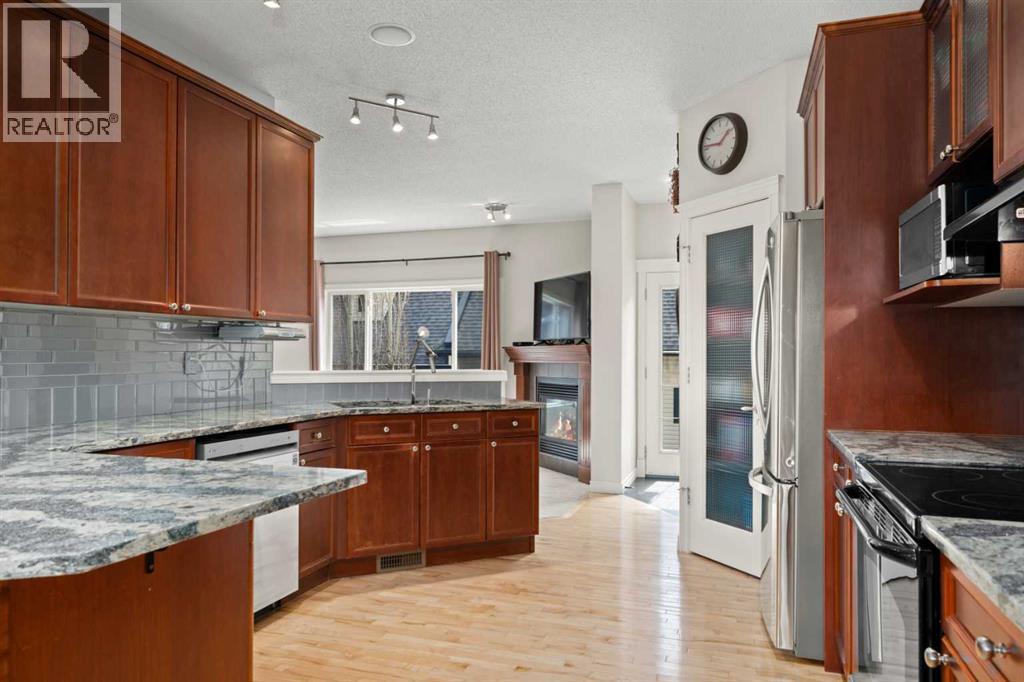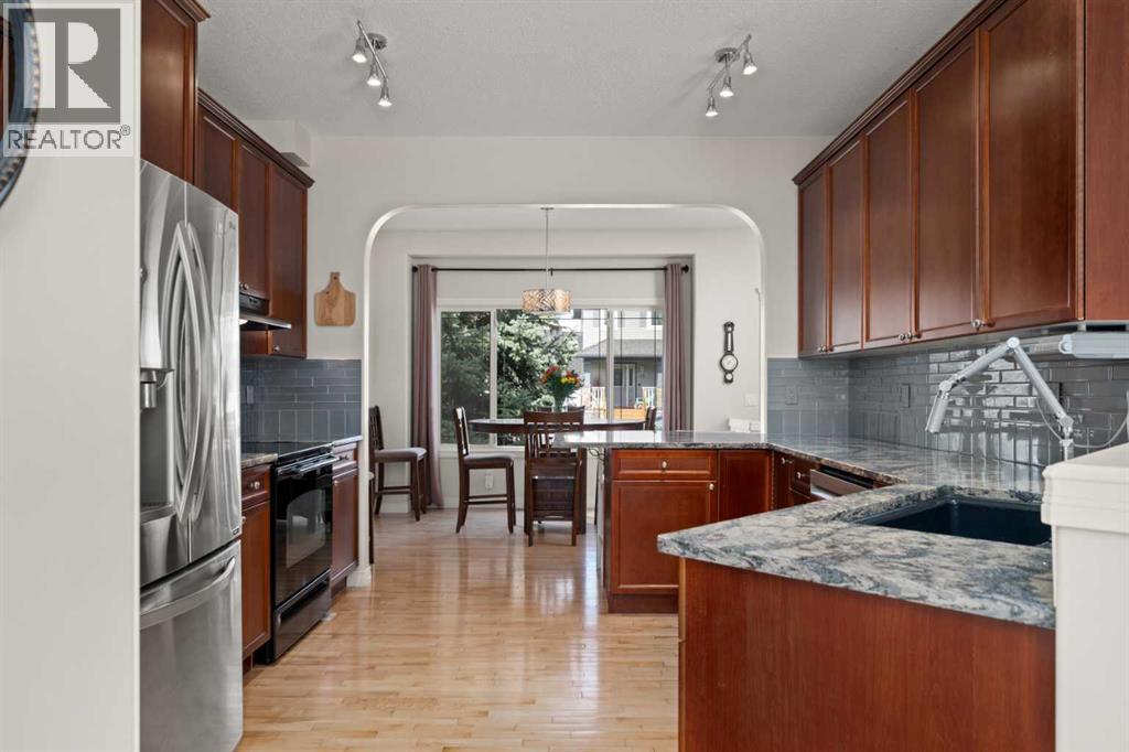 Welcome to this well-cared-for home tucked into a quiet cul-de-sac in the desirable community of Drake Landing. As you arrive at the home you will love the charming front porch that offers a welcoming first impression and a comfortable place to relax outdoors.Inside, the main floor features hardwood flooring through most of the main level and a practical, open layout. The front dining area is bright and spacious, overlooking the front yard—ideal for both everyday living and entertaining. The kitchen is thoughtfully designed with granite countertops, extended-height cabinetry, glass tile backsplash, a large pantry, and an eating bar, along with plenty of prep and storage space.The living room is generously sized and features a corner fireplace, creating a comfortable gathering space with views of the south-facing backyard. A 2-piece bathroom and main floor laundry with tile flooring and granite counters complete this level. Upstairs, you’ll find three good-sized bedrooms. The primary suite offers a walk-in closet and a 3-piece ensuite with an oversized shower and granite vanity. The two additional bedrooms are connected by a 4-piece Jack and Jill bathroom, finished with tile flooring and granite countertops.The fully developed basement expands the living space with a large family room featuring laminate flooring and lots of natural light, along with a 3-piece bathroom complete with an oversized shower. There is additional storage too!Notable updates include a furnace replaced in 2025, a newer hot water tank, and this home benefits from a water softener.The large south-facing deck, and backyard provides excellent outdoor living and play space. Great for entertaining and family get togethers!The property is finished with a 22’ x 22’ double detached garage and an additional carport, offering plenty of parking options.An excellent opportunity to own a move-in ready home in a family-friendly neighbourhood close to parks, schools, and amenities. Don't miss out, view 3D/Multimedia/Virtual tour, (id:51989)