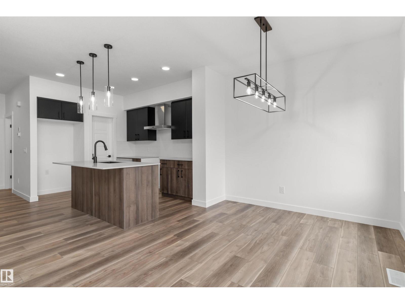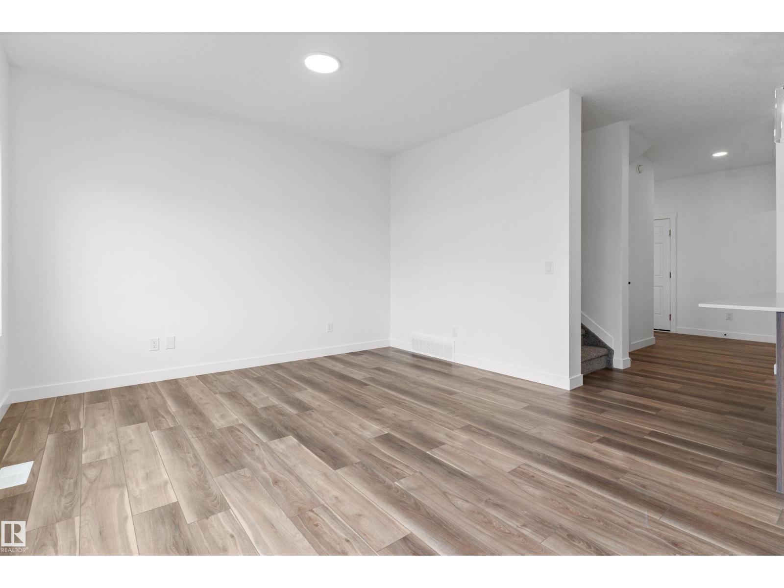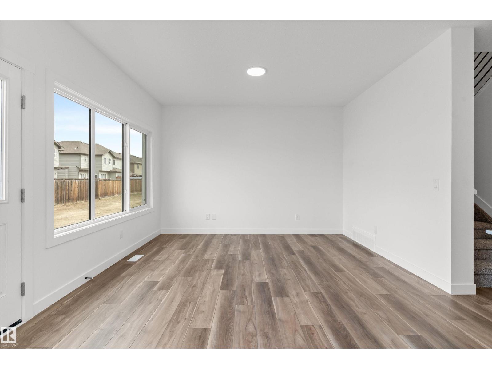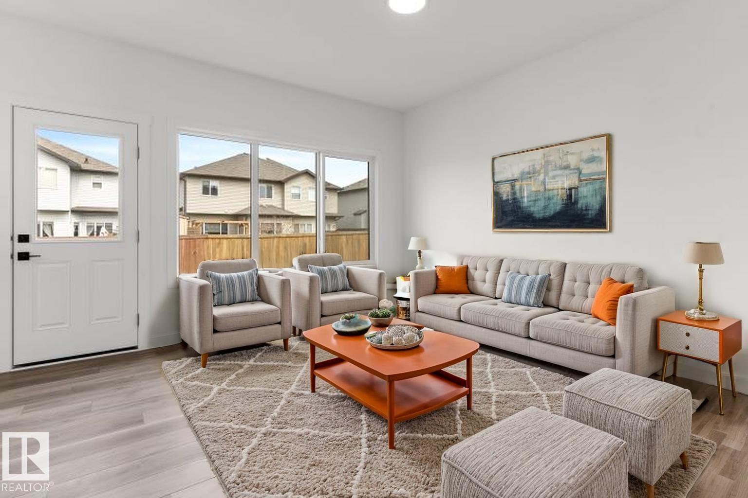 Built by Sterling Homes, this bright duplex in SouthCreek blends modern comfort with the peaceful, open feel that draws people to Stony Plain. Triple pane windows and 9’ ceilings create an airy main floor, while warm luxury vinyl plank flooring unifies the living spaces. The front foyer flows into a welcoming great room centered around an electric fireplace—perfect for cozy evenings. The kitchen is thoughtfully designed with quartz countertops, upgraded cabinetry, a corner pantry, chimney hood fan, and a large island that naturally becomes the heart of gatherings. Expansive rear windows and a patio door fill the home with natural light and overlook the future deck and backyard. Upstairs, a versatile bonus room adds flexibility, while the primary suite features a walk-in closet and private ensuite. Two additional bedrooms, a full bath, upper laundry, double attached garage with drain, side entrance, and basement rough-ins complete this well-rounded home. (id:51989)