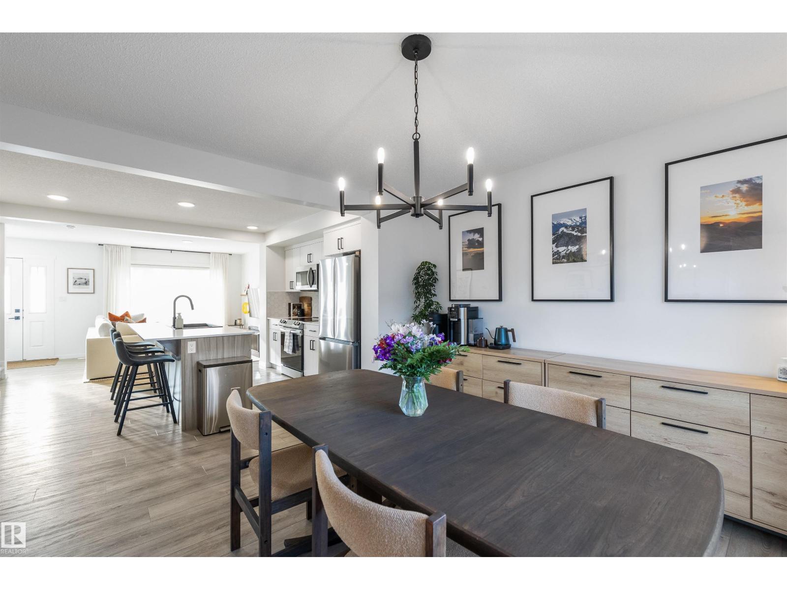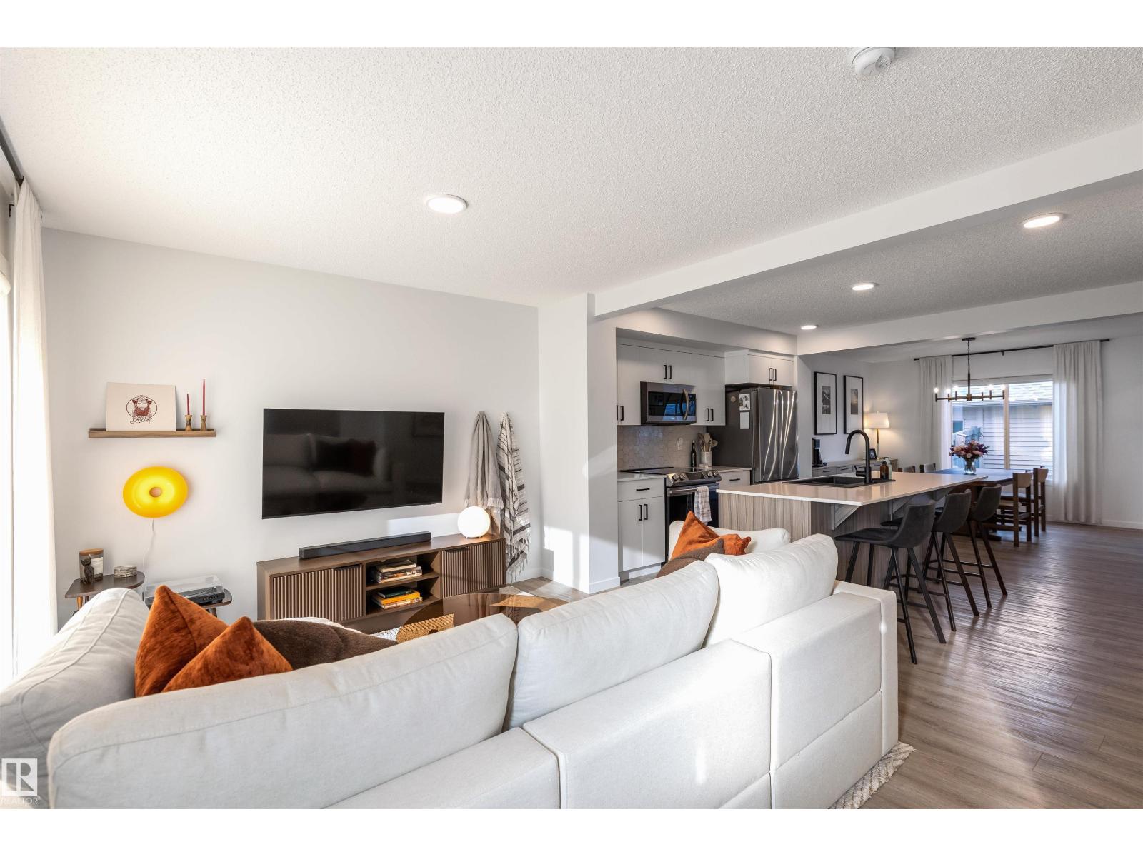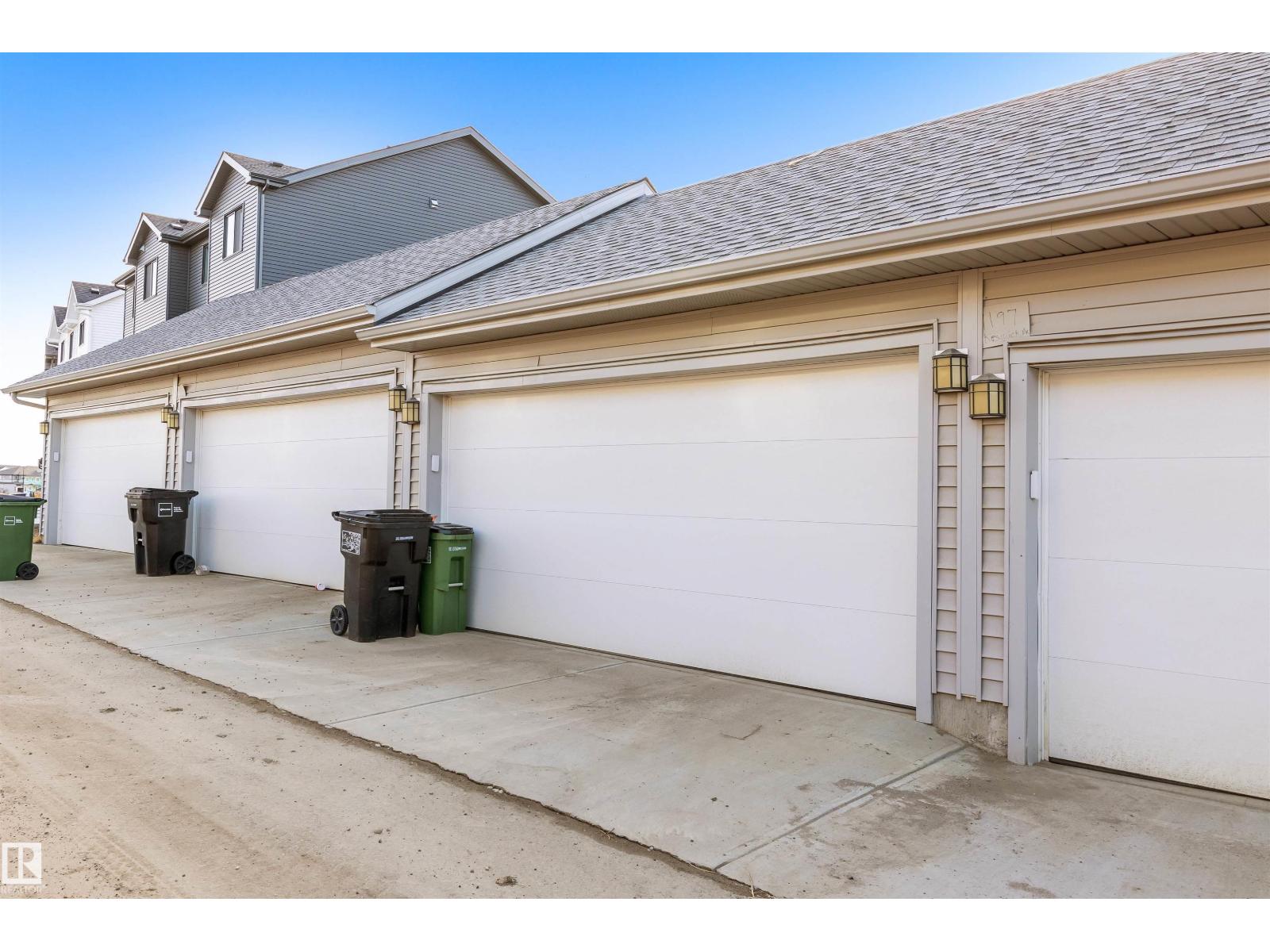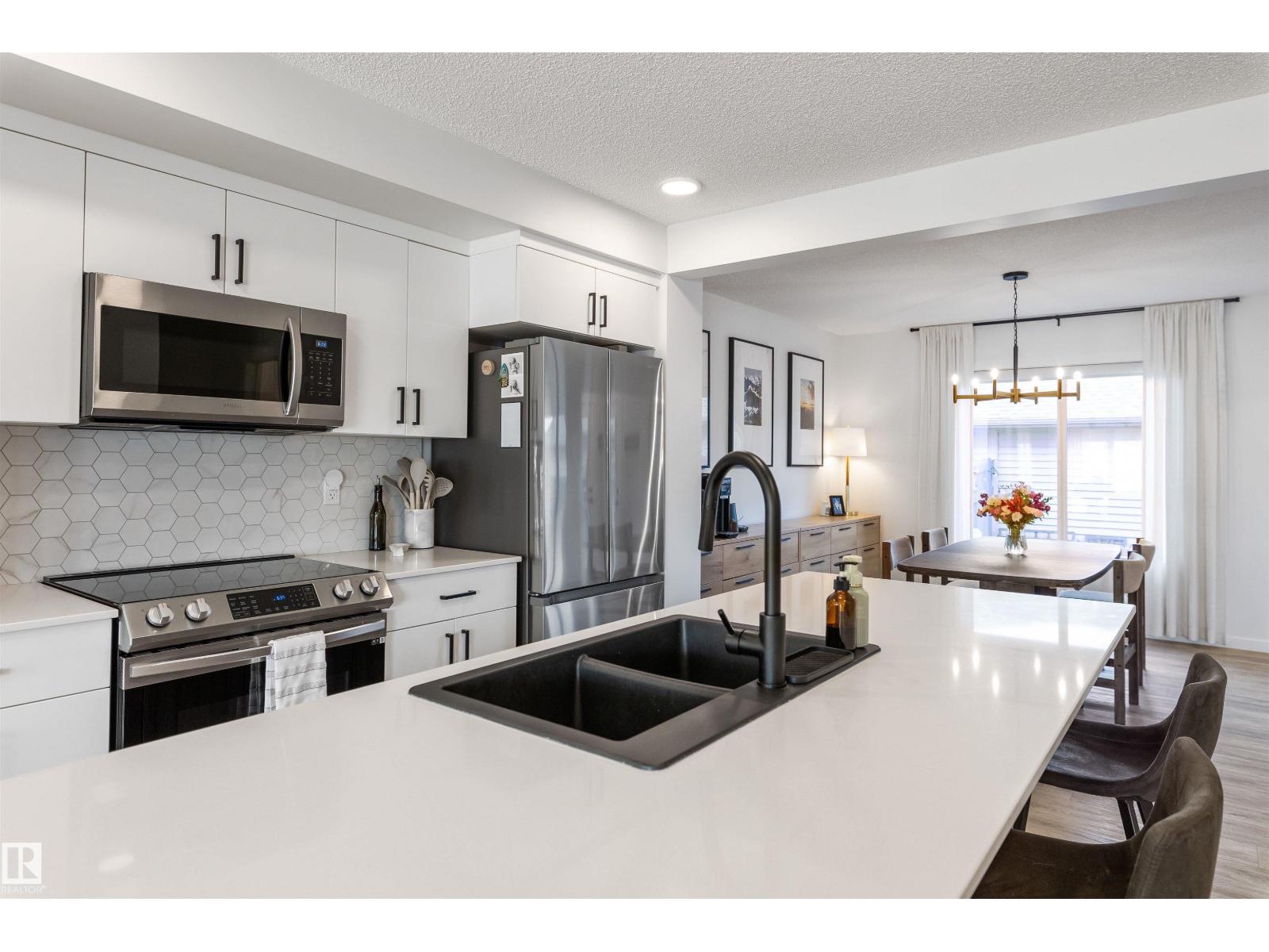 Step inside this beautiful home by StreetSide Developments and enjoy the seamless flow of the open-concept main floor, filled with natural sunlight from large windows throughout. The cozy front living room leads into a bright kitchen featuring ceiling-height white cabinetry, Samsung stainless steel appliances, quartz countertops, a large island with eat-up seating, and a black composite sink. The spacious dining area overlooks the fully landscaped backyard, complete with a dog run. Upstairs offers stacked laundry, two generous bedrooms, a 4pc bath, and a primary retreat with a walk-in closet and 4pc ensuite. The unfinished basement is ready for your personal touch. BONUS features include a double detached heated garage (120V dedicated breaker), A/C, and NO CONDO FEES. Located steps from schools, parks, trails, and amenities—this home is move-in ready! (id:51989)