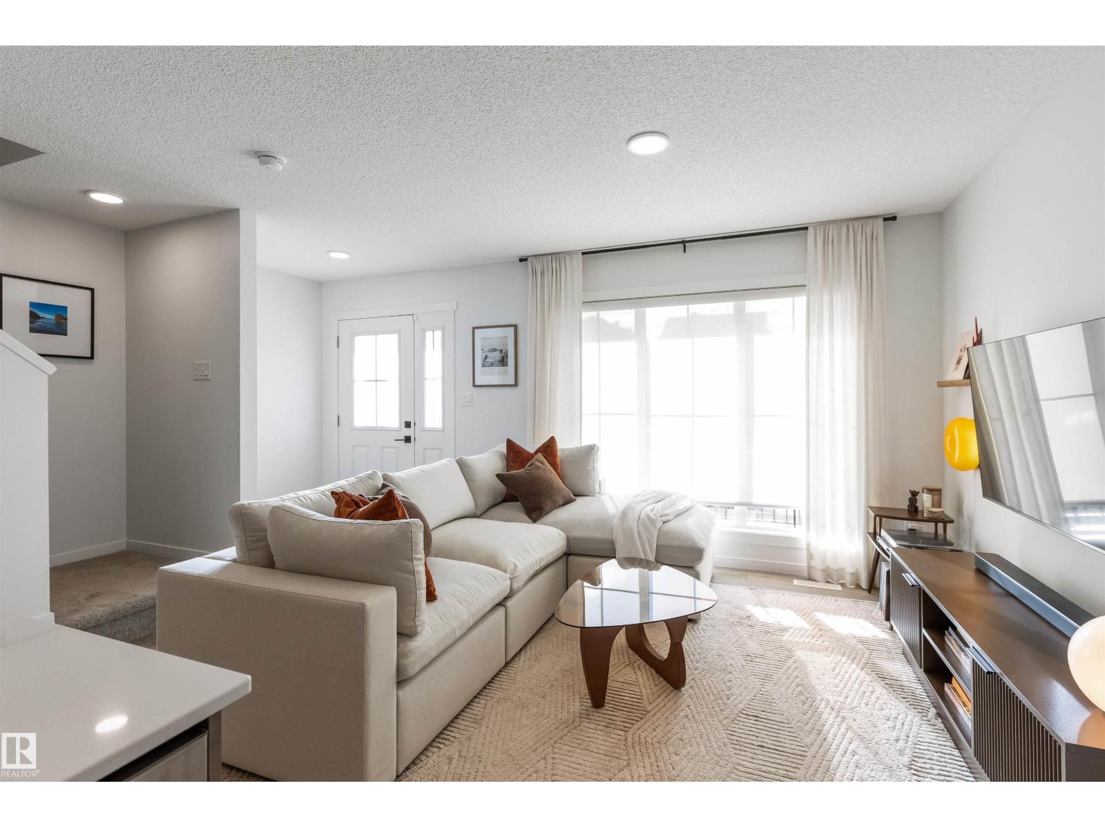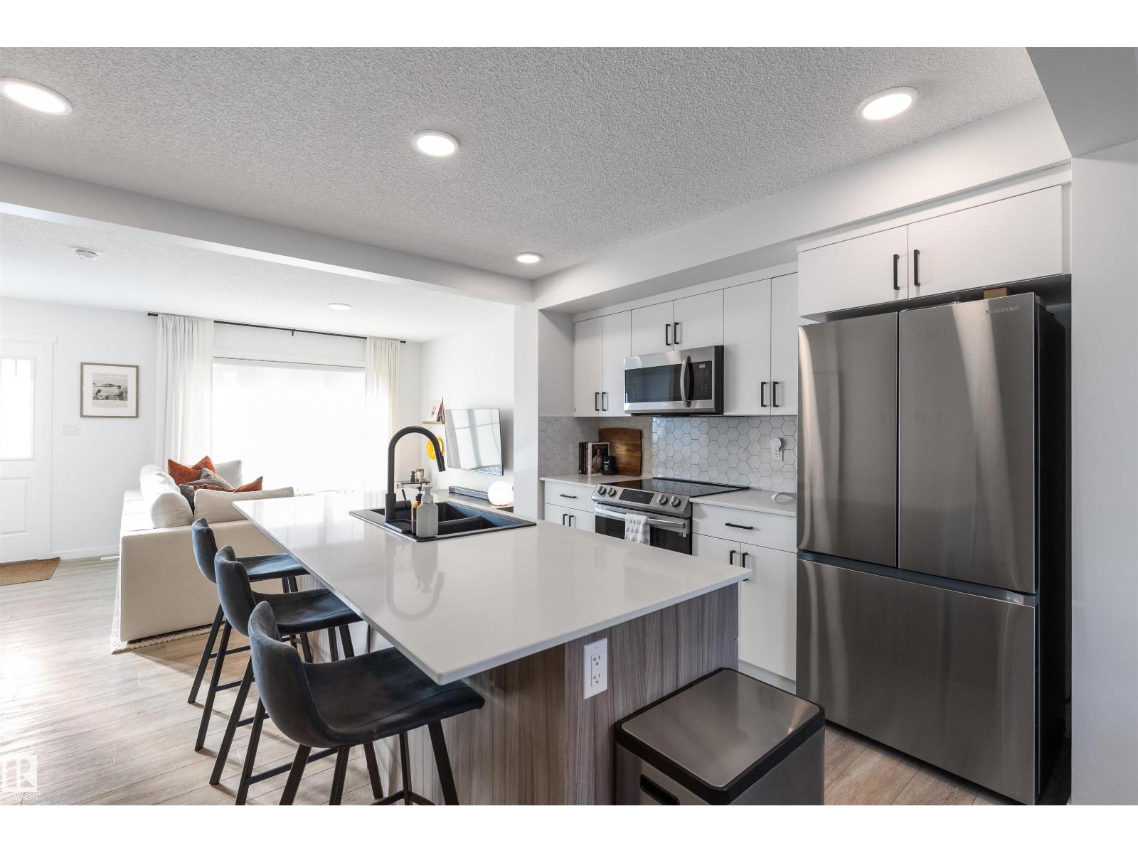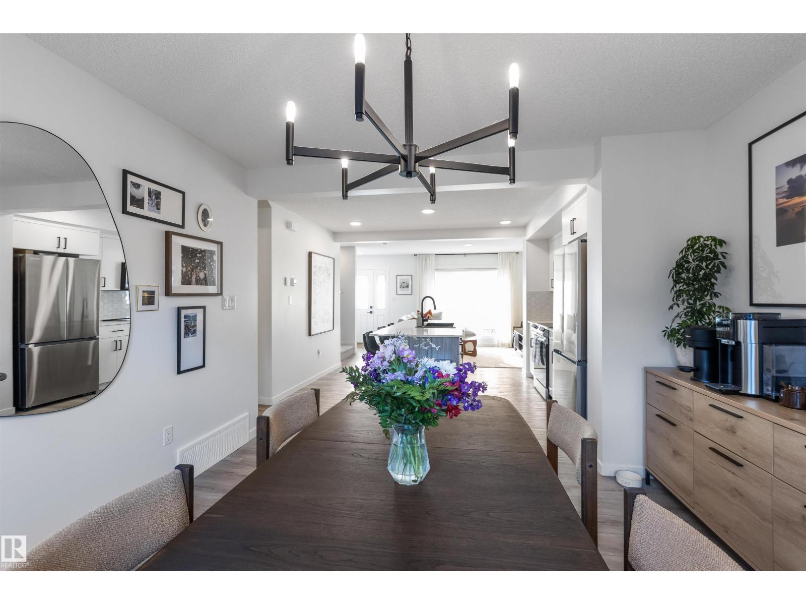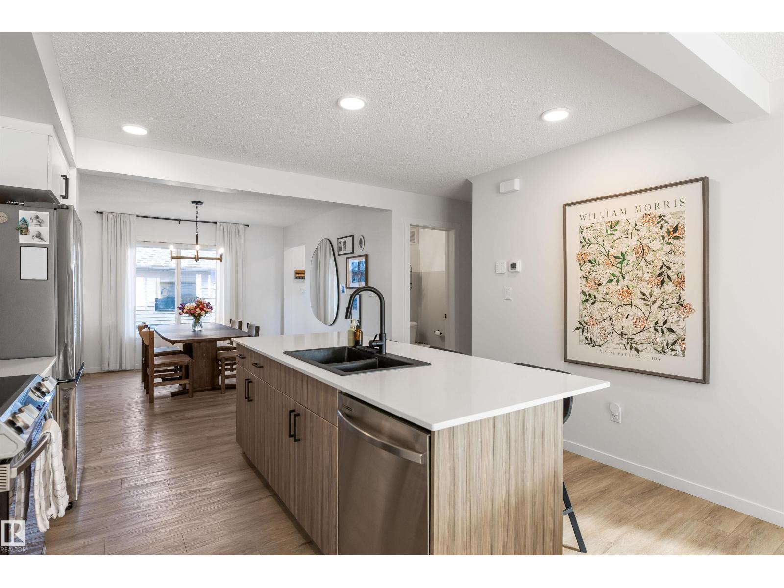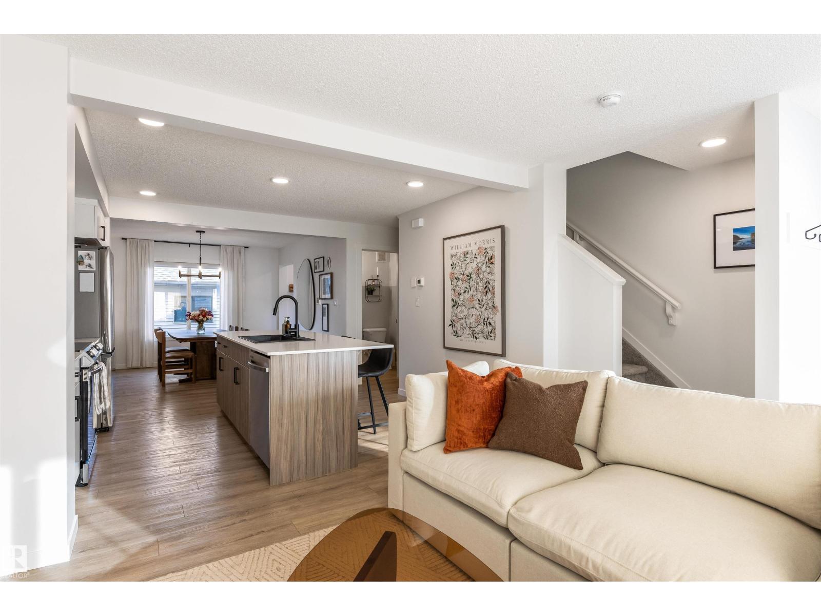 Step inside this beautiful home by StreetSide Developments and enjoy the seamless flow of the open-concept main floor, filled with natural sunlight from large windows throughout. The cozy front living room leads into a bright kitchen featuring ceiling-height white cabinetry, Samsung stainless steel appliances, quartz countertops, a large island with eat-up seating, and a black composite sink. The spacious dining area overlooks the fully landscaped backyard, complete with a dog run. Upstairs offers stacked laundry, two generous bedrooms, a 4pc bath, and a primary retreat with a walk-in closet and 4pc ensuite. The unfinished basement is ready for your personal touch. BONUS features include a double detached heated garage (120V dedicated breaker), A/C, and NO CONDO FEES. Located steps from schools, parks, trails, and amenities—this home is move-in ready! (id:51989)