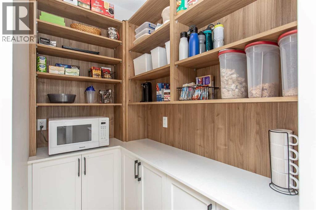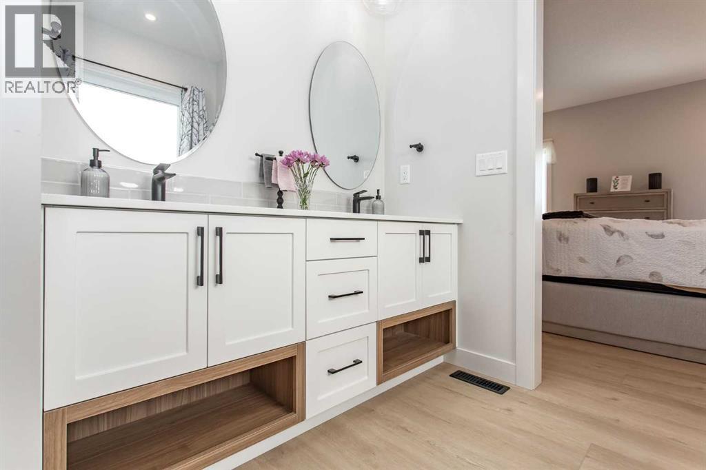 Explore this exquisite and spacious executive bungalow, featuring a three-car garage crafted by True-Line Homes. This residence showcases a unique layout that the builder has designed for the first time. Situated in the picturesque Evergreen neighborhood, this beautiful home presents an expansive open floor plan with soaring 11-foot ceilings and an abundance of south-facing windows, flooding the interior with natural light.As you step through the front door into the generous foyer, you'll immediately notice its convenient dual access with the entrance to the garage. This intelligently designed space includes a large foyer, a spacious closet, and custom shelving.The modern chef's kitchen is a culinary delight, boasting high-end appliances, ample cabinet and countertop space, and an impressive 8.5-foot island. Luxurious finishes include Quartz countertops, a Franke peak undermount granite double bowl sink, and a walk-in pantry with custom shelving for abundant storage. Attention to detail shines through with a custom wood range hood stained to match the island and stylish glass cabinet shelving.On the main floor, there's a versatile den currently utilized as an office, which could easily serve as a fourth bedroom. The spacious primary suite features a five-piece ensuite and a generously sized custom walk-in closet, expertly designed by Canadian Closet. An additional highlight is the expansive laundry room equipped with custom cabinetry and countertops, along with a pass-through window from the walk-in closet. This laundry space houses the LG 6.0 cu. ft. mega capacity Wi-Fi enabled front-load washer with the LG Sidekick mini washer in the pedestal along with a matching 9.0 cu. ft. dryer. Lastly, a two-piece powder room completes the main level.Descend the extra-wide stairs to the cozy family room, equipped with in-floor heating, ideal for movie nights or family game sessions. This level also includes two spacious bedrooms and a full four-piece bathroom, all enjoying the comfort of in-floor heating. The large storage area features durable painted floors, offering potential for an additional bedroom.This home boasts numerous upgrades, including a low-maintenance front verandah and a 10' x 18' back deck, central air conditioning, a water softener system, SunStop Low E argon-filled windows, and a fully finished heated triple garage with an epoxy-coated floor and two dry sumps. Custom Hunter Douglas blinds are fitted throughout, with motorized options in the living room, office, and primary bedroom.The professionally landscaped front and back yards feature stone elements and raised flower beds, enhancing the home's curb appeal. The Evergreen neighborhood offers extensive multi-use trails connecting to Red Deer’s extensive trail system, as well as two ponds with unique bridges and large playground and park facilities. Come and discover the elegance and comfort this remarkable property has to offer! (id:51989)