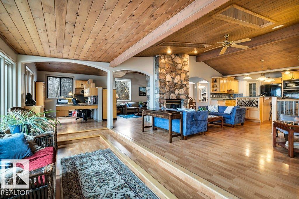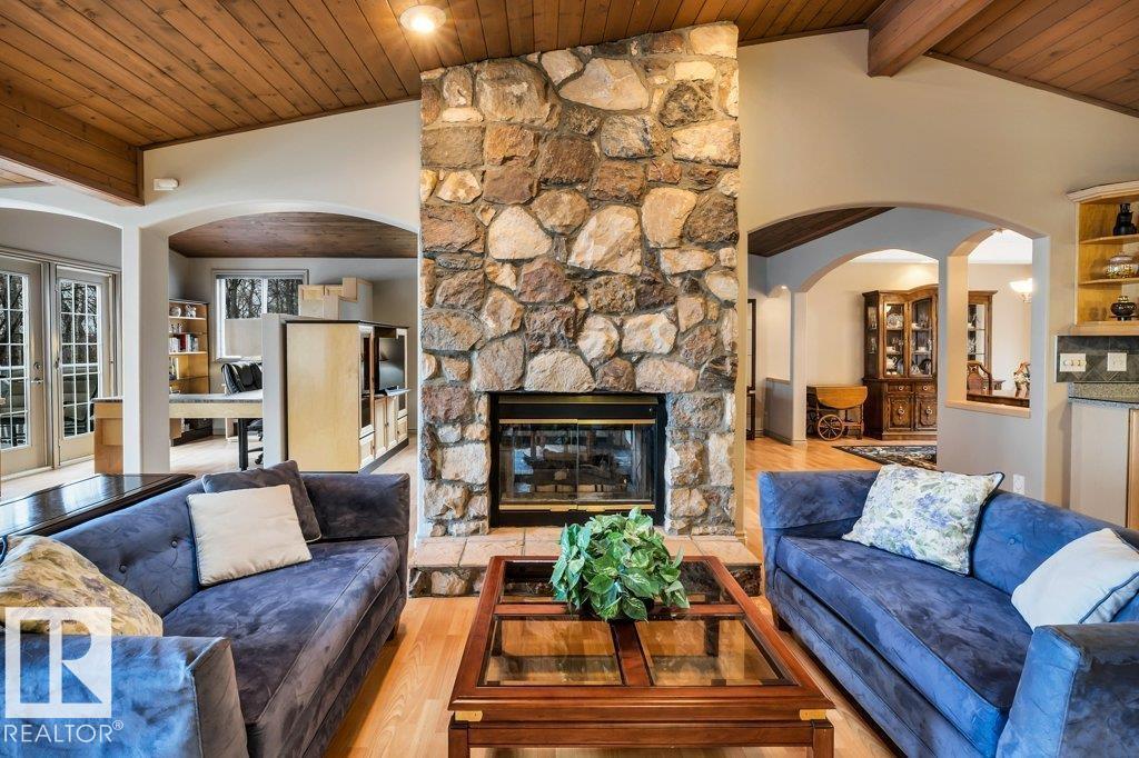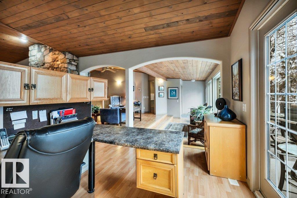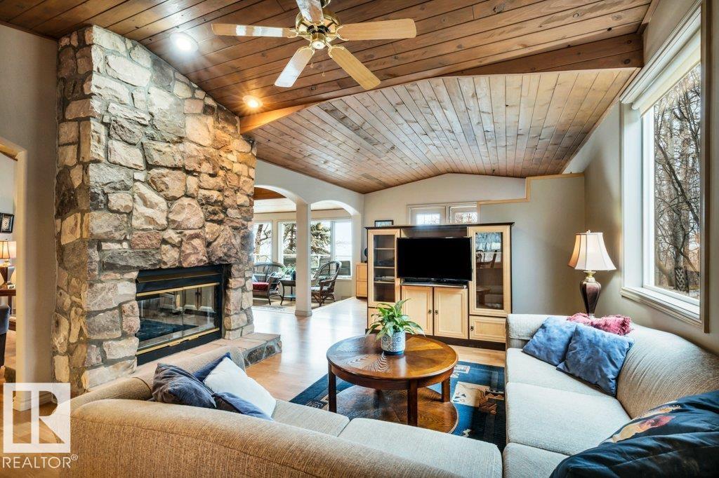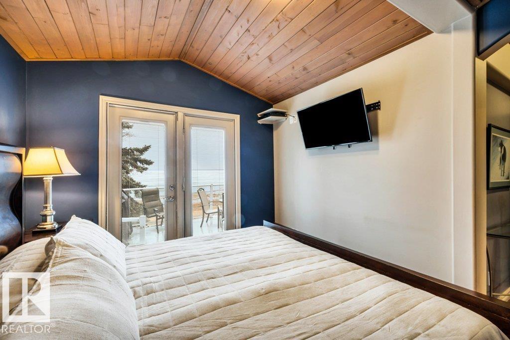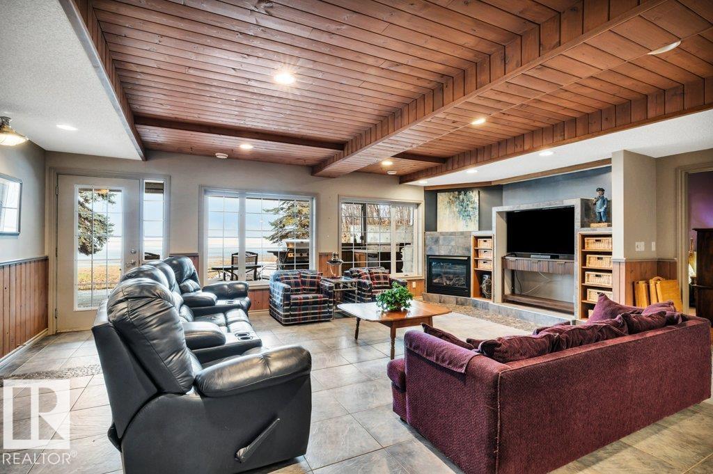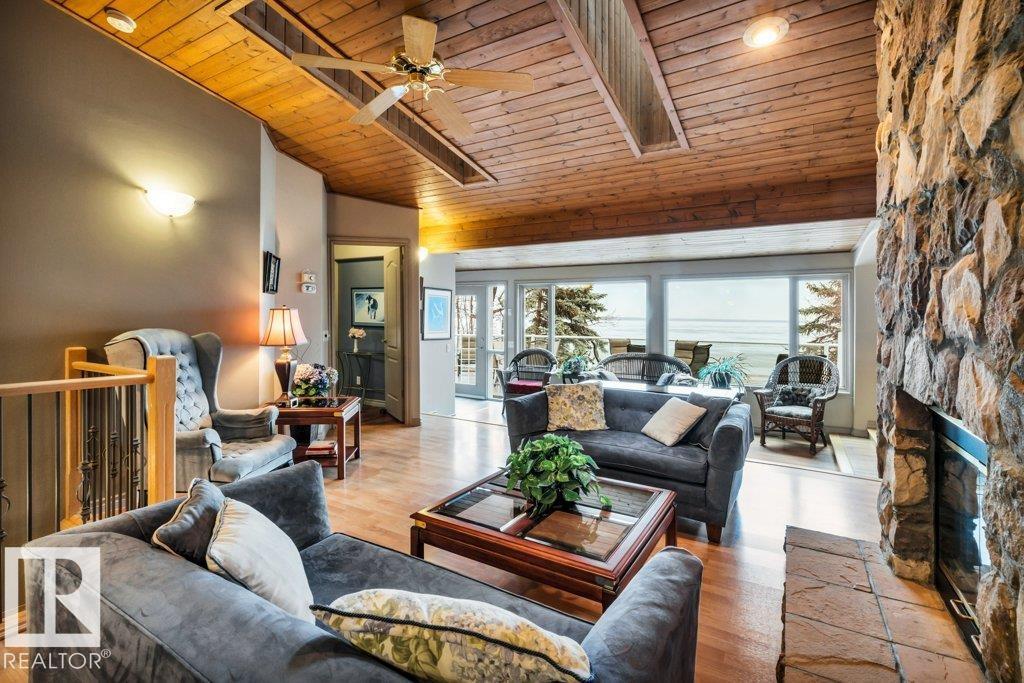 Discover the perfect blend of privacy, comfort, and lakeside living in this year-round walkout bungalow. Designed for both relaxation and connection, it features vaulted ceilings, warm wood accents, and a striking two-sided fireplace anchoring the open kitchen, dining, and living areas. Step onto the deck and take in serene lake views. The main floor offers a welcoming office near the entry, a spacious primary suite with walk-in closet and 5-pc ensuite, plus an additional bedroom for family or guests. Downstairs, enjoy a generous layout with a second living area, kitchen, workspace, private entrance, four bedrooms, and a 3-piece bath—ideal for extended family or visitors. Complete with an infrared sauna, patio with built-in BBQ, and direct lake access, this home delivers space, flexibility, and true waterfront privacy. (id:51989)
