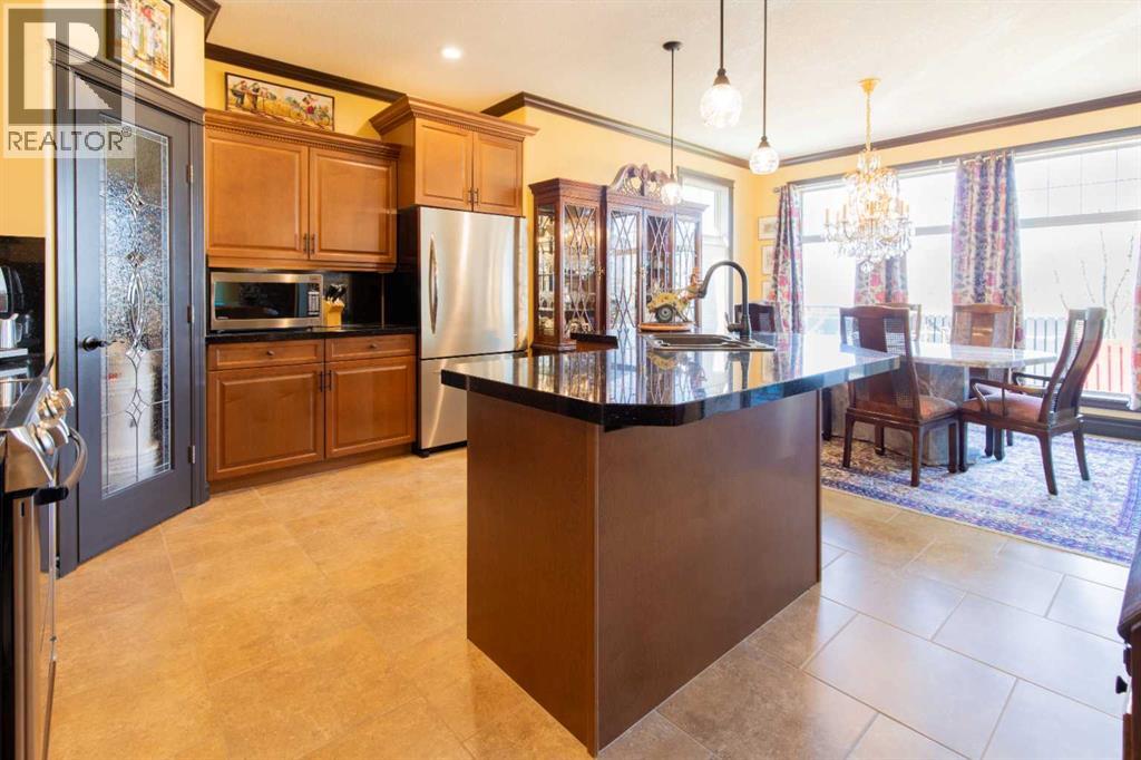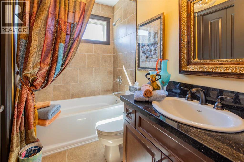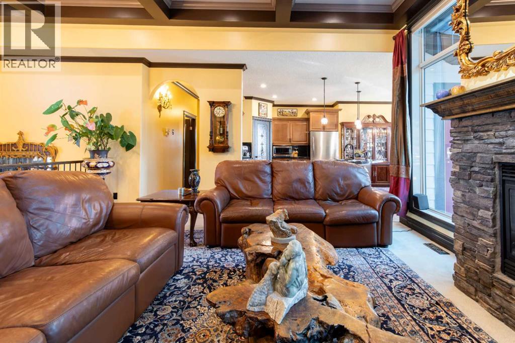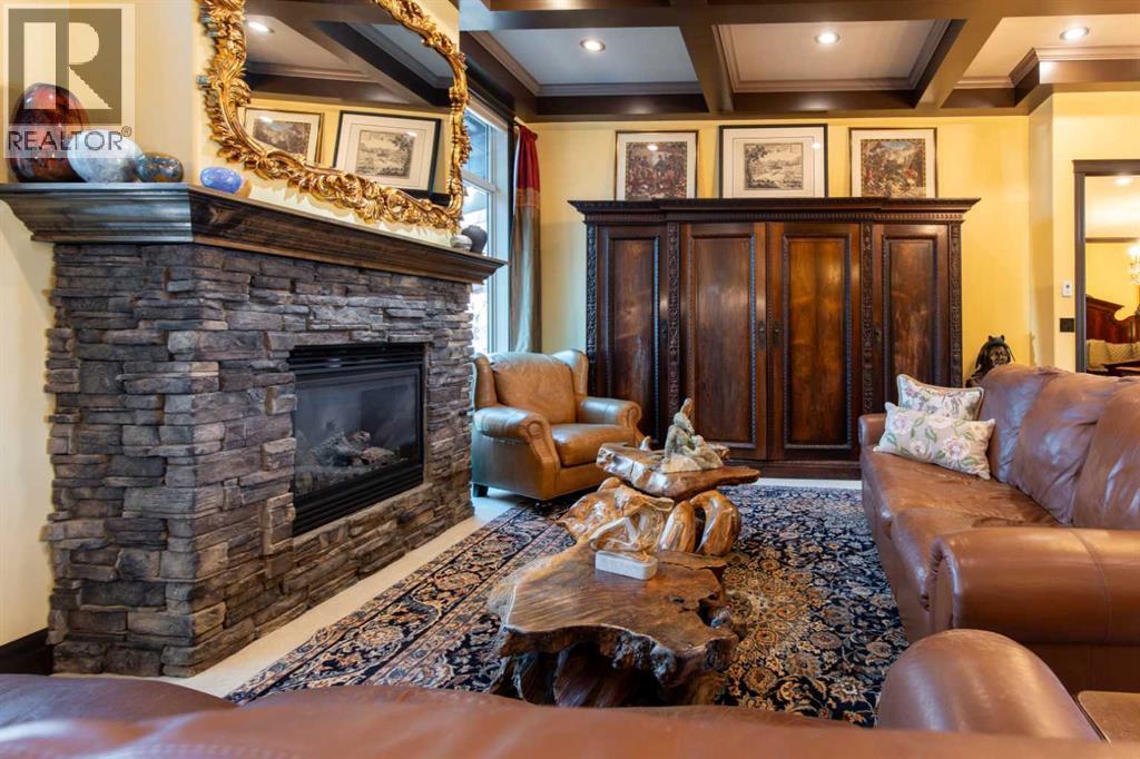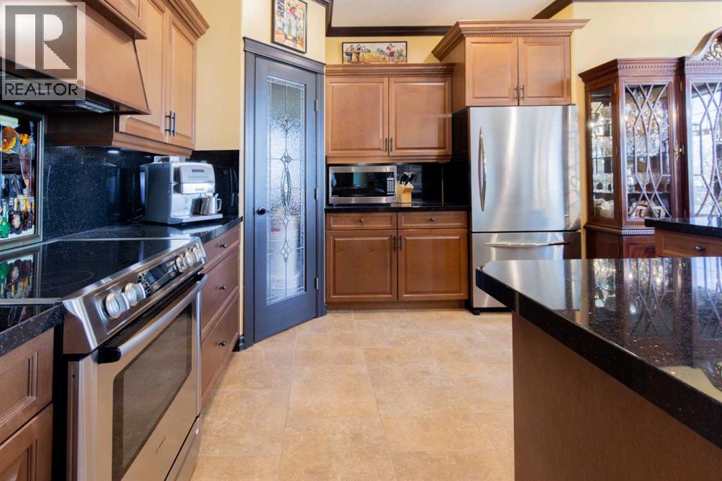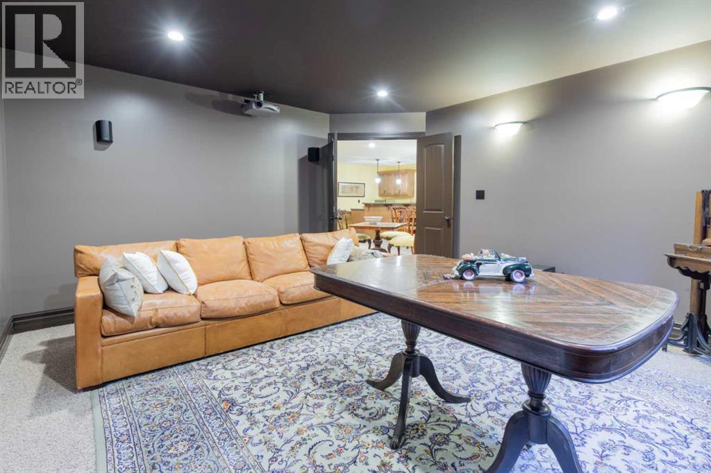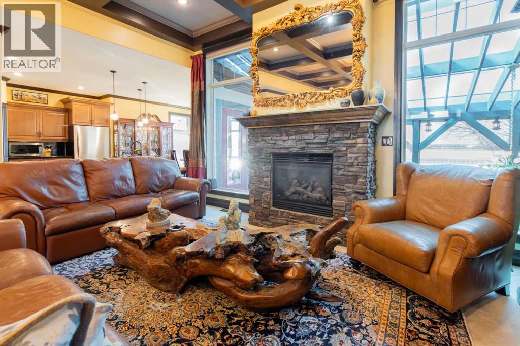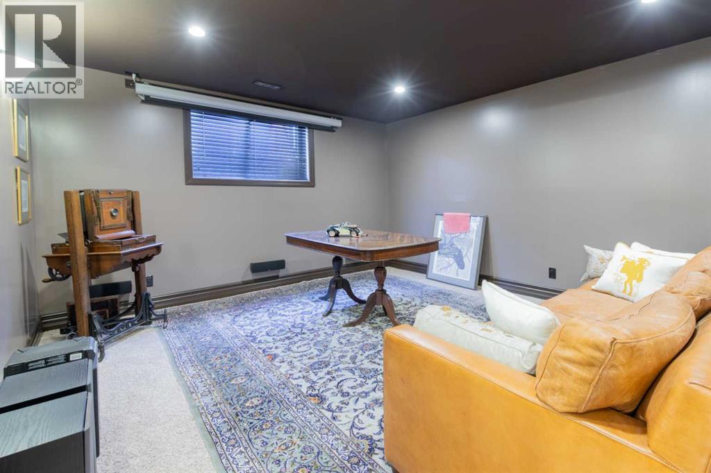 Impressive Fort Macleod home located within Garrison Estates overlooking the historic barracks with crisp mountain views and no neighbors behind! Step into the warm and welcoming front foyer where a hall leads to a luxurious living room with a central fireplace. Nearby, the kitchen offers plenty of cupboard storage, granite countertops, a corner pantry, and large central island with a breakfast bar. The main-floor primary bedroom provides a restful retreat, with a walk-in closet leading into a five-piece ensuite bath with a tub and steam shower. Down the hall, a laundry room with garage access, a bonus room, a four-piece bathroom, and two bedrooms complete the main floor layout. Above the garage, a 294 sq.ft. office offers the perfect spot to work from home, set up a play space, or create the hobby room of your dreams. On the lower level, the rec room features a corner fireplace and wet bar complete with a mini fridge and dishwasher. French doors lead into a fully wired media room with recessed lighting for movie nights with the whole family! A gym to one side and three more bedrooms down the hall with a five-piece bath located centrally make a convenient layout for holiday hosting. Outside, you'll be charmed by this home's landscaping, which includes stone pathways, concreate fence bases, underground sprinklers, trees, shrubs, and two greenhouses sure to be a hit with the green thumb in your family. With a covered deck complete with gorgeous prairie and access to the dining room, RV parking beside the property, and a double attached garage to store tools and vehicles safely, this home is sure to impress anyone with an eye for quality. If a beautiful home perfect for large families and entertainers sounds like the spot for you, give your REALTOR® a call and book a showing today! (id:51989)
