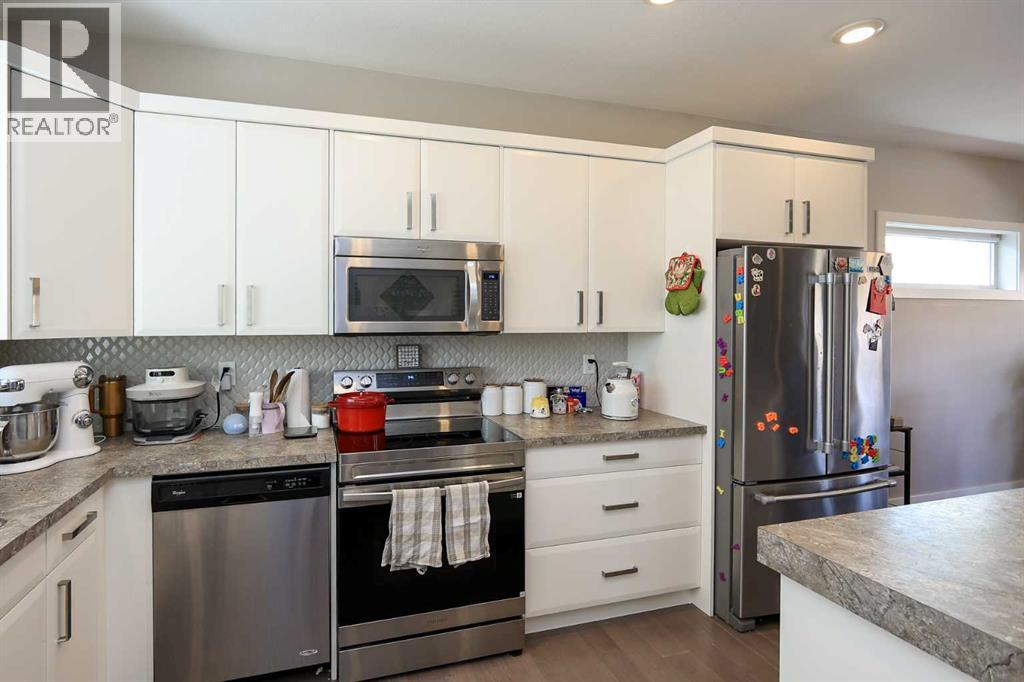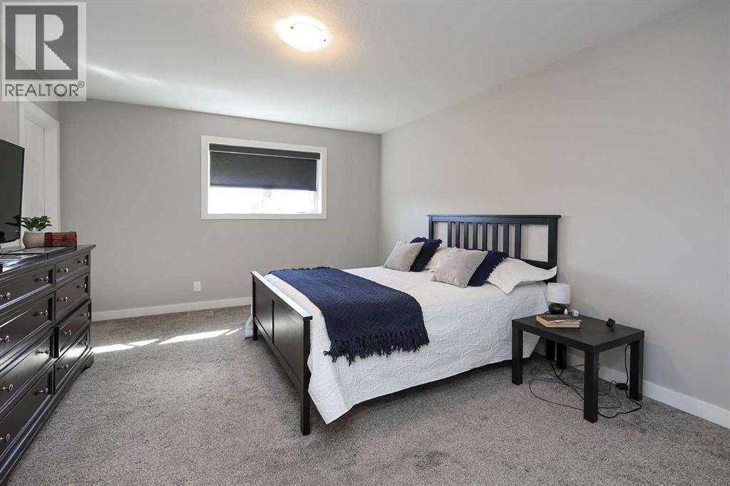 FULLY DEVELOPED 4 BEDROOM, 3 BATH ROOM MODIFIED BI-LEVEL ~ PIE LOT IN A QUIET CUL-DE-SAC W/NO NEIGHBOURS BEHIND ~ 25' L X24' W DETACHED GARAGE + RV PARKING ~ Large covered front veranda welcomes you and leads to a spacious foyer with high ceilings that open to the upper level ~ Open concept main floor layout ~ The living room has floor to ceiling windows that overlook the backyard and is centred by a cozy gas fireplace with a tile surround ~ The kitchen offers plenty of white cabinets, ample counter space including an island with an eating bar, full tile backsplash, sunny south facing window above the sink and a walk-in corner pantry ~ Easily host large gatherings in the dining room with access to the covered deck and backyard ~ 2 main floor bedrooms are both a generous size with ample closet space ~ 4 piece main bathroom ~ Open staircase leads to the private primary bedroom located on it's own level with plenty of space for a king size bed and furniture, walk-in closet with built in organizers, and an ensuite with dual sinks and a walk-in shower ~ The fully finished basement has high ceilings, large above grade windows and offers a large L-shaped family room (potential for a 5th bedroom), laundry, 4 piece bathroom, a spacious bedroom, and space for storage throughout ~ Double attached garage is insulated, finished with drywall, and has a man door to the extra large driveway with space for two vehicles and RV parking ~ The fully fenced backyard is landscaped, has a garden shed and space below the deck for storage ~ Excellent location; walking distance to schools, parks, playgrounds amd waking trails, and steps to a commercial shopping area with all amenities. (id:51989)
