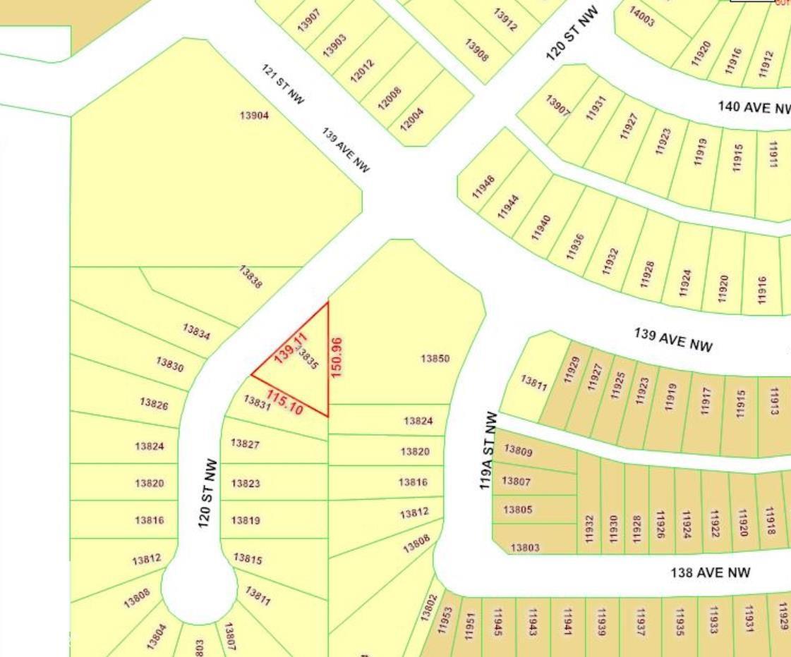 Rare infill opportunity in Carlisle! This oversized 7,600 sq. ft. (706.15 SqM) pie-shaped lot sits in a quiet cul-de-sac within a mature, family-friendly community—an ideal setting for redevelopment. Generous lot size and unique shape offer flexibility for new build potential. Surrounded by established homes, top schools, beautiful parks (Carlisle Park), and major shopping (The Home Depot, Walmart, Superstore, Lucky Supermarket, Best Buy), cafes, restaurants, movie theater, with transit within walking distance. Quick connectivity to the Anthony Henday, and downtown Edmonton terrific long-term value. Prime land in a proven location. Zoning: 2.10 RS - Small Scale Residential Zone. The Property is being sold as is, where is. (id:51989)