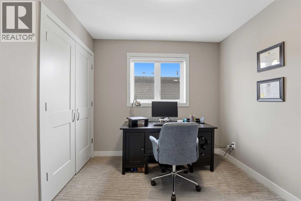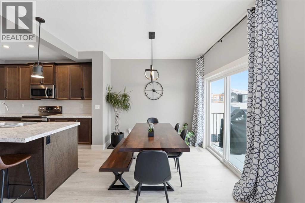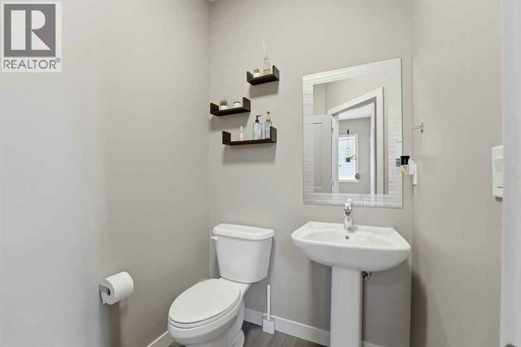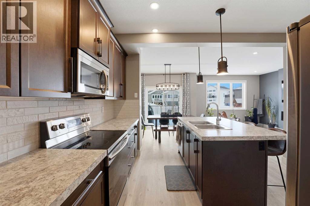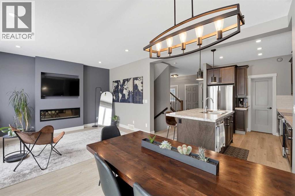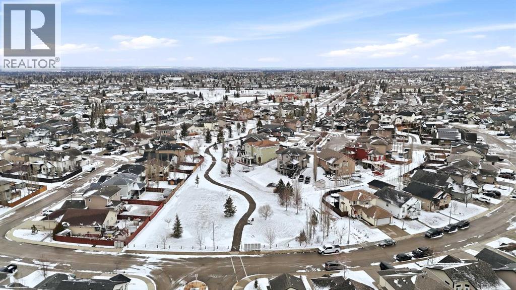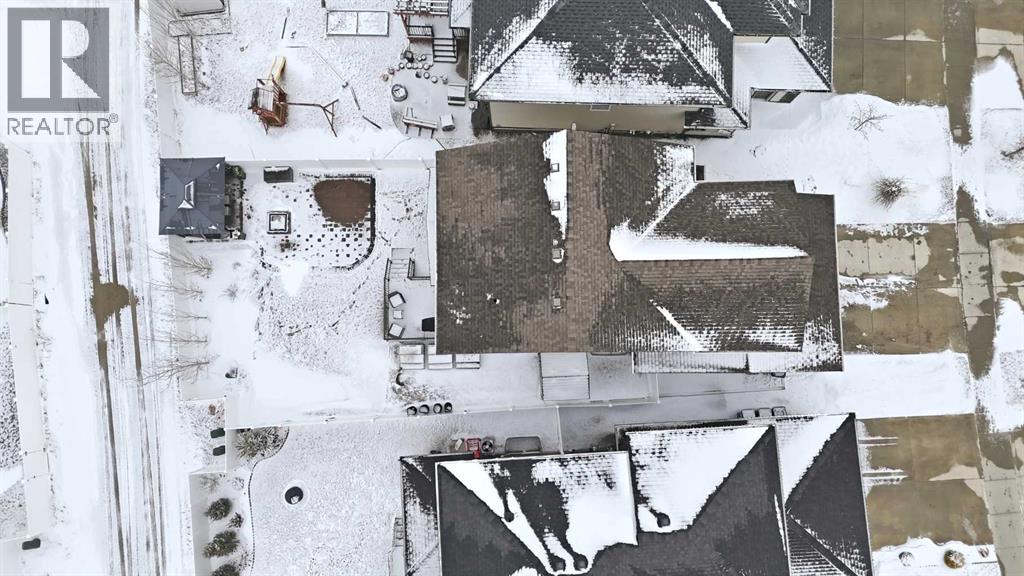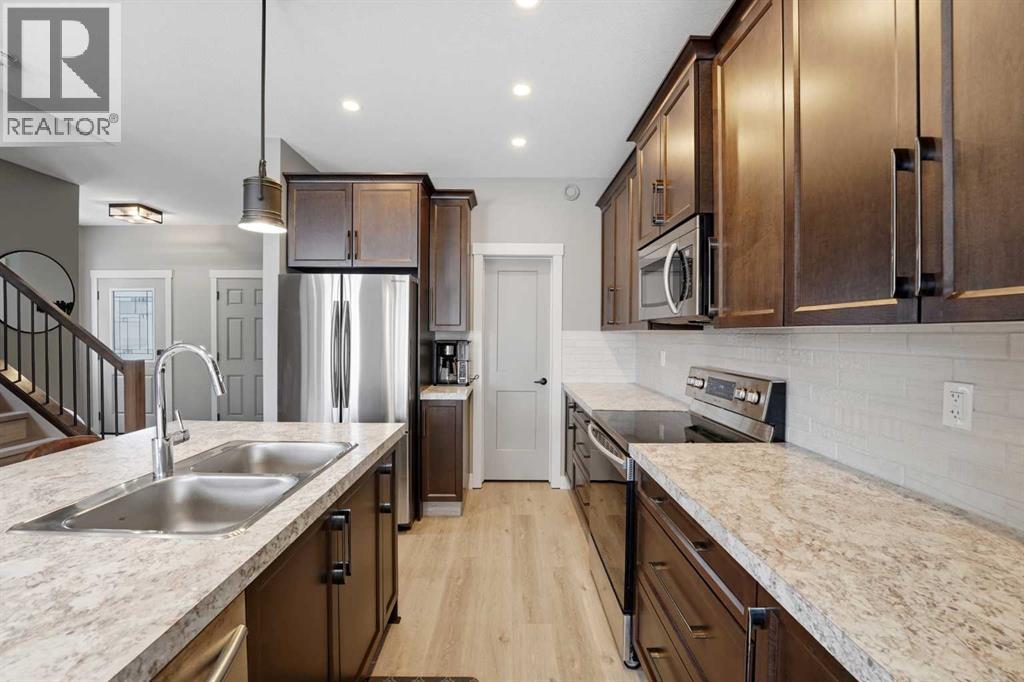 A fully developed two storey in Laredo! The tiled front entryway greets you to the open style floor plan. Maple kitchen cabinets are accented by crown mouldings, an eating bar island, full tile backsplash, stainless steel appliances and a walk in pantry. The eating area has patio doors to the wood deck that features aluminum railings. Relax in the living room next to the electric fireplace. Brand new vinyl plank flooring was just installed throughout the main floor. Follow the vinyl plank stairs with wrought iron railings upstairs. The king sized primary bedroom has a fan, carpet, a walk in closet and a 4 piece ensuite with drawers and a window. There are 2 additional bedrooms, a 4 piece bathroom and a bonus room that could be used as a 5th bedroom (no closet). The basement is warmed by underfloor heating with a 4th bedroom, a 3 piece bathroom and a family room with vinyl plank flooring (new flooring in 2025). The south west facing backyard is landscaped with an interlocking stone patio, a firepit, a gazebo, a shed and vinyl fencing. The garage has a drain, rough in for a gas heater and central vac. The home has A/C. A great location within walking distance to the pond and path system. (id:51989)