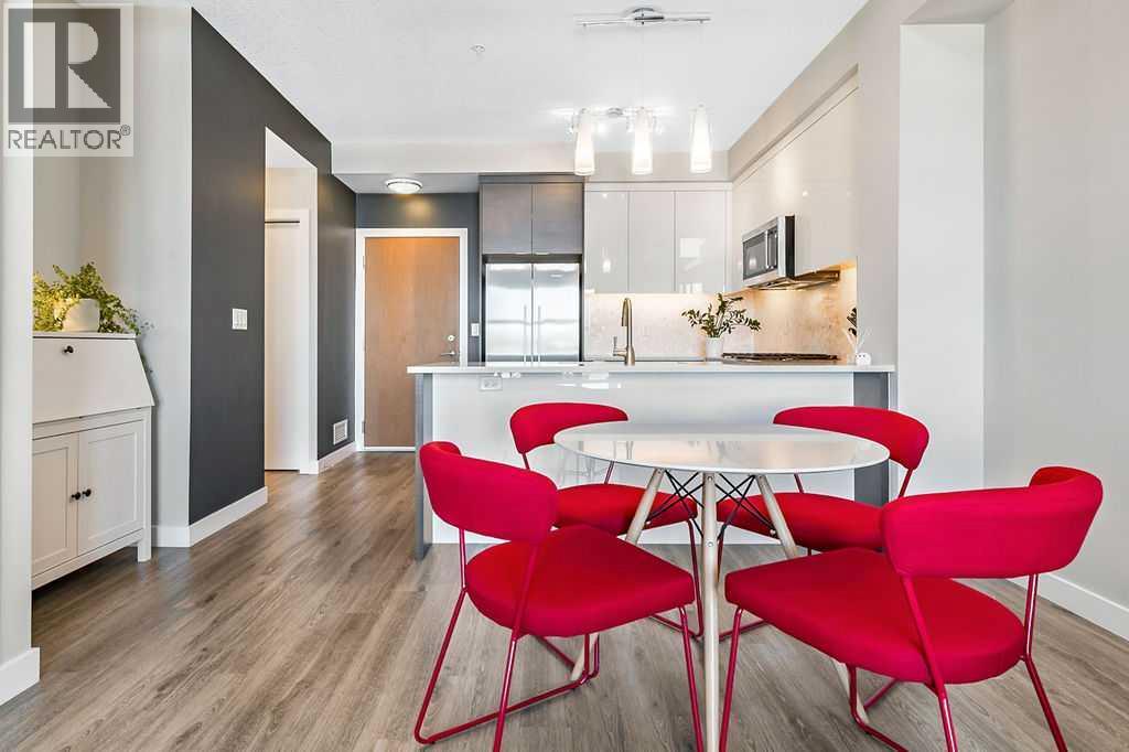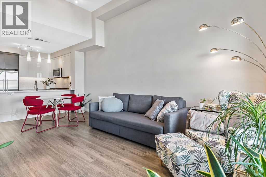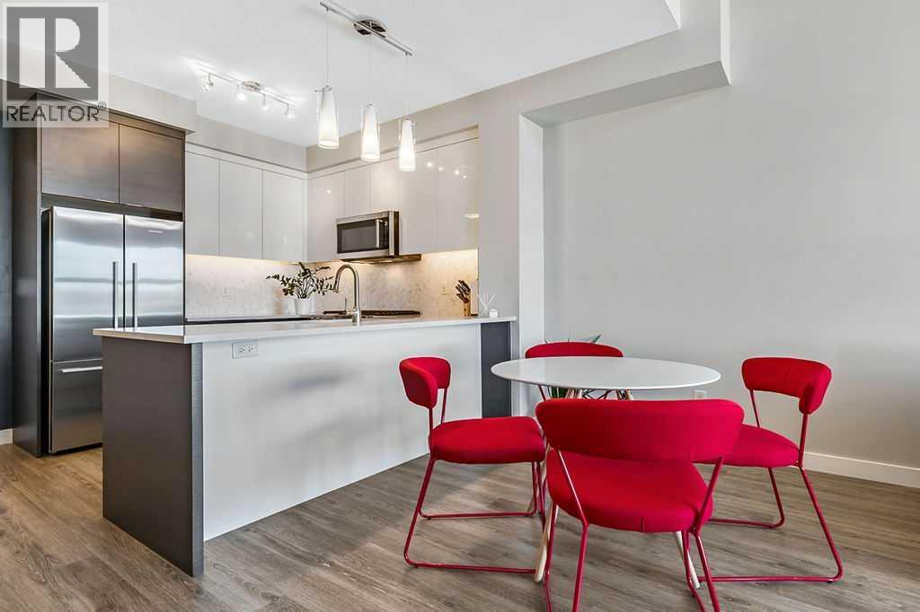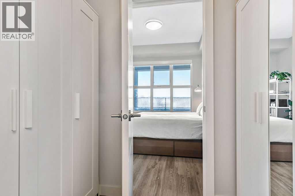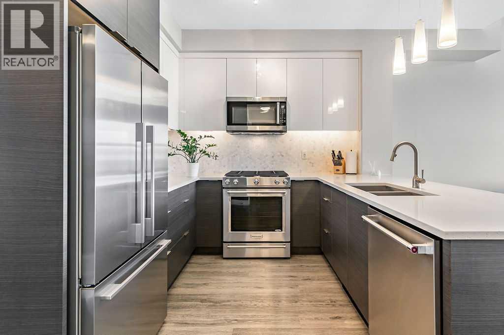 A quiet confidence you notice the moment you step inside. Sitting at the top, where the light lingers just a little longer and the noise fades into the background. Ceilings stretch nearly 13 feet high, giving room to breathe and room for your life to unfold in a way that feels expansive, not confined. Every evening, golden light spills through windows, dancing across the open-concept space, warming the two-tone cabinetry and catching the subtle shimmer of the designer backsplash. The kitchen has been thoughtfully elevated with sleek upgraded appliances, clean lines, and finishes that feel as beautiful as they are functional. Conversations flow easily here, from the kitchen to the living space, carried by light and openness. And just beyond the windows, a view over the rooftops reminds you; you’re above it all. The bedroom is generous, calm, and restorative, with a walk-through closet thoughtfully finished with organizers that keep everything in its place. And then your bathroom. A space that invites you to slow down, exhale, and stay a little longer. Crafted with all the details you’d expect and a few you didn’t know you needed. 40+ visitor underground parking stalls and even a car wash, tucked conveniently within the building, because ease should be part of everyday living. Not just a top-floor condo. Your new home where light, space, and location come together, effortlessly. (id:51989)