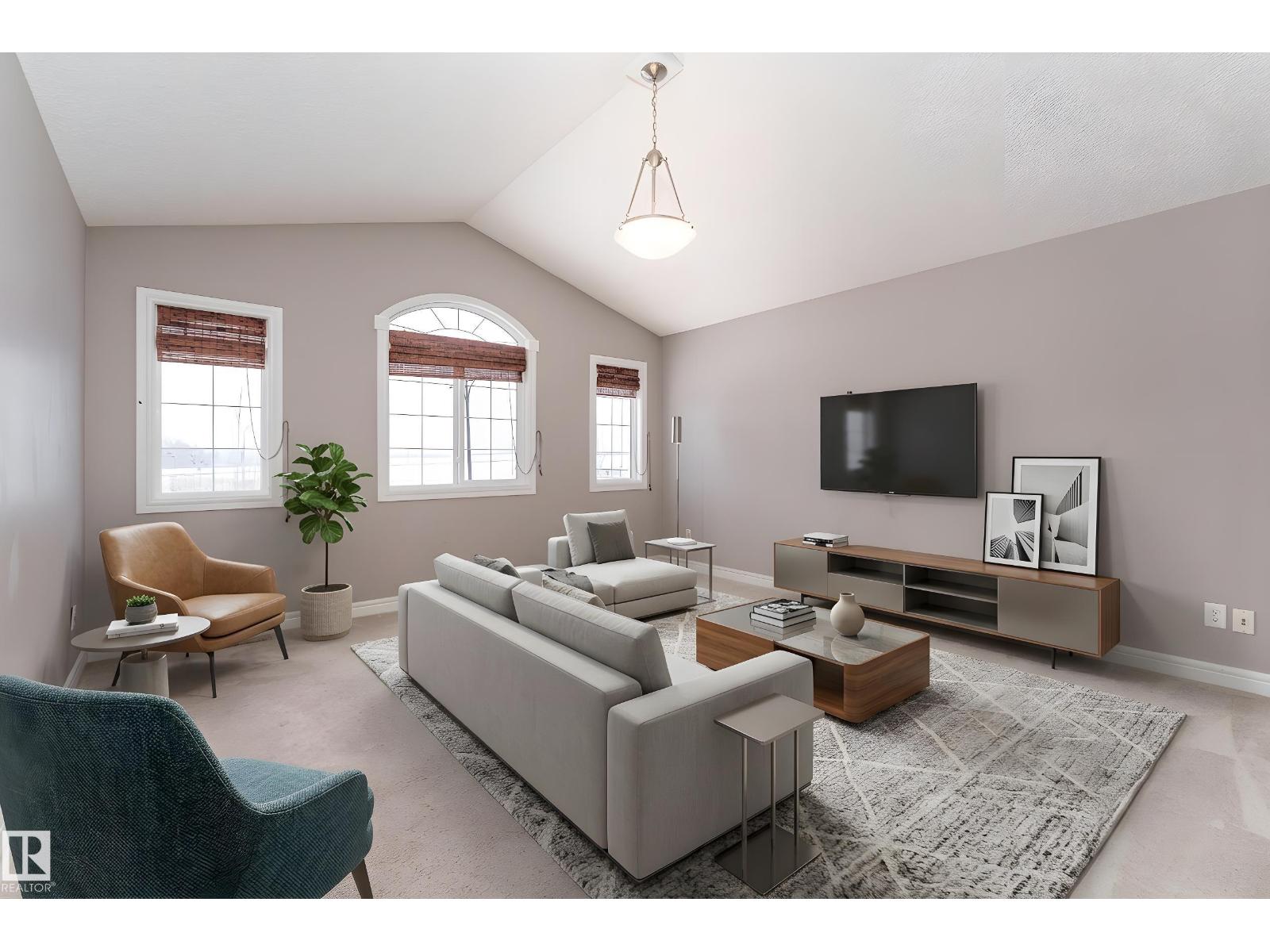 Nestled on a quiet cul-de-sac, this southeast-facing Summerwood home offers over 2,100sqft of bright, open living with style, comfort, and family functionality at every turn. The main floor features rich hardwood, a cozy gas fireplace, & a spacious living area filled with natural light. The kitchen impresses with granite countertops, stainless steel appliances, gas stove, and a corner pantry, flowing seamlessly into the dining area. A versatile open flex area adds room for a den or extra dining, alongside main floor laundry and a convenient 2-piece bath. Upstairs, enjoy a large family room with surround sound, three bedrooms including a generous primary with ensuite, plus an additional full bathroom. The fully fenced backyard boasts a composite deck and a water feature, complemented by another water feature at the front. Recent updates: hot water tank, water softener, garage door, and A/C for year-round comfort. Bright, spacious, and perfectly located—this home has it all. Some photos are virtually staged (id:51989)