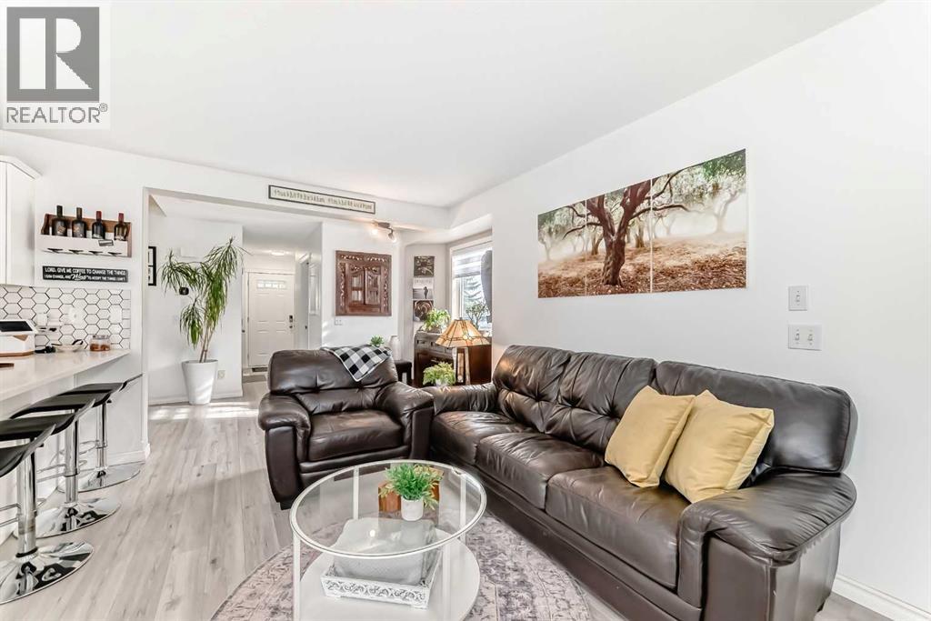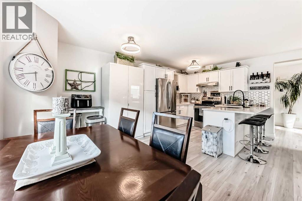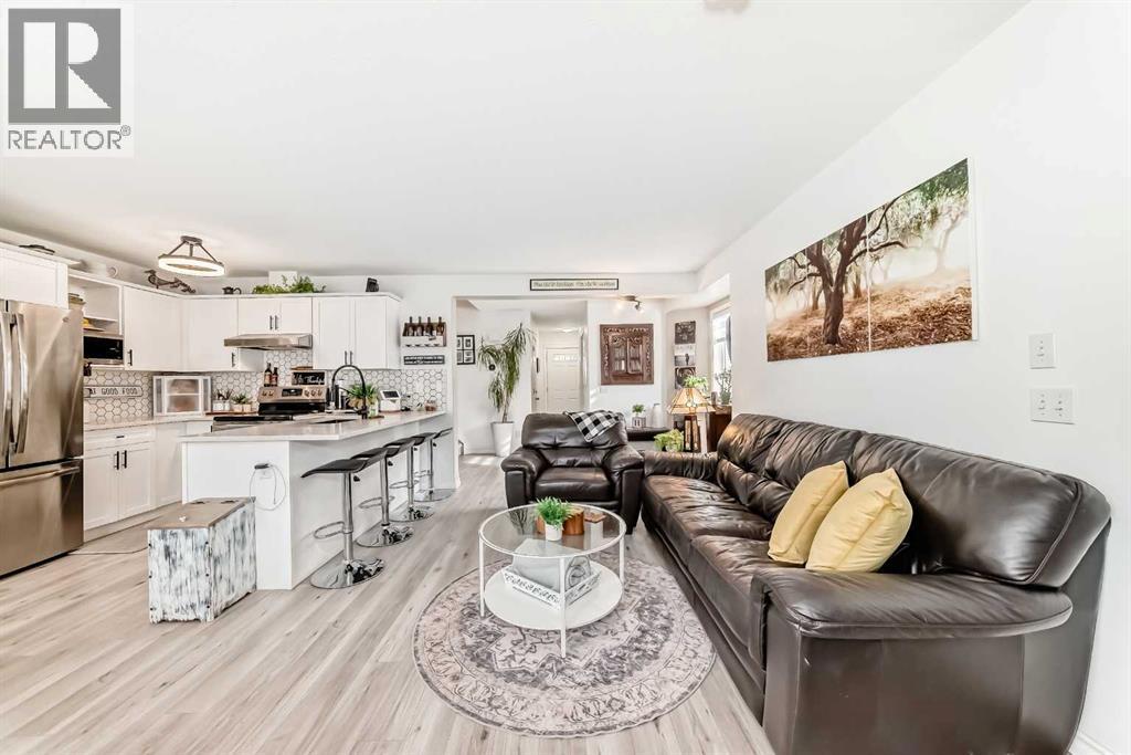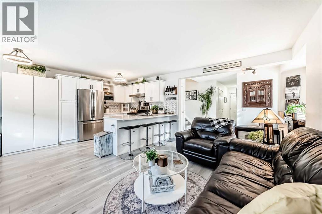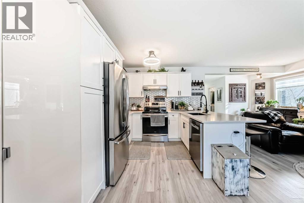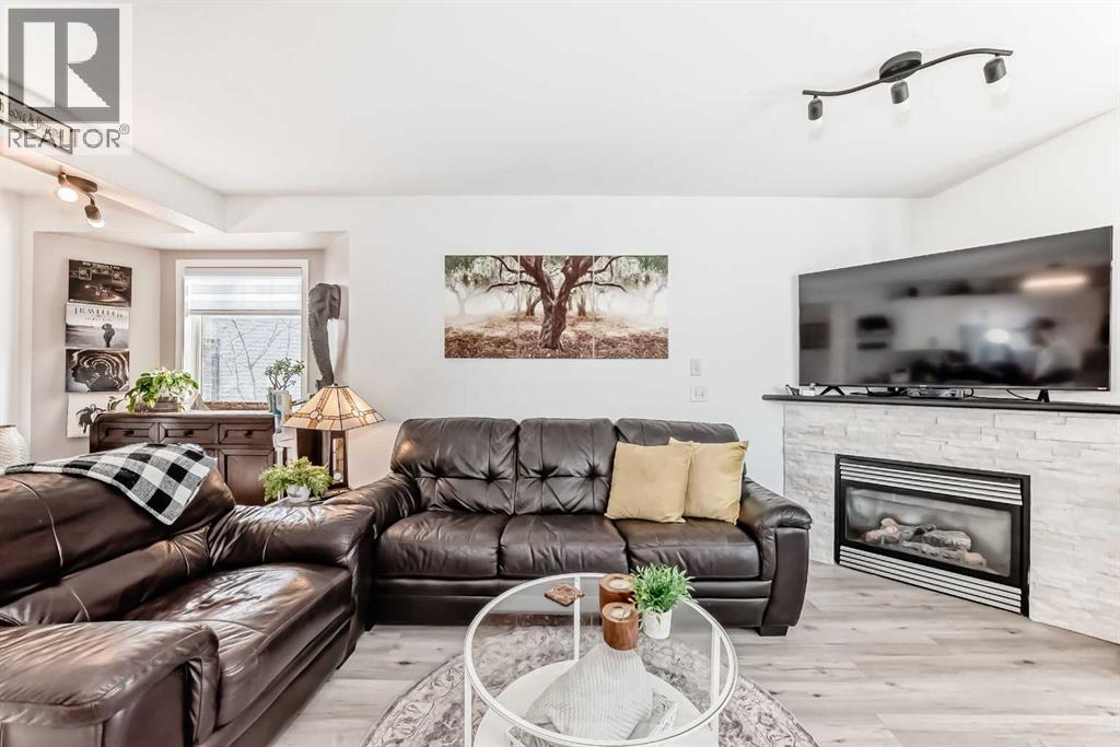 Beautiful, fully finished end-unit townhome with central A/C, thoughtfully maintained and beautifully presented. This bright and inviting home features 4 bedrooms and 3.5 bathrooms.The open-concept main floor showcases a bright kitchen with updated white cabinetry, quartz countertops, newer stainless steel appliances, a stylish tile backsplash, and a large pantry. The adjoining living room features a cozy corner gas fireplace, and durable LVP flooring runs throughout the main level. As an end unit, the home is filled with natural light from large south- and west-facing windows. You’ll also find a convenient powder room and direct access to the attached garage on this level.Step outside to a lovely west-facing patio with a gas hookup—perfect for BBQs and enjoying the evening sun.Upstairs, the spacious primary bedroom offers a 3-piece ensuite, double closets with ample storage, and a comfortable sitting area. Two additional generously sized bedrooms and a 4-piece bathroom complete the upper level.The fully finished basement adds even more living space, featuring a good-sized family room, a fourth bedroom with a large window and closet, a 4-piece bathroom, and a laundry room.All appliances are approximately 5 years old. Ideally located close to schools, shopping, and all the great amenities Okotoks has to offer. (id:51989)