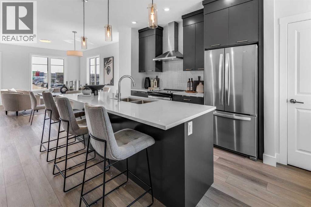 The stunning ‘Holiday’ model by Brookfield Residential is now available in the heart of Rockland Park! This brand-new townhome is thoughtfully designed and extensively upgraded, offering 3 bedrooms, 2.5 bathrooms, a ground-floor den, and a private double attached garage. The open-concept main living area features a timeless kitchen with full-height cabinetry, quartz countertops, a built-in hood fan and microwave, and a stainless-steel appliance package. The extended island provides additional seating, making it a natural gathering place. The kitchen flows seamlessly into the dining and living areas, which are filled with natural light thanks to a wall of windows. A private balcony off the living room offers the perfect spot to enjoy the summer sun. A full laundry room with extra storage and a 2-piece powder room complete this level. Upstairs, the spacious ~11’ x 12’ primary suite includes a walk-in closet and a private ensuite. Two additional bedrooms and a full bathroom complete the upper floor. On the lower level, a versatile den off the entryway provides the perfect space for a home office or flex area, while the private double attached garage keeps your vehicles and valuables safe year-round. This home has been upgraded throughout, including central A/C rough-in, BBQ gas line, pendant lighting over the island, 42" upper cabinets, and a full interior selections package. The property is protected by both a full builder warranty and Alberta New Home Warranty, offering peace of mind in one of Calgary’s most sought-after new communities, with an unbelievable homeowner’s association, Rockland Park. If you’re looking for a stylish, low-maintenance townhome with exceptional design and craftsmanship—this is the one! (id:51989)