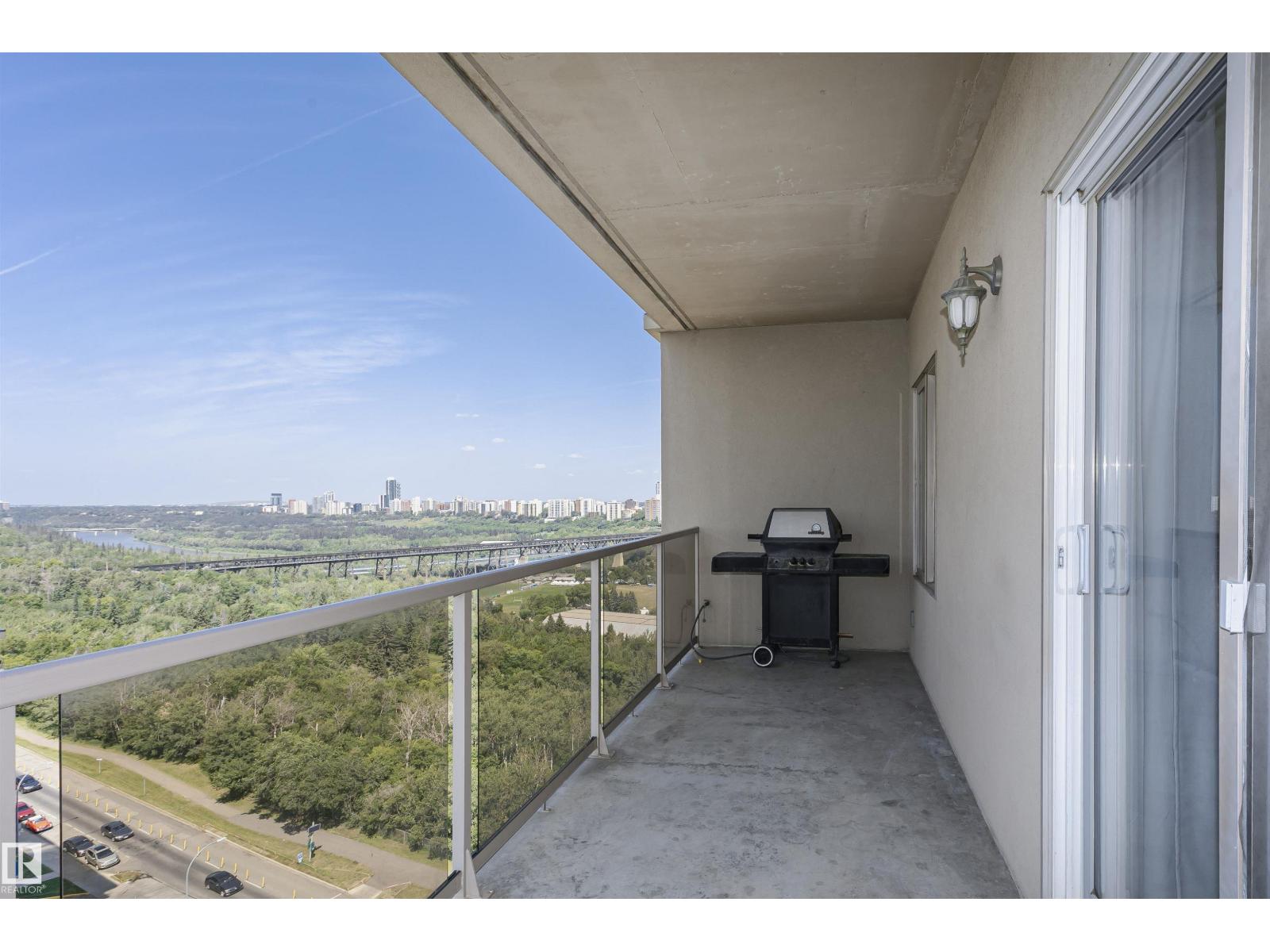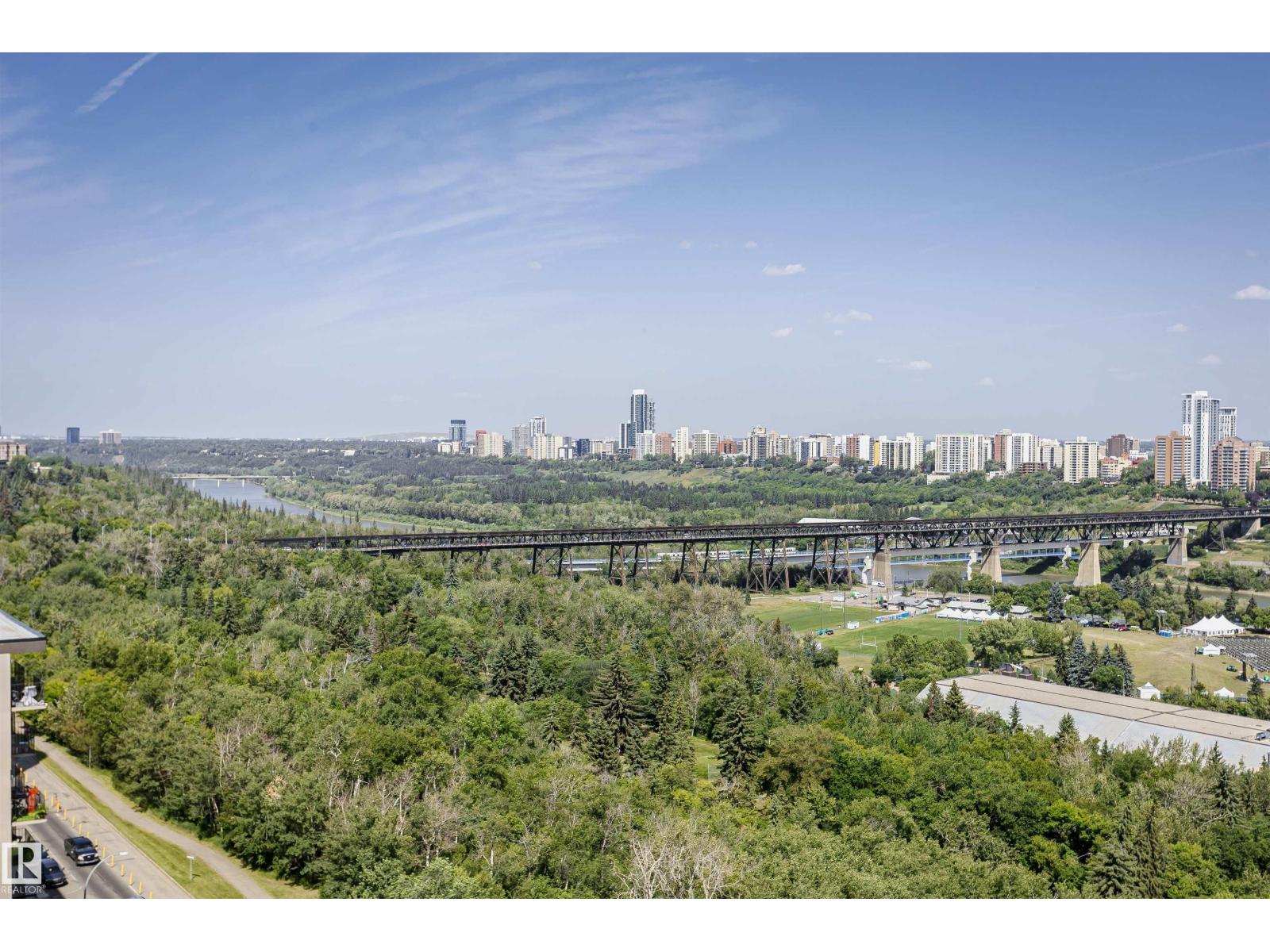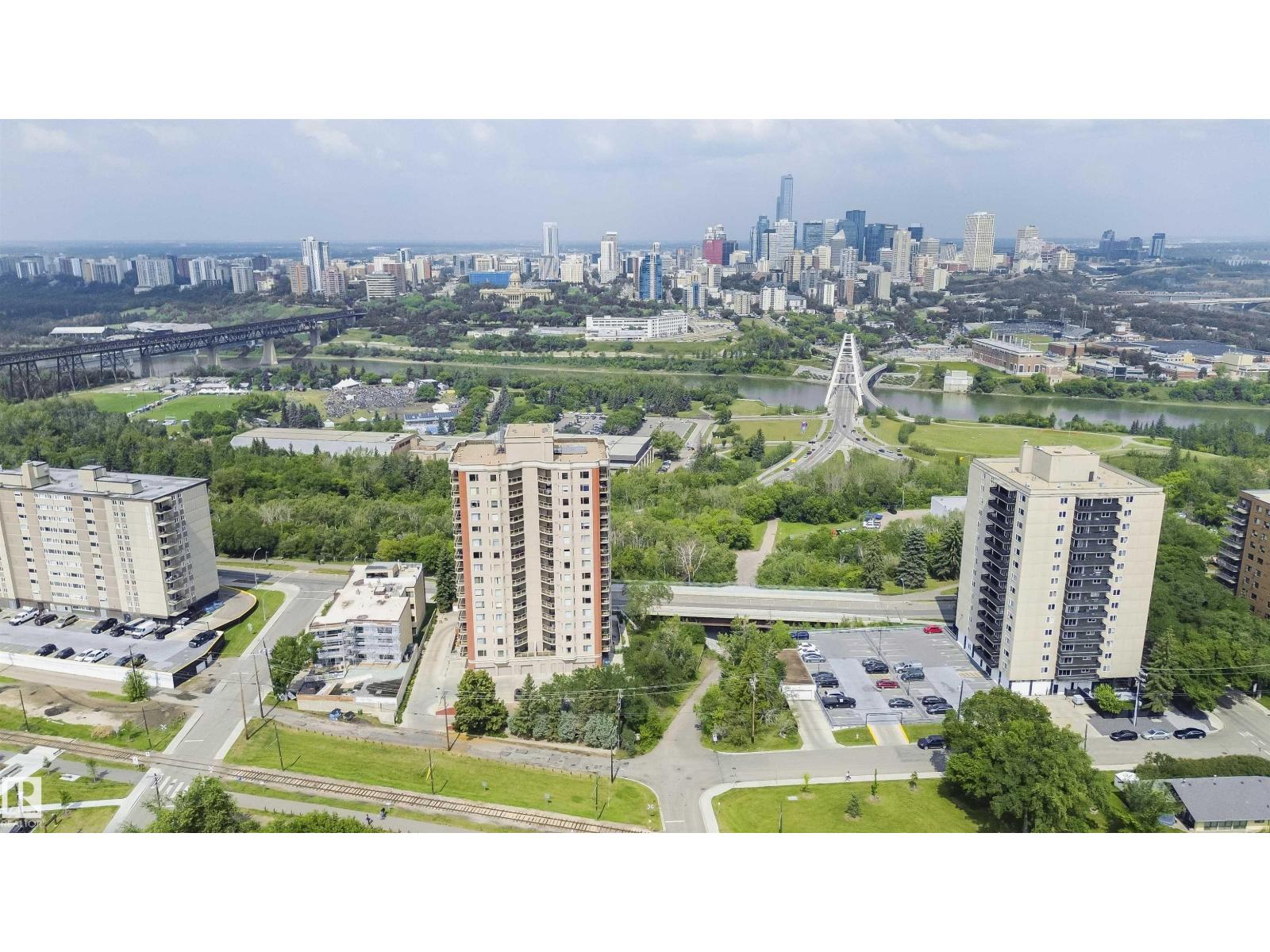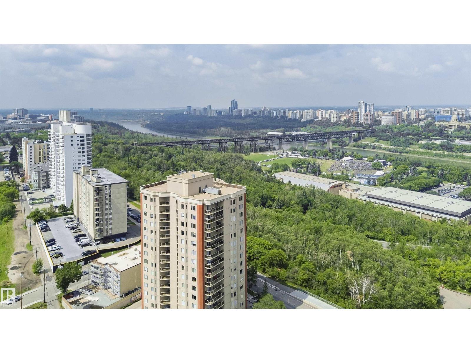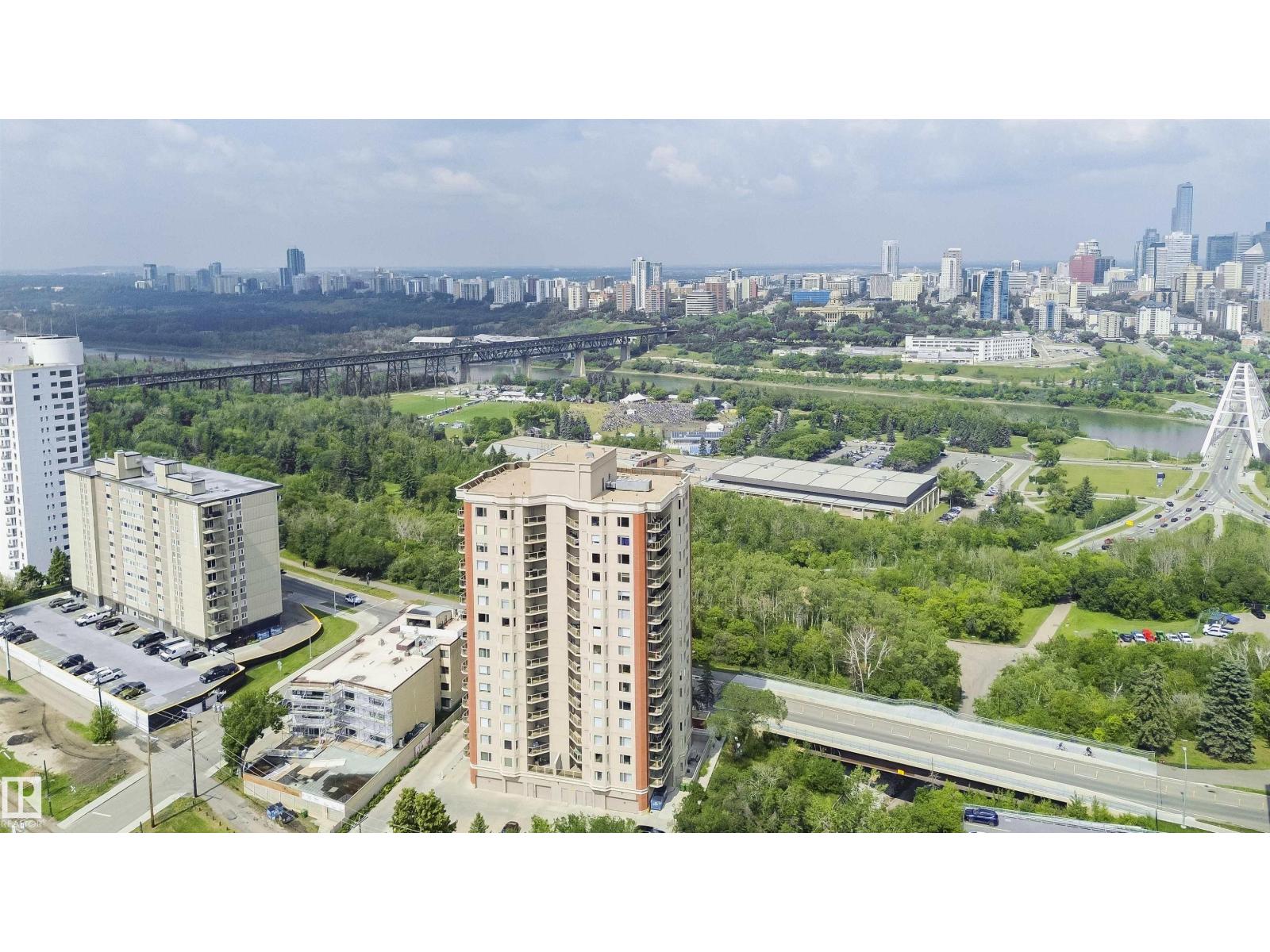 Corner penthouse suite with panoramic views of the river valley and downtown skyline, perfect for professionals working at the U of A or downtown. Sunlight floods the space from south and west-facing windows, creating a warm, inviting atmosphere. Thoughtfully designed with two spacious bedrooms on opposite sides for added privacy. The south-facing primary offers a 4-piece ensuite, double closet, and private patio with storage room. The second bedroom features a walk-in closet, and full bath. The open-concept kitchen includes a breakfast bar and flows into a bright living area with a gas fireplace and access to a second large patio with gas BBQ hookup. In-suite laundry, titled underground parking, and an on-site fitness room complete the package. A quiet, well-managed, non-smoking building with incredible potential in an unbeatable location with two patios! (id:51989)