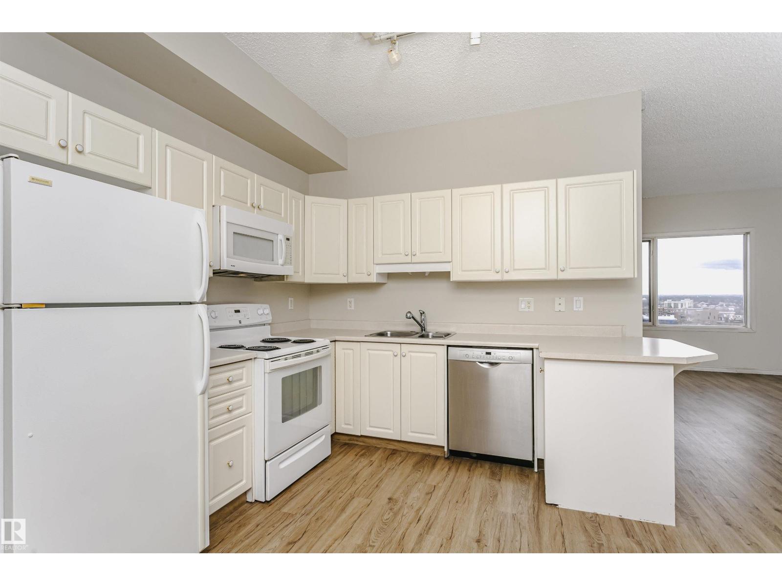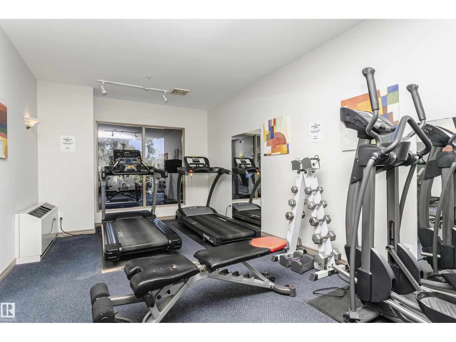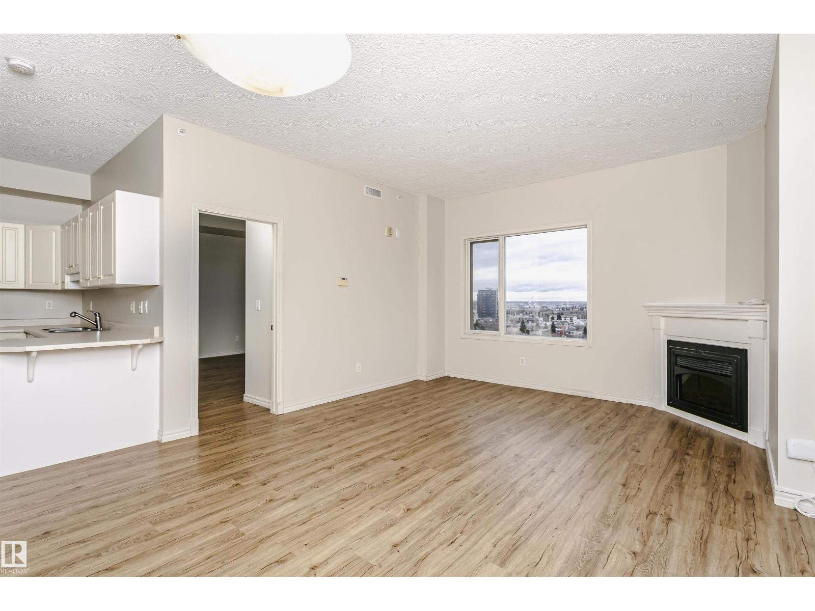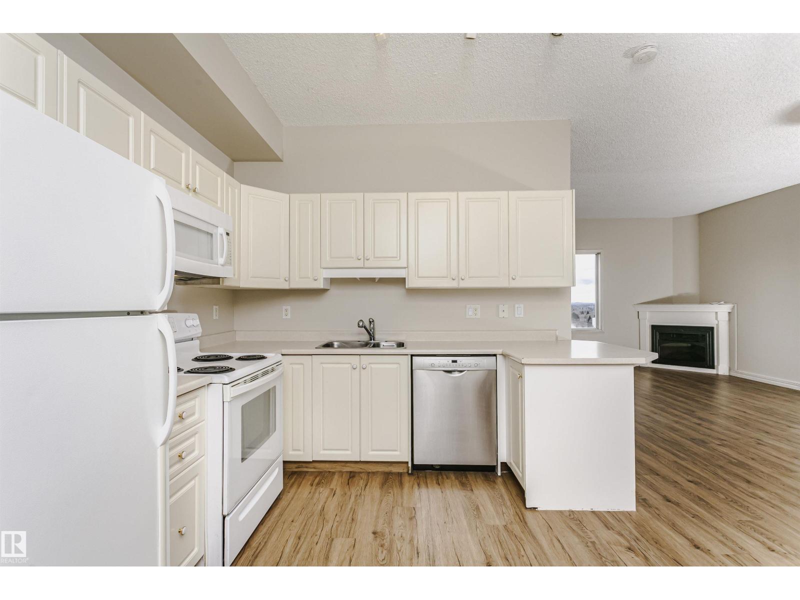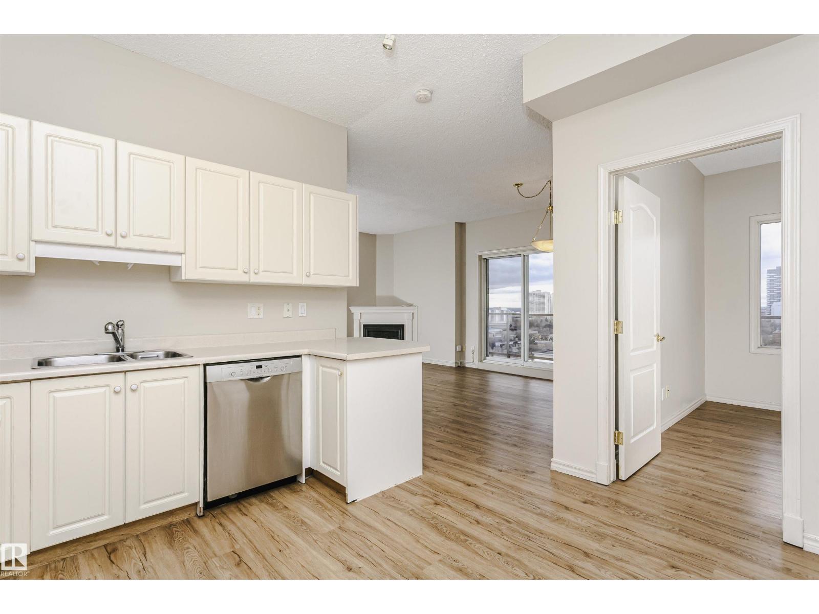 Corner penthouse suite with panoramic views of the river valley and downtown skyline, perfect for professionals working at the U of A or downtown. Sunlight floods the space from south and west-facing windows, creating a warm, inviting atmosphere. Thoughtfully designed with two spacious bedrooms on opposite sides for added privacy. The south-facing primary offers a 4-piece ensuite, double closet, and private patio with storage room. The second bedroom features a walk-in closet, and full bath. The open-concept kitchen includes a breakfast bar and flows into a bright living area with a gas fireplace and access to a second large patio with gas BBQ hookup. In-suite laundry, titled underground parking, and an on-site fitness room complete the package. A quiet, well-managed, non-smoking building with incredible potential in an unbeatable location with two patios! (id:51989)