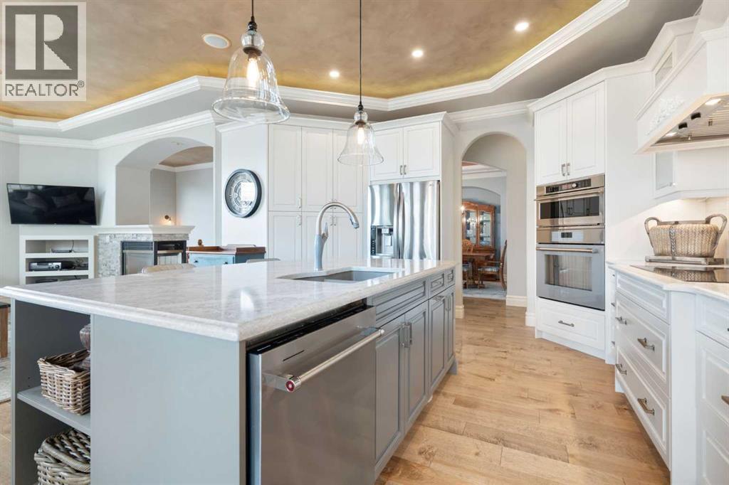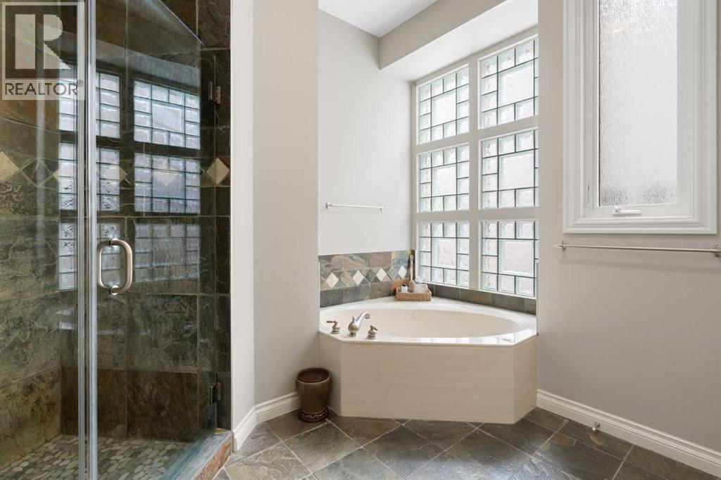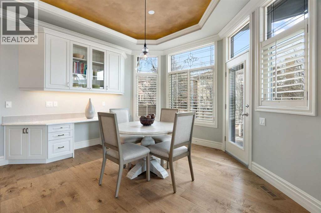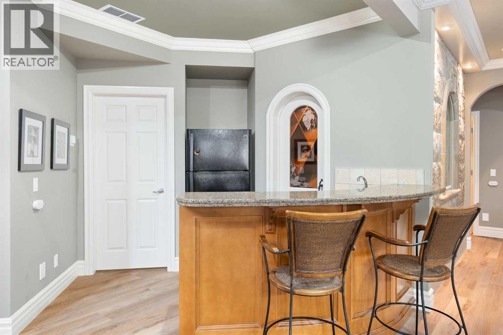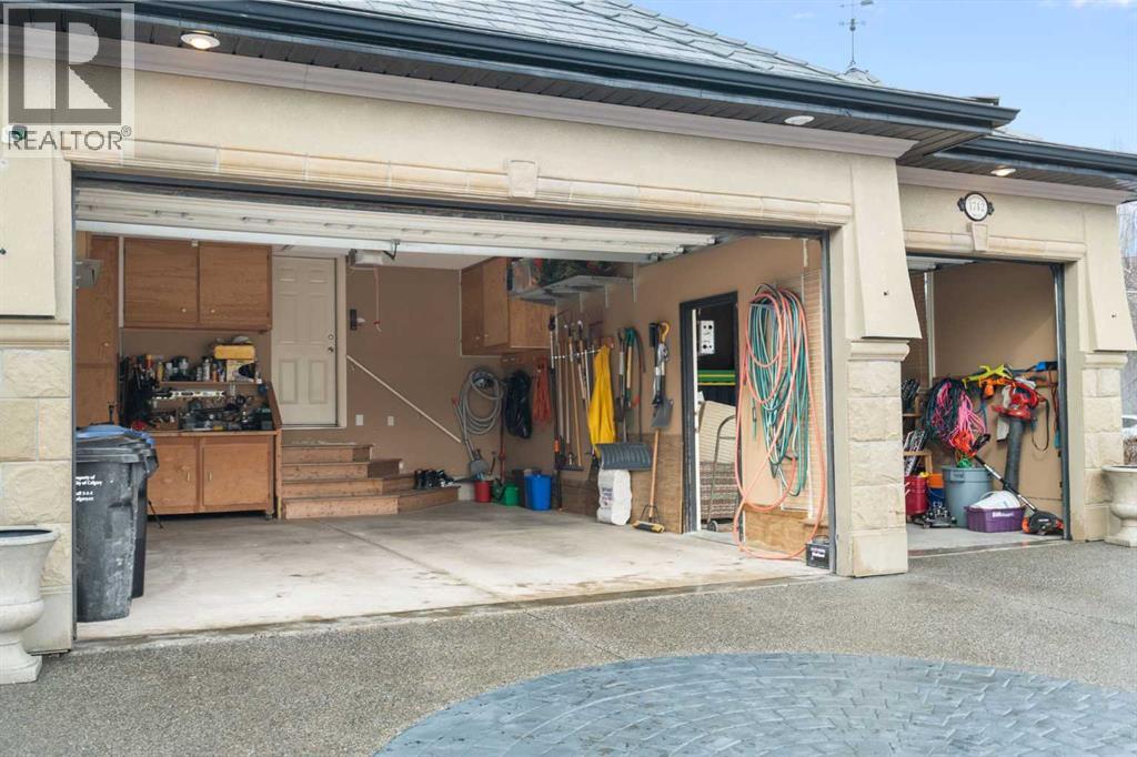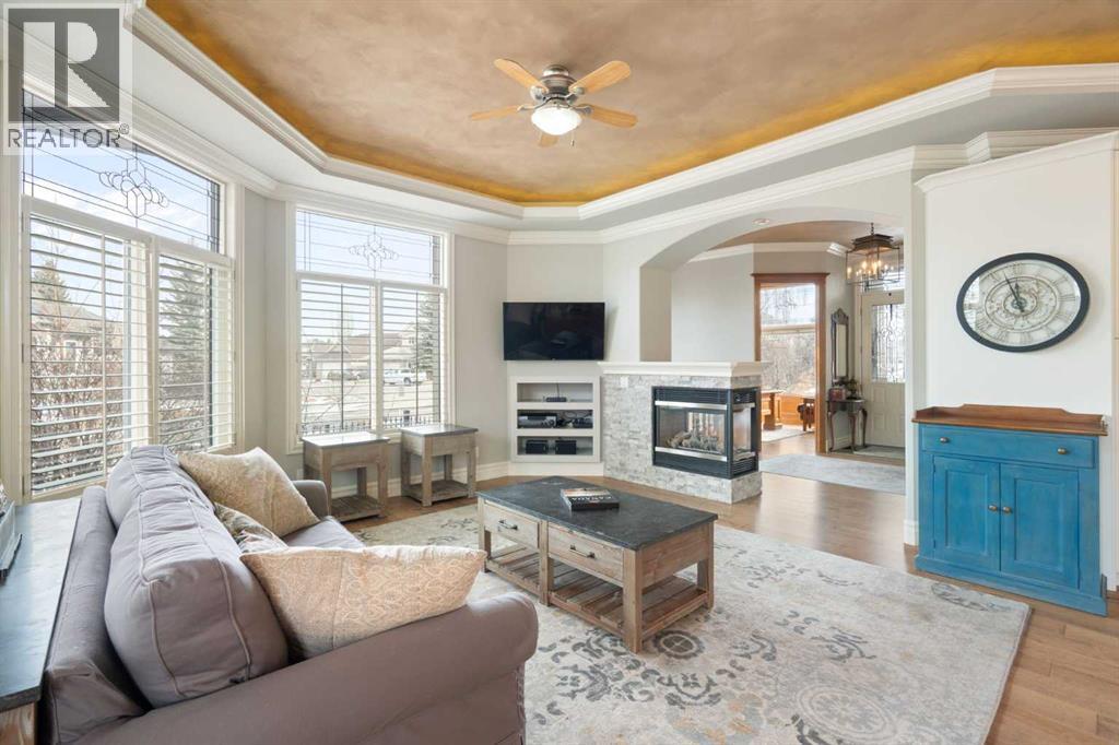 Meticulously updated in 2017, this stunning custom-built ShowHome by California Homes occupies a prime corner lot in the highly sought after Evergreen Estates, seamlessly combining timeless elegance with modern sophistication. Boasting over 3,300 sq. ft. of beautifully finished living space, the home offers 4+1 spacious bedrooms, 3 bathrooms, a triple attached garage, in-floor heating on the lower level, a wet bar, Wine room, an irrigation system, central air conditioning and MORE. The extraordinary backyard is designed with maintenance free living, featuring grey paving stones artfully arranged in circular patterns, while the front driveway and garage share the same premium paving, uniting the home’s exterior with understated sophistication. Step through the welcoming entry and experience immediate architectural elegance. Rich engineered hardwood flooring lead to the formal dining room, where a multi-tier tray ceiling with intricate detailing and decorative crown moulding that commands attention. Graceful archways frame the space, creating the perfect setting for both intimate dinners and grand entertaining. The chef’s dream kitchen is a masterclass in design and functionality, with custom maple cabinetry accented by crown moulding throughout the home, premium granite countertops, a generous central island, and newer (2022) stainless steel appliances package. Expansive windows bathe the main floor in natural light, creating a bright, warm, and inviting atmosphere throughout. The main level is further enhanced by a spacious home office that can be easily converted into a guest bedroom. A thoughtfully designed mudroom with the additional cabinetry for storage, blending style with practicality. The primary suite on the main floor offers a serene retreat, featuring a spa like 5 pc ensuite with jetted tub, dual vanities, and an expansive walk-in closet. Ascend to the fully finished lower level, with 3 additional generously sized bedrooms, a massive family/game roo m(pool table included), a 4-piece bathroom, and a well-appointed wine room with a wet bar. In-floor heating for added comfort and warmth. Located in an unmatched setting, that offers effortless access to schools, shopping, public transit, with seamless access via Stoney Trail, while the natural beauty of Fish Creek Park is just moments away. Rarely does a property of this caliber come to market, schedule your private showing today to experience it for yourself. (id:51989)