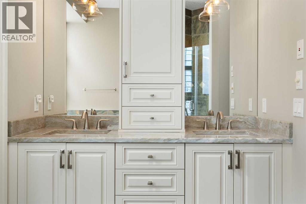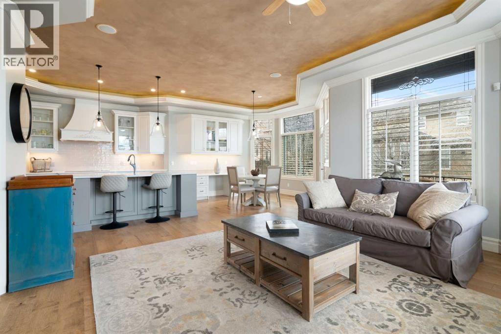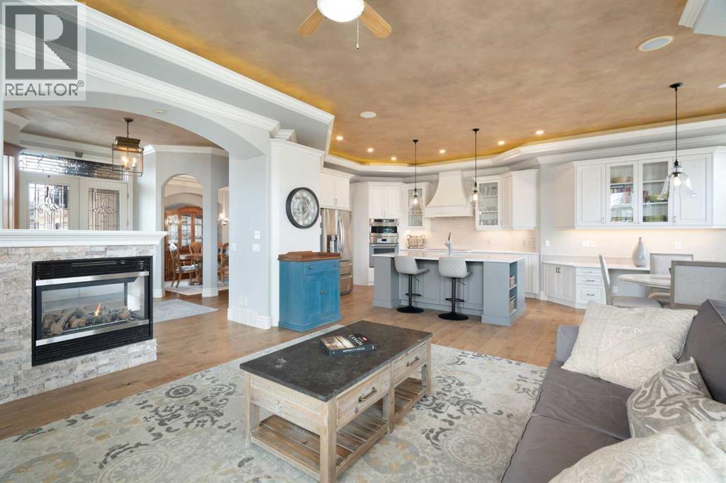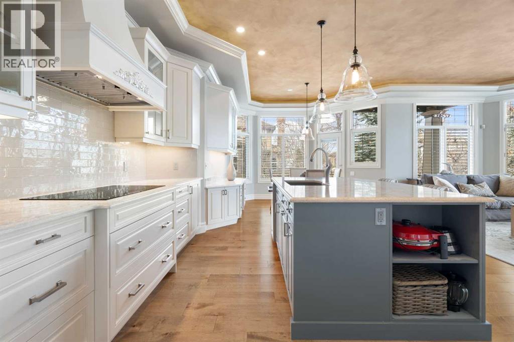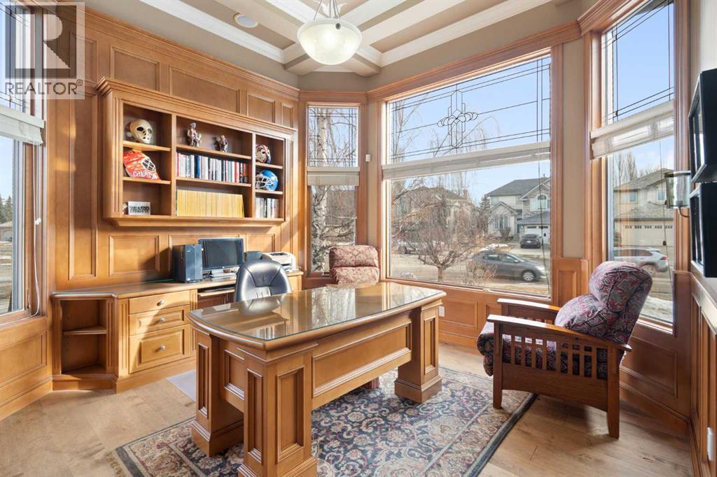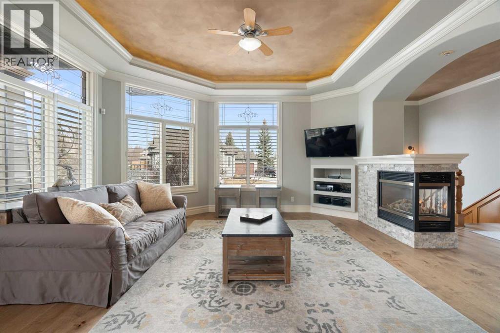 Meticulously updated in 2017, this stunning custom-built ShowHome by California Homes occupies a prime corner lot in the highly sought after Evergreen Estates, seamlessly combining timeless elegance with modern sophistication. Boasting over 3,300 sq. ft. of beautifully finished living space, the home offers 4+1 spacious bedrooms, 3 bathrooms, a triple attached garage, in-floor heating on the lower level, a wet bar, Wine room, an irrigation system, central air conditioning and MORE. The extraordinary backyard is designed with maintenance free living, featuring grey paving stones artfully arranged in circular patterns, while the front driveway and garage share the same premium paving, uniting the home’s exterior with understated sophistication. Step through the welcoming entry and experience immediate architectural elegance. Rich engineered hardwood flooring lead to the formal dining room, where a multi-tier tray ceiling with intricate detailing and decorative crown moulding that commands attention. Graceful archways frame the space, creating the perfect setting for both intimate dinners and grand entertaining. The chef’s dream kitchen is a masterclass in design and functionality, with custom maple cabinetry accented by crown moulding throughout the home, premium granite countertops, a generous central island, and newer (2022) stainless steel appliances package. Expansive windows bathe the main floor in natural light, creating a bright, warm, and inviting atmosphere throughout. The main level is further enhanced by a spacious home office that can be easily converted into a guest bedroom. A thoughtfully designed mudroom with the additional cabinetry for storage, blending style with practicality. The primary suite on the main floor offers a serene retreat, featuring a spa like 5 pc ensuite with jetted tub, dual vanities, and an expansive walk-in closet. Ascend to the fully finished lower level, with 3 additional generously sized bedrooms, a massive family/game roo m(pool table included), a 4-piece bathroom, and a well-appointed wine room with a wet bar. In-floor heating for added comfort and warmth. Located in an unmatched setting, that offers effortless access to schools, shopping, public transit, with seamless access via Stoney Trail, while the natural beauty of Fish Creek Park is just moments away. Rarely does a property of this caliber come to market, schedule your private showing today to experience it for yourself. (id:51989)