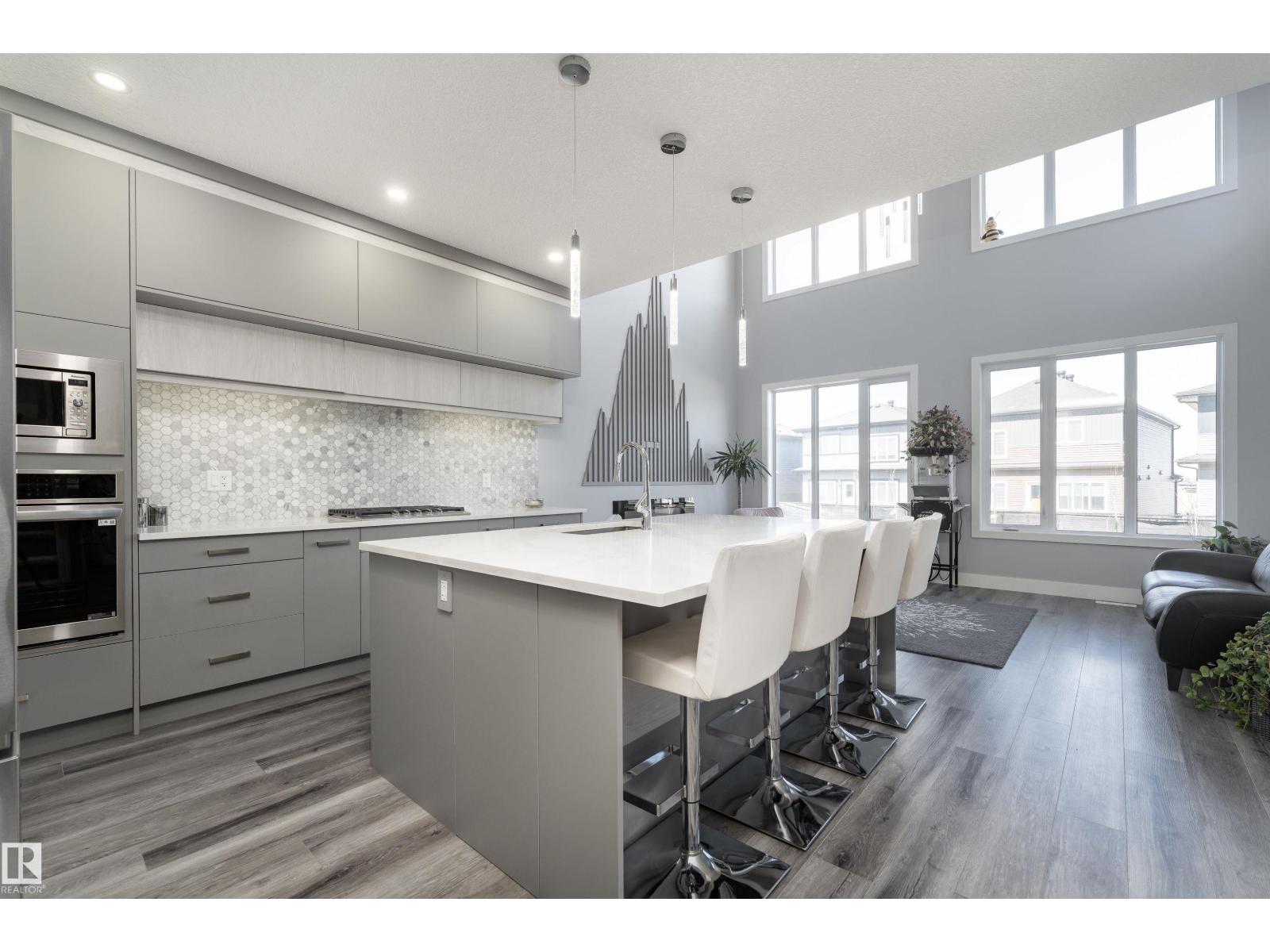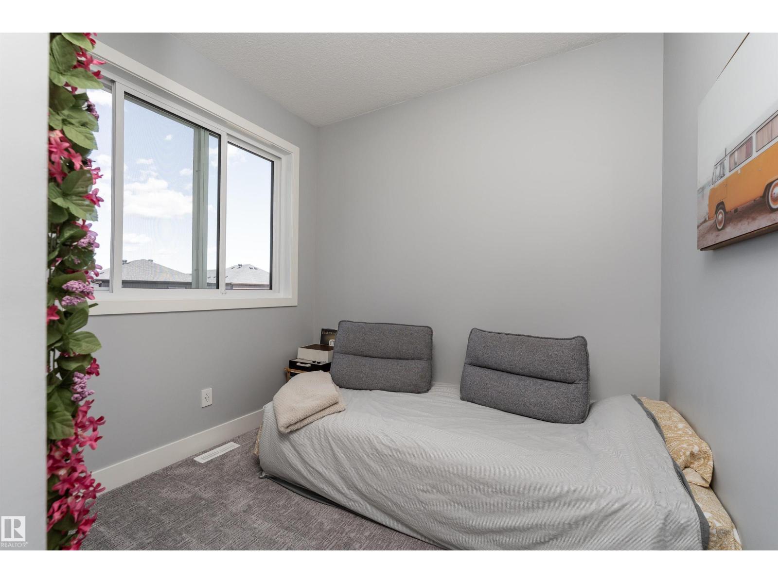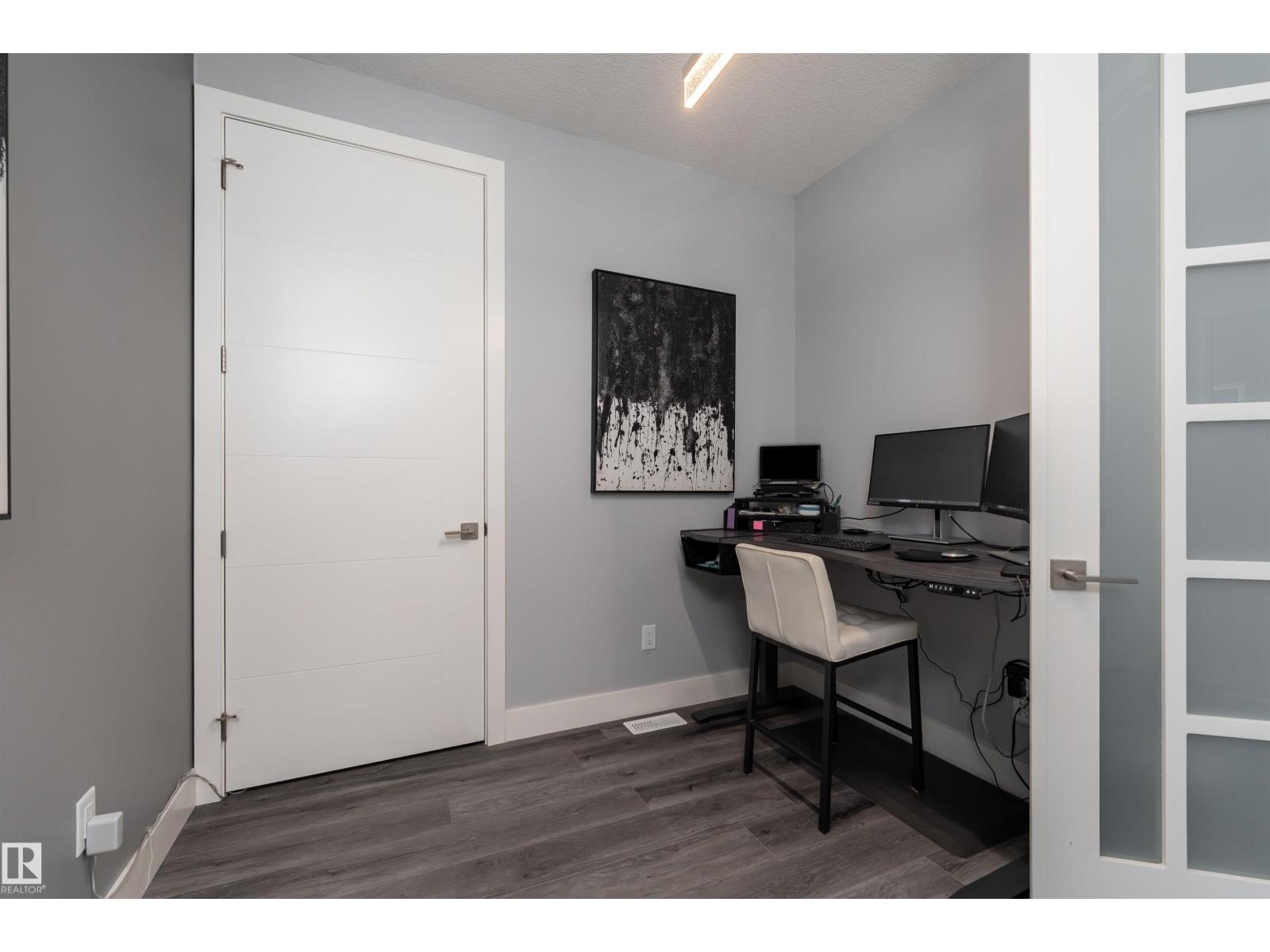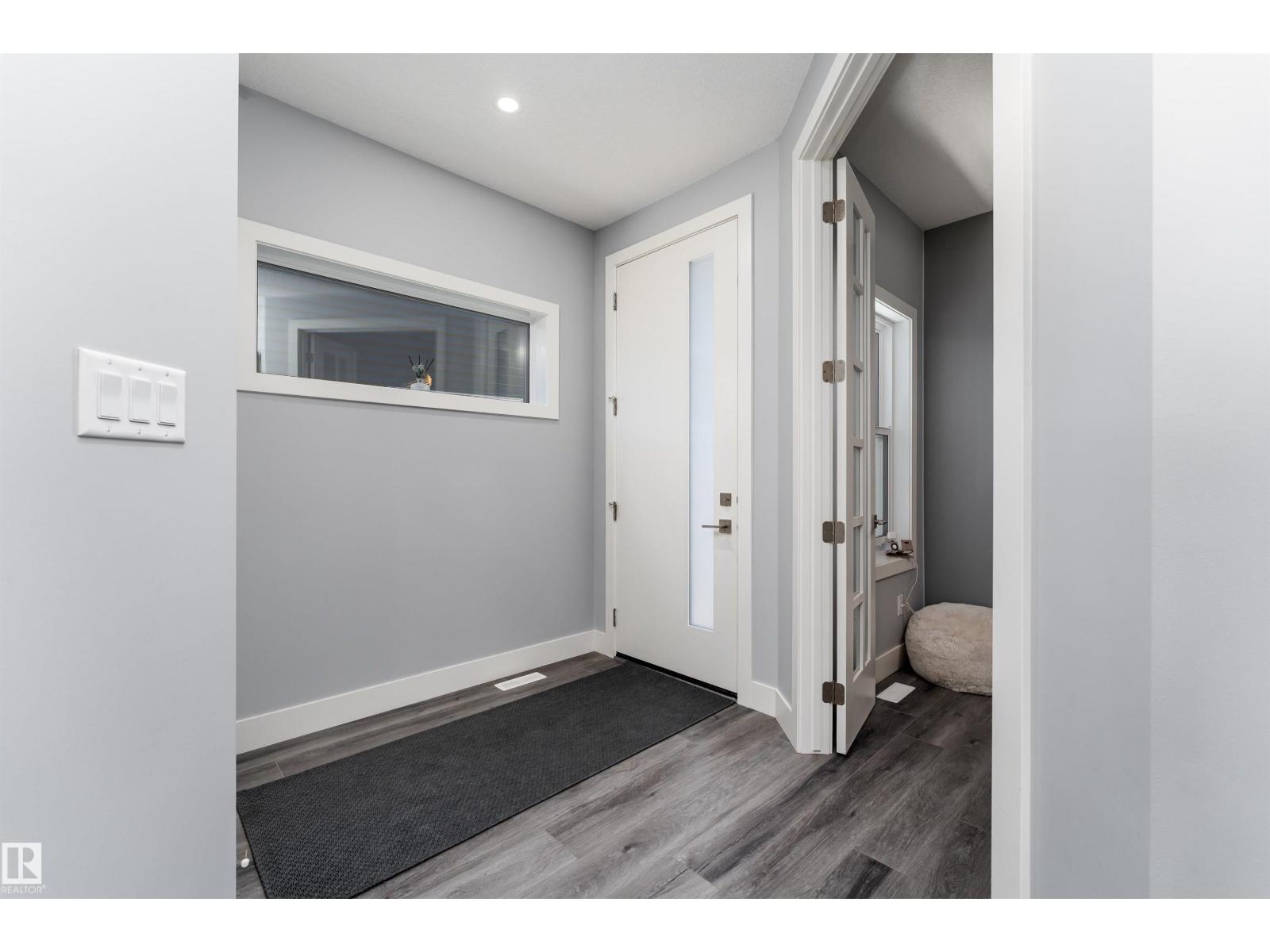 Exceptional customized home located in the up-and-coming community of Fenwyck, backing onto a walking trail. Move-in ready with a fully fenced and landscaped backyard. The main floor features a versatile bedroom currently used as an office, along with 9 ft ceilings and open-to-above design filled with natural light from large windows. The chef-inspired kitchen boasts a gas cooktop, built-in oven, walk-through pantry, and a massive quartz island with matching countertops and modern finishes. Upstairs, you’ll find three additional bedrooms including a spacious primary retreat with a spa-like ensuite. High-end finishes and hardware are showcased throughout, complemented by glass railings, triple-pane windows, closet organizers. Built with 2x6 exterior walls, this home offers improved insulation and long-term durability. A separate side entrance provides future suite potential. This is a gem of a home that shows 10/10, with a bright, airy feel throughout and outstanding craftsmanship evident in every detail. (id:51989)