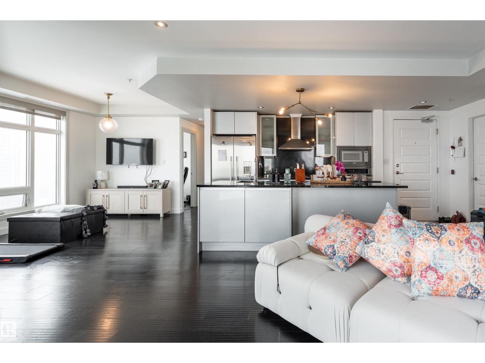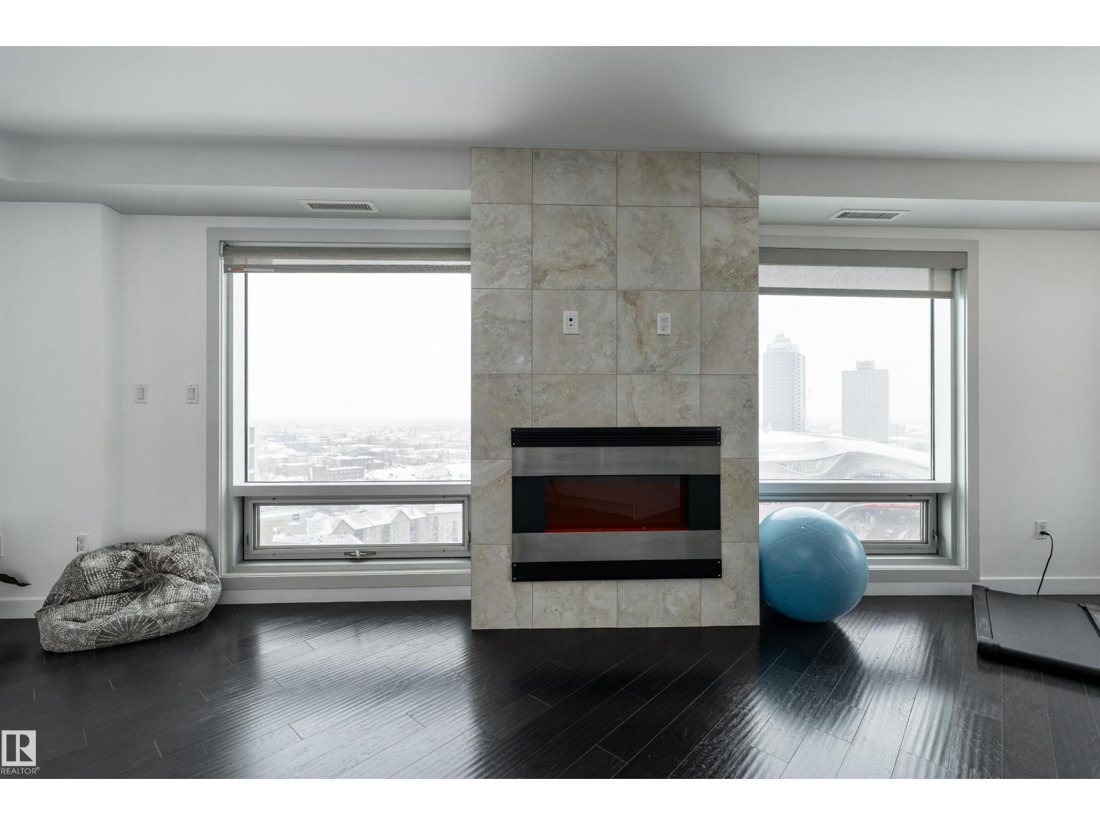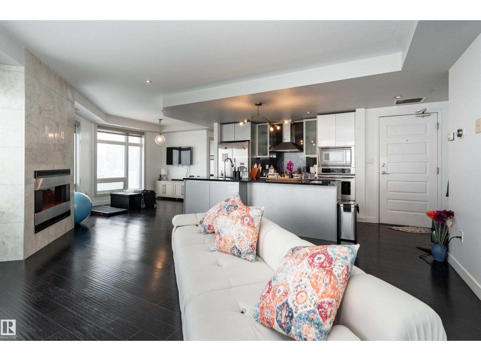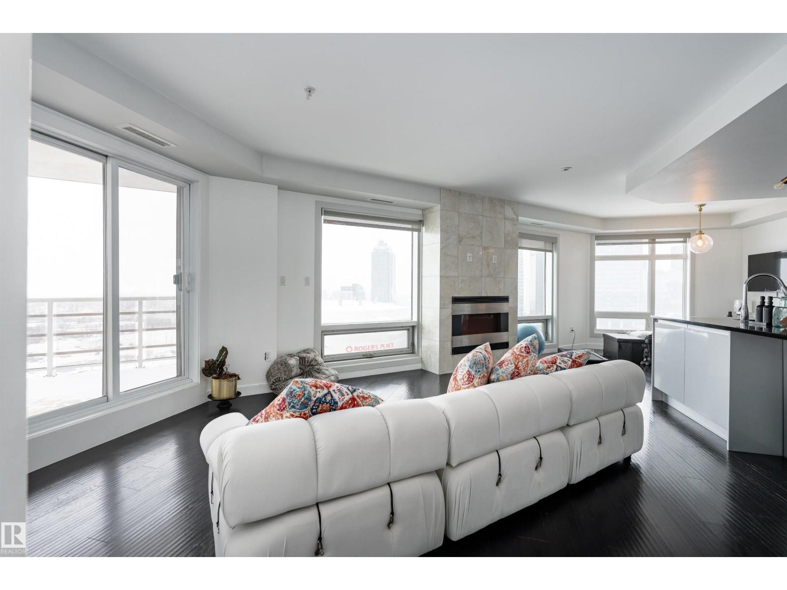 ABOVE IT ALL, RIGHT AT HOME, RIGHT WHERE YOU BELONG. Wake up to soft morning light over the downtown and unwind with sunset skies from your balcony as skyline glows around you. This SUB-PENTHOUSE offers a refined retreat in the heart of the bustling capital city, elevating everyday living. Step inside to a sophisticated black and white motif with crisp, clean lines, sleek cabinetry, stainless steel appliances, rich engineered hardwood flooring, A/C, and a central fireplace that blends modern efficiency with welcoming comfort. Expansive windows frame the skyline and flood the living area with natural light. Discover this 2 bedroom, 1000+ sq ft home, each bedroom featuring its own 4-piece bath, walk-in closet, and balcony, plus a versatile extra room perfect for a home office or gym. PERFECTLY POSITIONED for premier dining, elite shopping, HOCKEY, and entertainment, just minutes from the River Valley walking trails, this is downtown living at its most polished. Come see what your heart already calls home! (id:51989)