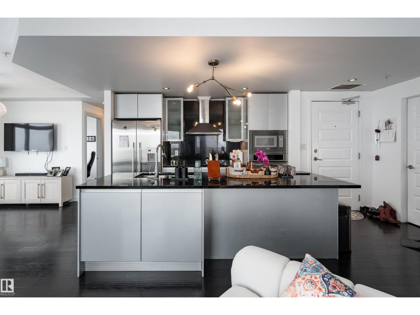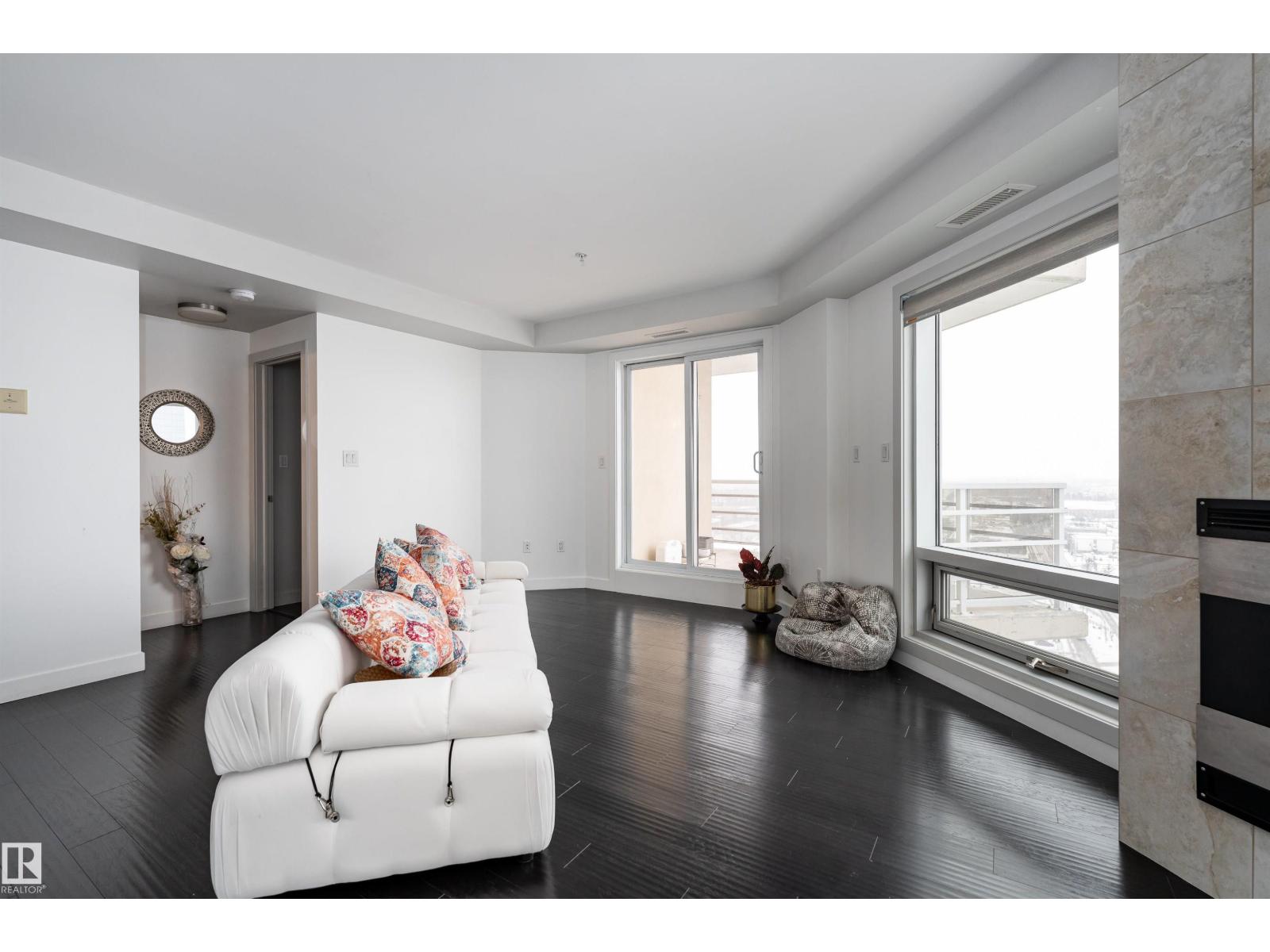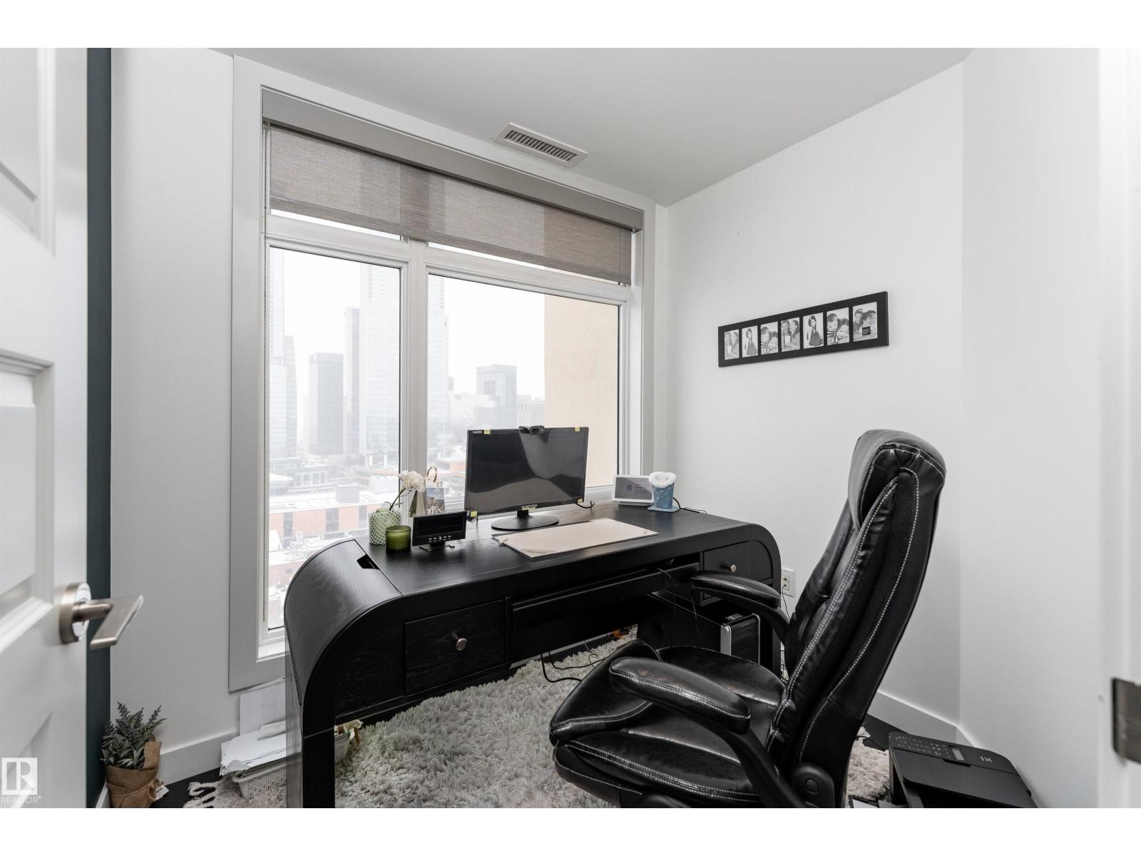ABOVE IT ALL, RIGHT AT HOME, RIGHT WHERE YOU BELONG. Wake up to soft morning light over the downtown and unwind with sunset skies from your balcony as skyline glows around you. This SUB-PENTHOUSE offers a refined retreat in the heart of the bustling capital city, elevating everyday living. Step inside to a sophisticated black and white motif with crisp, clean lines, sleek cabinetry, stainless steel appliances, rich engineered hardwood flooring, A/C, and a central fireplace that blends modern efficiency with welcoming comfort. Expansive windows frame the skyline and flood the living area with natural light. Discover this 2 bedroom, 1000+ sq ft home, each bedroom featuring its own 4-piece bath, walk-in closet, and balcony, plus a versatile extra room perfect for a home office or gym. PERFECTLY POSITIONED for premier dining, elite shopping, HOCKEY, and entertainment, just minutes from the River Valley walking trails, this is downtown living at its most polished. Come see what your heart already calls home! (id:51989)
