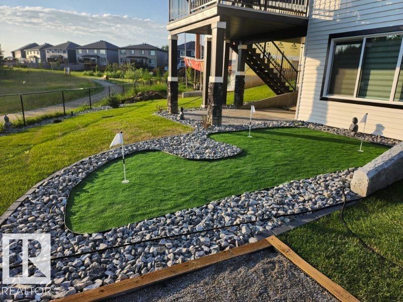 This BETTER-THAN-NEW WALKOUT is a true SHOWSTOPPER, perfectly set on a massive pie lot backing a scenic trail & mature trees. Extensively upgraded, it offers A/C, 4 bedrooms, 3.5 baths & an exceptional 30x34 HEATED TRIPLE garage with 240V power, 10’ RV bay door & rare drive-thru access. A dramatic foyer opens to a sun-soaked main floor with soaring ceilings and stunning open-to-above design. The chef’s kitchen is a statement piece, showcasing sleek cabinetry, oversized pantry, gas range with pot filler & a striking quartz island overlooking the dining area. The living room impresses with a modern electric fireplace & architectural detail. Upstairs, retreat to the king-sized primary suite with California walk-in closet & spa-inspired ensuite with oversized glass shower, plus 2 bedrooms, full bath & upper laundry. The walkout basement features 9’ ceilings, large rec room, 4th bedroom & full bath. The SW-facing yard offers a putting green, epoxy patio & maintenance-free deck, resort-style living at home! (id:51989)