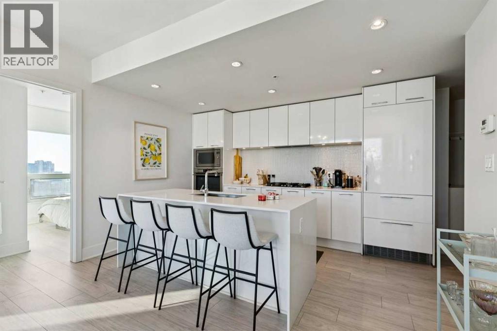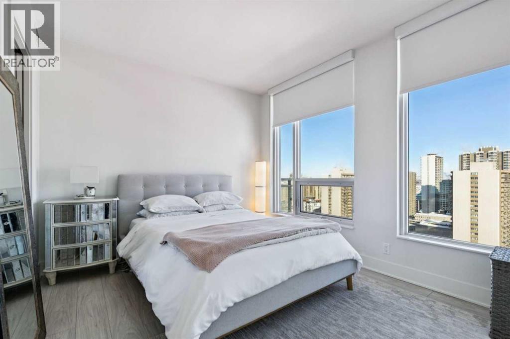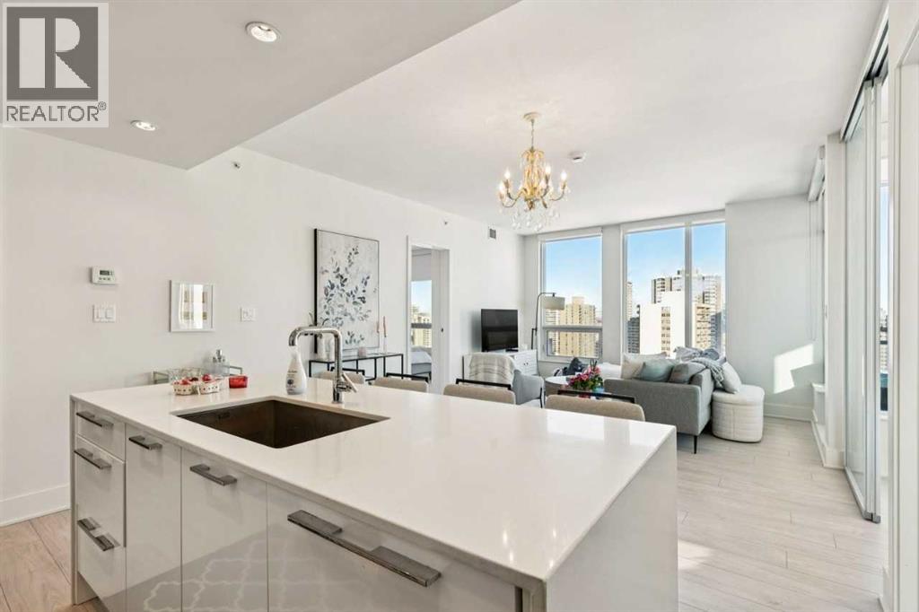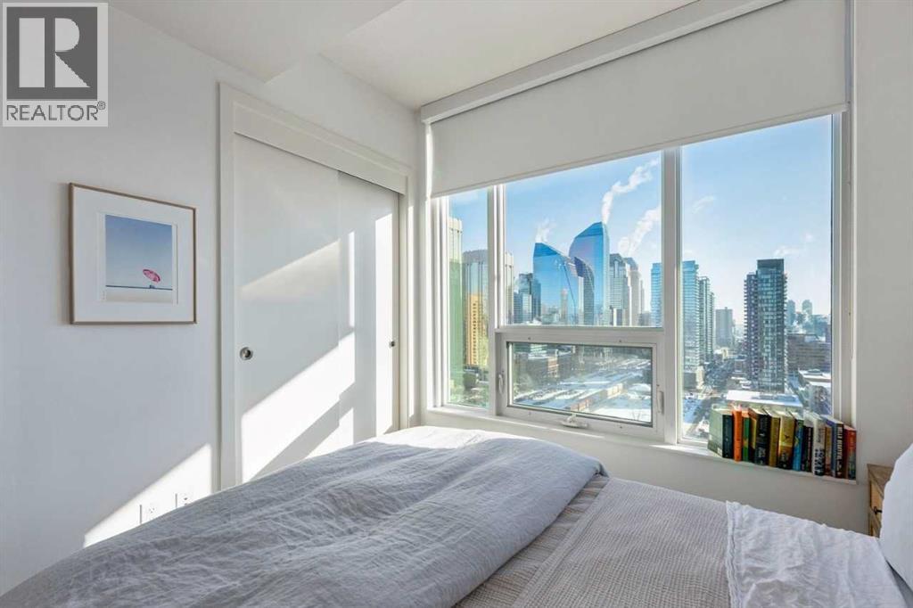 Live, work and play at The Mark on 10th. Perched on the 20th floor, this bright and spacious corner unit offers breathtaking panoramic views of Calgary’s downtown core and the vibrant Beltline. Featuring 2 bedrooms, 2 bathrooms and a private den with sliding glass doors, the thoughtfully designed 909 sq ft layout blends style and function. The contemporary kitchen is appointed with premium German appliances/cabinetry, Kohler fixtures and sleek quartz countertops. A custom walk-in closet, blackout blinds in both bedrooms and a private balcony create a sophisticated retreat above the city.Enjoy luxury amenities including full-time concierge, secure parcel lockers, a stunning 34th-floor rooftop with two-level lounge, hot tub, sauna, steam room and fitness centre, plus a garden terrace and guest suite on the 3rd floor. Includes a rare titled oversized parking stall (approx. 1.5 stalls) and storage locker. Steps to cafés, restaurants, groceries, LRT, 17th Ave and the Bow River pathways. (id:51989)