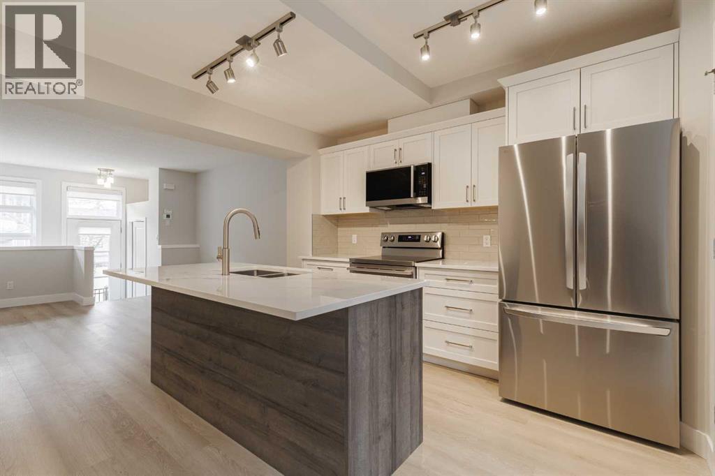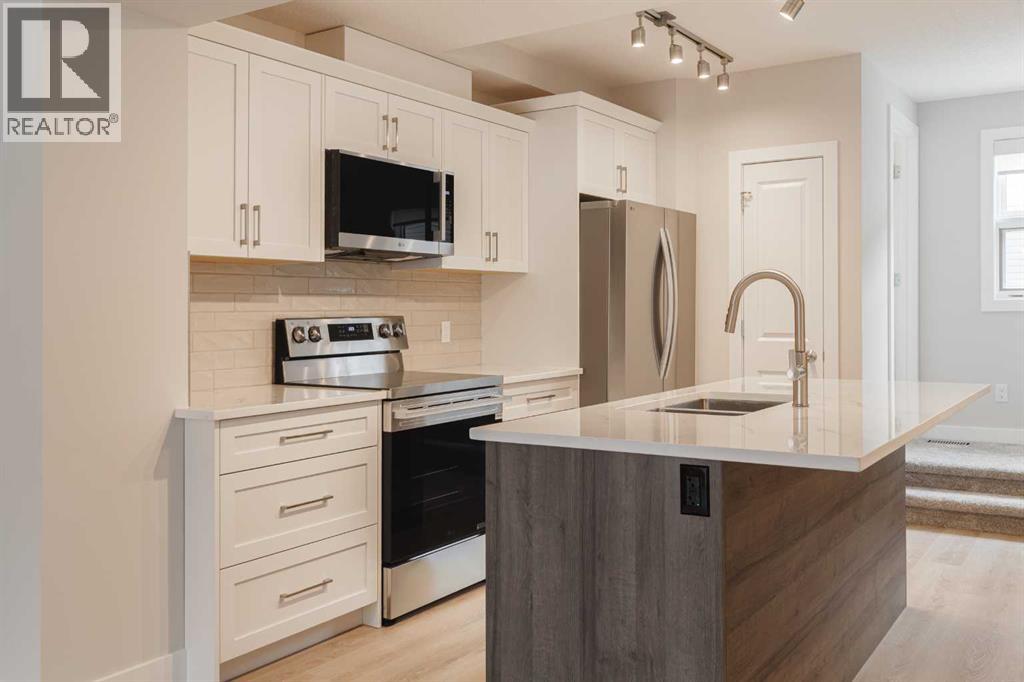 Welcome to this professionally renovated 2-bedroom, 3-bathroom townhome in the highly sought-after Mosaic of Aspen Hills—a quiet, beautifully maintained, and pet-friendly community. Thoughtfully designed to maximize both space and functionality, the open-concept main floor offers a bright and inviting atmosphere, perfect for entertaining or everyday living. Large windows flood the home with natural light, enhancing the clean, modern aesthetic throughout. The gourmet kitchen is a true standout, featuring contemporary cabinetry, stainless steel appliances, and a stunning quartz island—ideal for hosting family and friends. Elegant luxury vinyl plank flooring runs throughout the main level, combining style with durability. A convenient 2-piece bathroom completes this floor. Upstairs, you’ll find two spacious bedrooms, a full bathroom, and a dedicated laundry area. The primary suite offers a private retreat with its own 4-piece ensuite. Step outside to your large concrete patio overlooking the beautifully maintained courtyard—an ideal space to relax, unwind, or enjoy summer evenings. Tandem double garage. Located just minutes from Aspen Landing, Westside Recreation Centre, C-Train access, and top-rated schools, this home offers exceptional convenience. Enjoy nearby parks, pathways, and playgrounds, with easy access to downtown, Stoney Trail, and the mountains. Move-in ready and beautifully upgraded—this is Aspen living at its best. Book your private showing today. (id:51989)