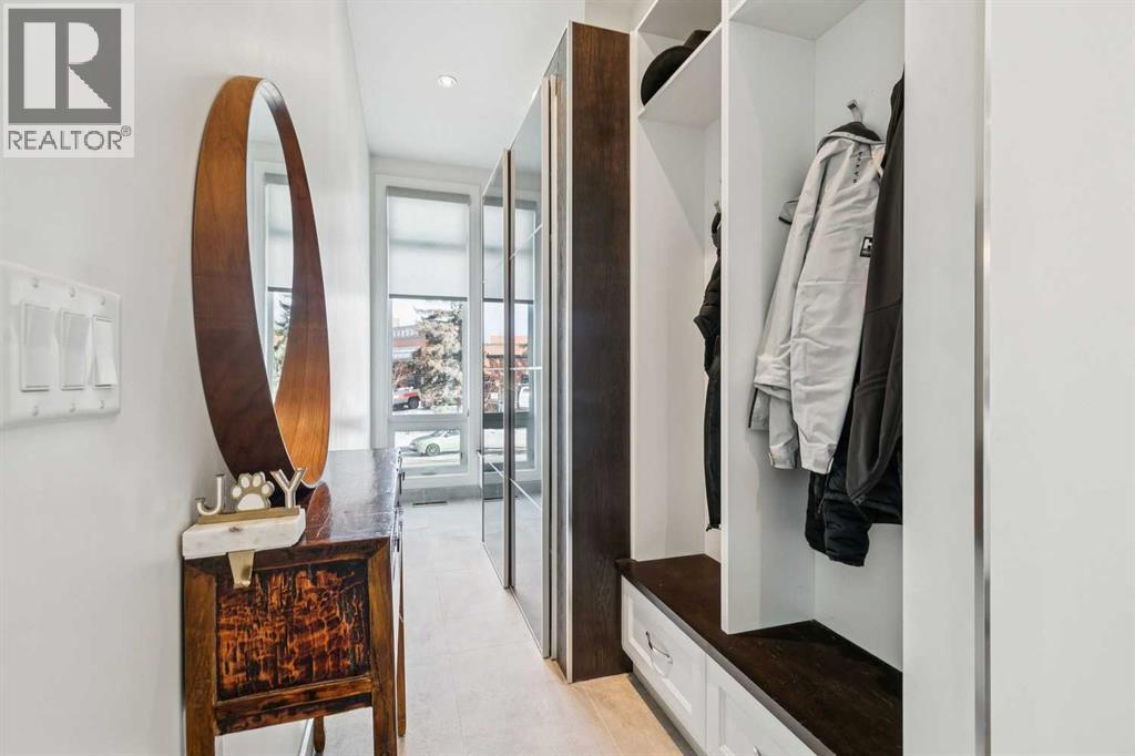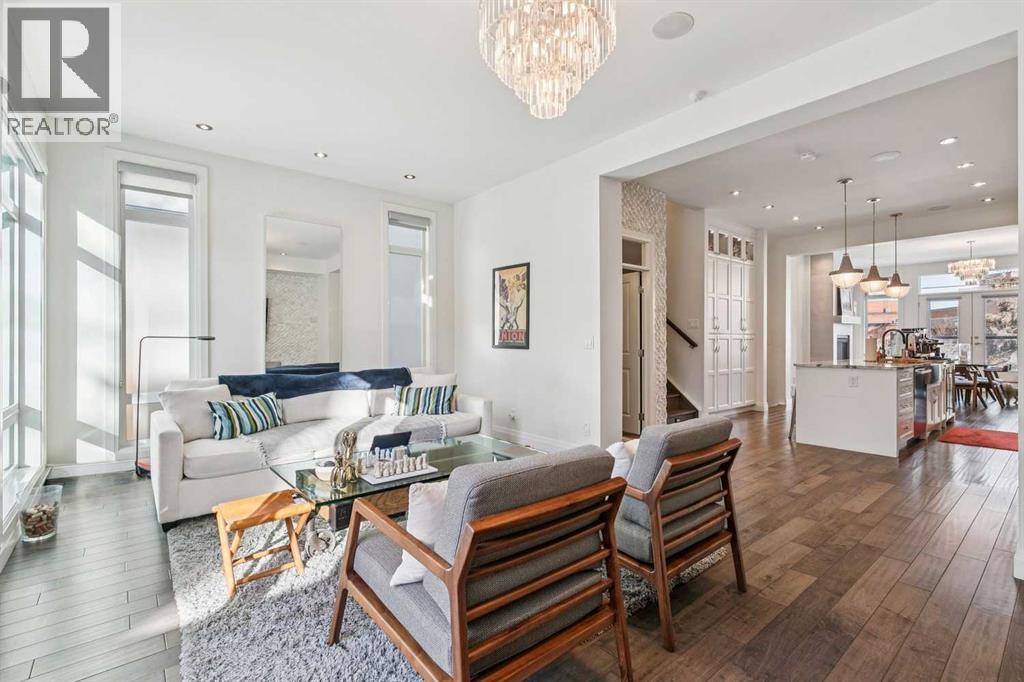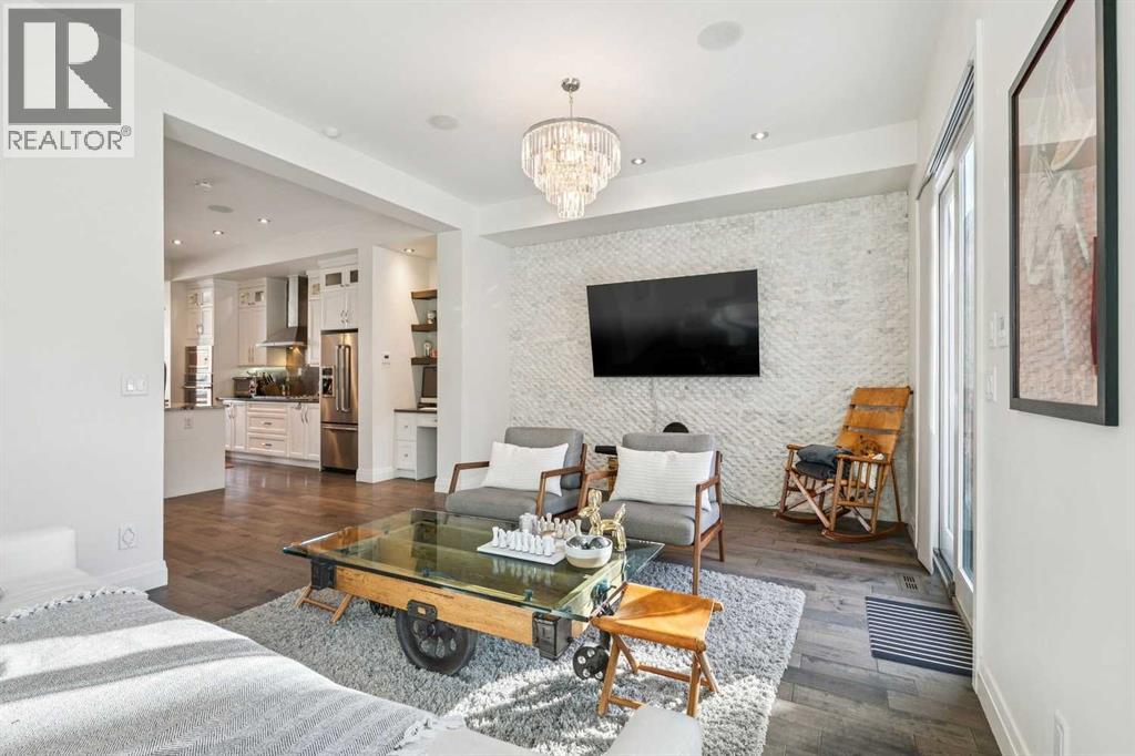 Front attached garage in the inner City!! Rare find. This high end custom executive home features; Kohler sinks and toilets throughout, Riobel faucets throughout, granite in all bathrooms and laundry room, flat ceiling throughout, locker system in the front hall, feature stone wall in the living room and stairwell, built in sound system, frosted privacy windows in the living room, 6 burner gas stove, wine fridge, shadow boxes in the kitchen, walk in closets with wood builtins in all bedrooms, central air conditioning, epoxy flooring in the garage, exposed aggregate driveway and walkways, gas fireplace on the rear deck, rooftop deck with all day sun and views of downtown.........Wow. The floorplan is open and bright with floor to ceiling windows. The dining room and living room areas could be reversed depending on the buyers preference. Large gourmet kitchen with a huge island and feature backsplash and hoodfan. Three large bedrooms upstairs all with walkin closets with wood built in organizers. The basement offers a 13x18 flex room with a 3pc bath and walkin closet. Ideal for a home gym, gear room or dream teenager bedroom. Two outdoor living spaces, one in the rear yard and the other is a rooftop deck. Great access to downtown, river pathway system and the mountains. (id:51989)