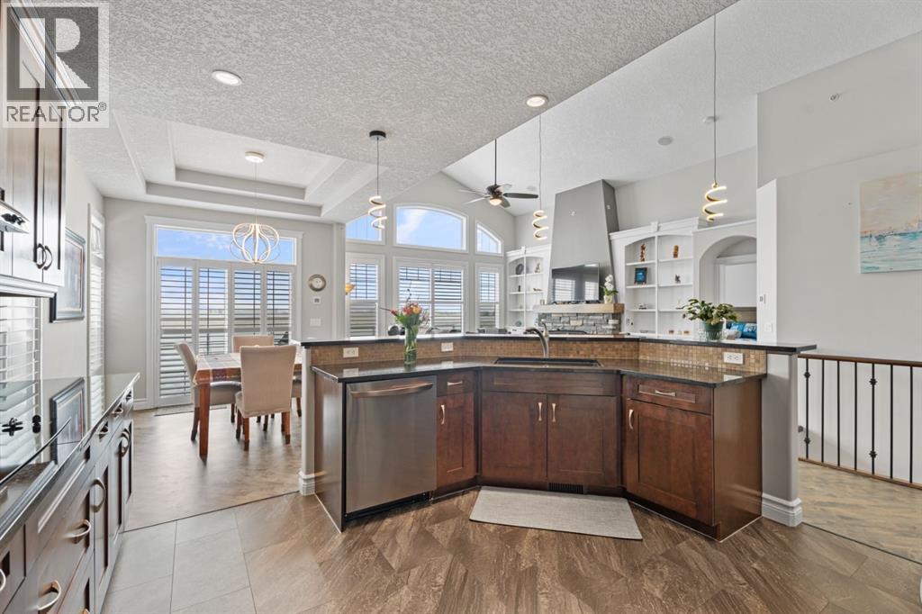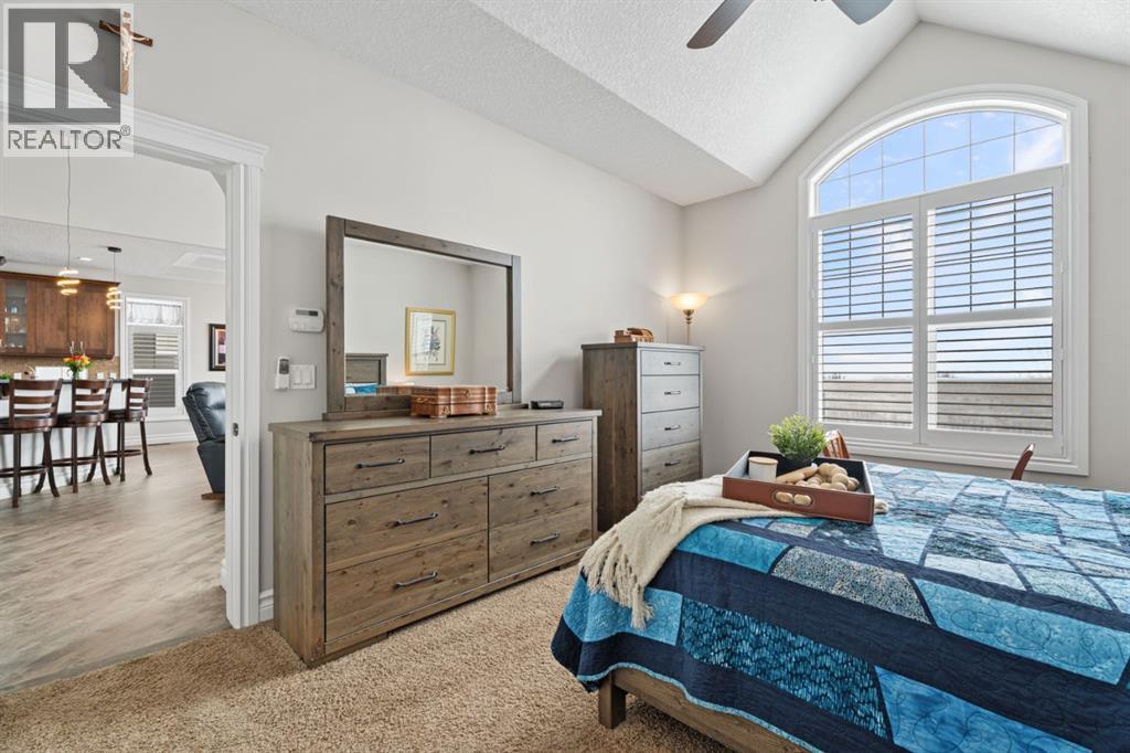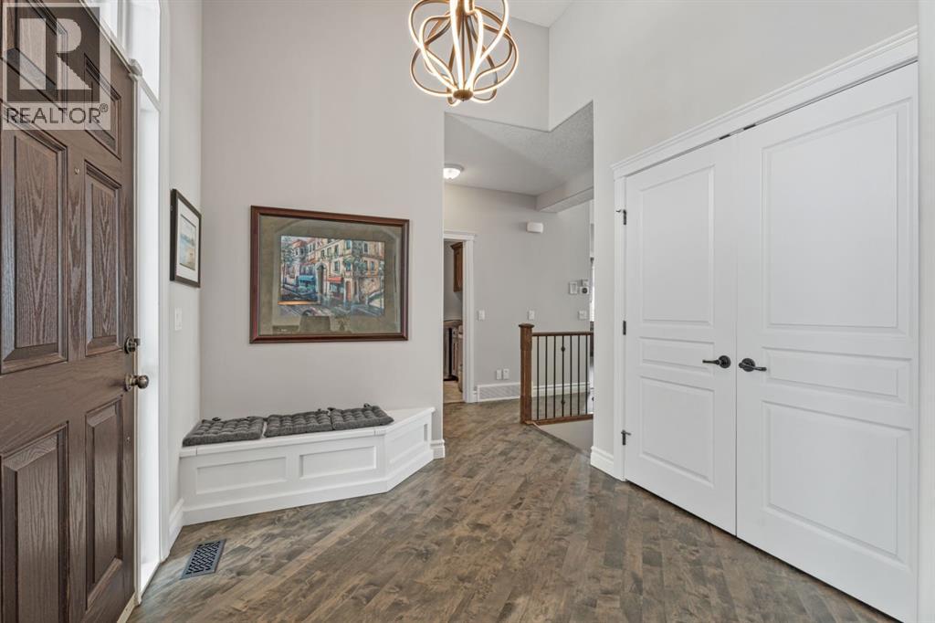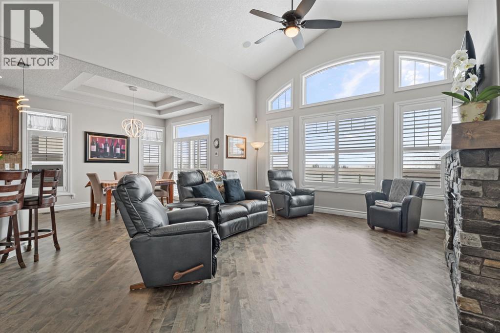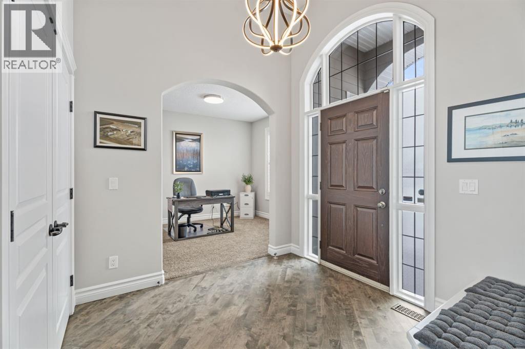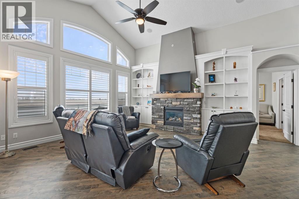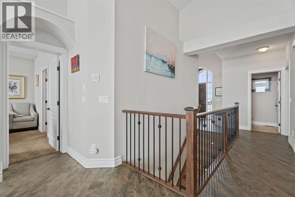 Welcome to golf course living and this beautiful well maintained walk out bungalow in the country. As you step inside, you will marvel at the large foyer and open floor plan, vaulted ceilings, refurbished hardwood floors and upgraded luxury vinyl tile in the kitchen and pantry. Take in the abundance of natural light from the large living room and pocket windows in the kitchen. This open and cozy upper main level offers so much space, including a comfortable office/den, large kitchen with granite counters and breakfast bar, walk through pantry with pocket doors and main floor laundry, extended cabinets, built in storage benches and under cabinet lighting. The feature fireplace offers warmth and ambience for those cold winter nights. Enjoy the oversized garage, extra wide driveway, work bench and tool wall for working on various projects with plenty of shelving for storage. Enjoy the pristine view of wildlife and golfers off of the large deck and invite neighbours, family and friends to join you on the aggregate patio below. The front and backyard are fully landscaped and an automatic underground sprinkler system is in place. This community is 30 minutes from Calgary, 20 minutes to Chestermere and 20 minutes from Strathmore. Enjoy time on the 18 Hole Golf Course, a secure RV Storage lot exclusive to Lakes of Muirfield Residents and the natural landscapes of country living and wildlife backing onto the canal! Book your showing today with your favourite REALTOR®. (id:51989)