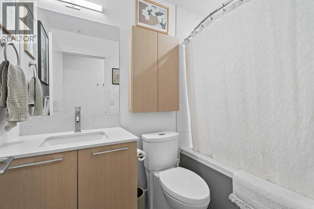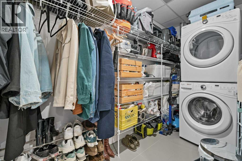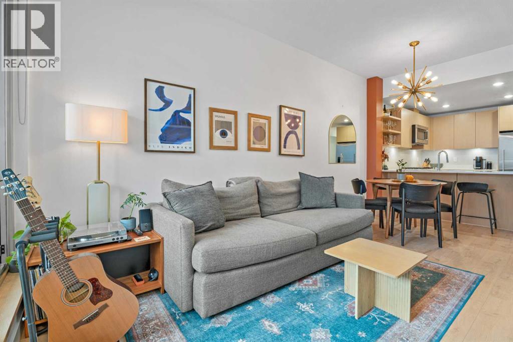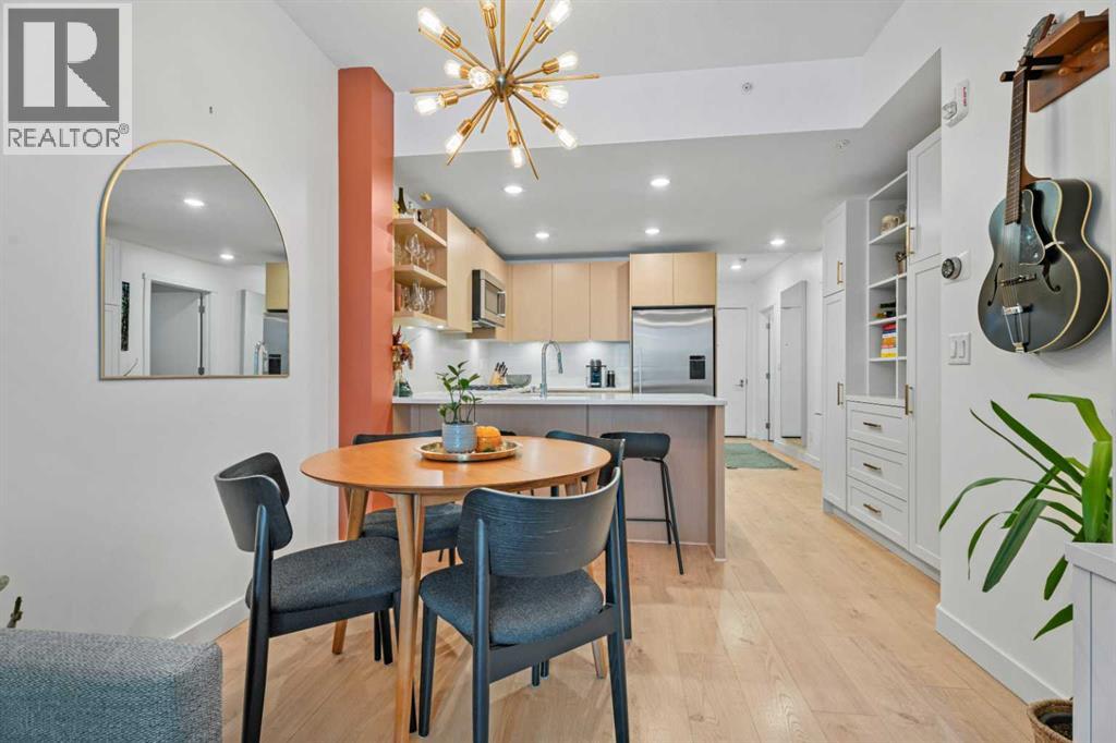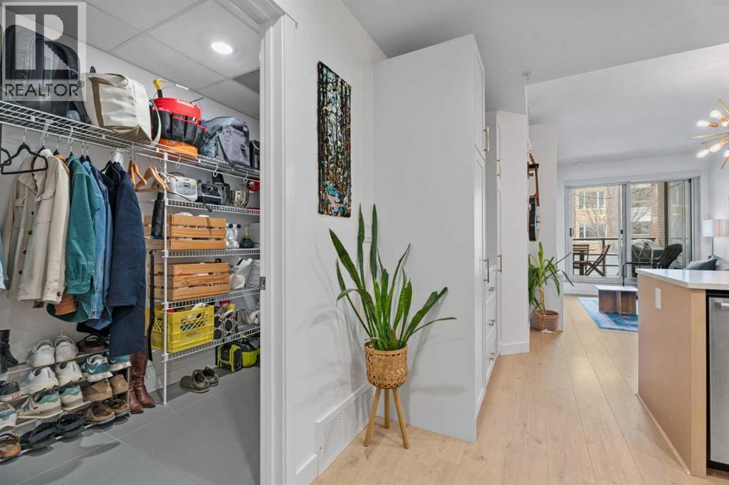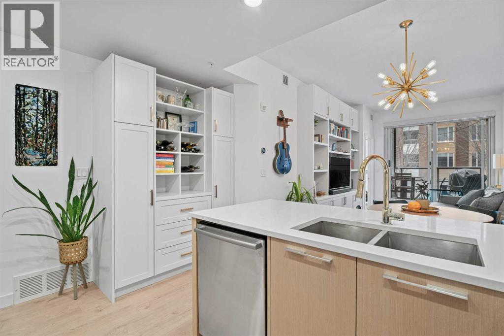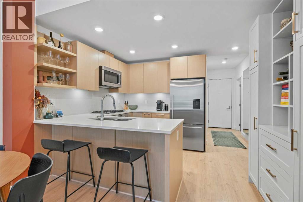 Welcome to Radius, an amenity-rich building offering something for every lifestyle, located in the desirable neighbourhood of Bridgeland. This spacious and extensively upgraded 2-bedroom, 2-bathroom unit features modern finishes and a bright, inviting atmosphere with a soft contemporary design. The well-appointed kitchen includes a built-in oven, gas range, ample counter space, and quality appliances, flowing seamlessly into the open-concept dining and living area complete with beautiful custom built-ins for storage and media. The generously sized primary bedroom offers a walk-in closet with California Closets organizers and a stylish ensuite with automatic floor lighting, a large vanity, and a walk-in shower. The versatile second bedroom is equipped with built-in storage and a Murphy bed with integrated desk attachments, making it ideal for guests or a functional home office. Additional highlights include a rare oversized in-suite storage and laundry room, along with a well-appointed 4-piece main bathroom. Residents enjoy access to exceptional building amenities including concierge and the main gym (1st floor), delivery room (2nd floor), secondary gym (3rd floor), yoga/barre room (4th floor), spin room (5th floor), rooftop patio and gardens with stunning city views (7th floor), dog wash station and bike storage (P1). This unit also comes with titled underground parking, and a dedicated storage room, offering convenience and comfort in one of Calgary’s most vibrant communities. (id:51989)