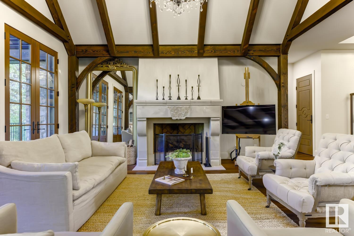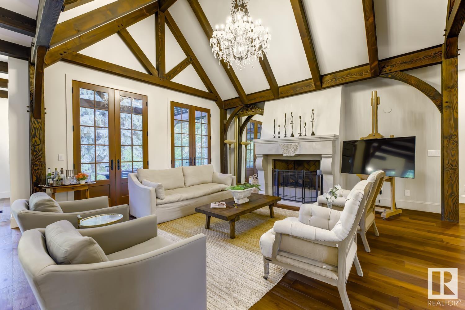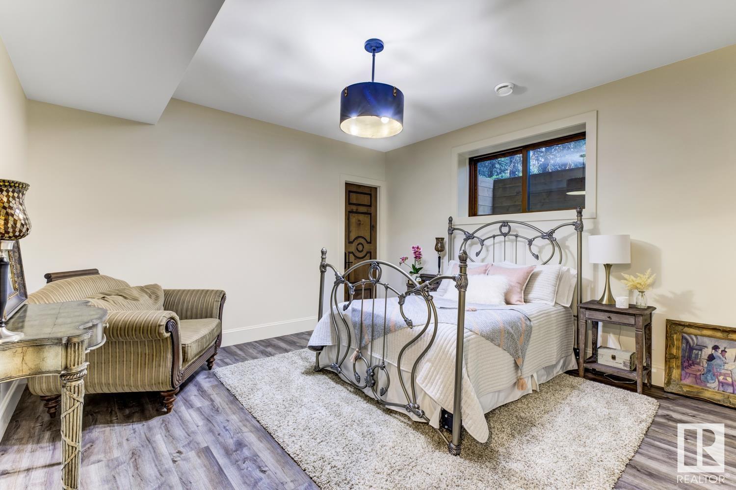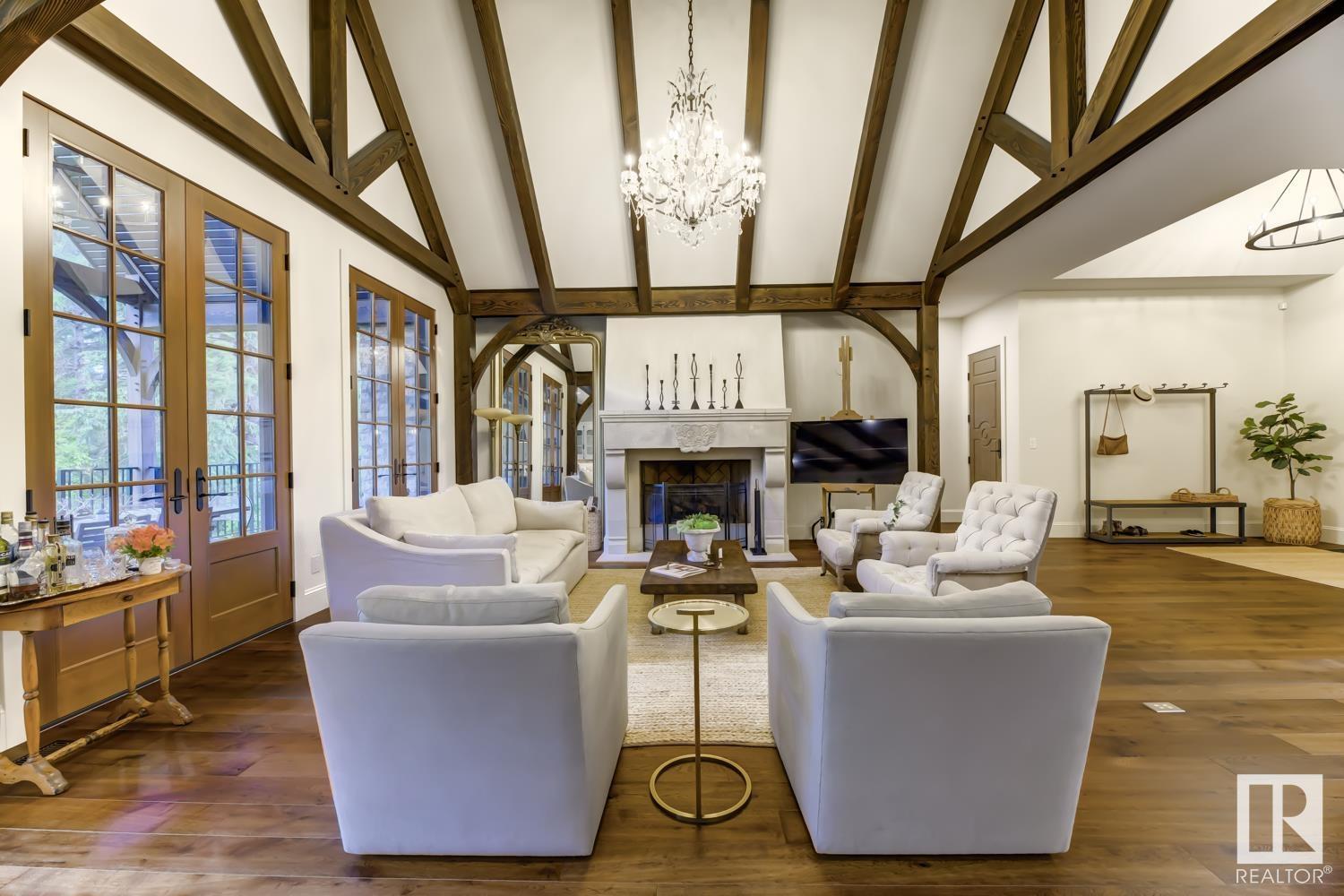 Reminiscent of the stone farmhouses of Burgundy France, experience elegant modern living paired w/ historical charm & exquisite European influence in a private, picturesque setting w/ this one-of-a-kind, executive estate bungalow, nestled on two meticulously landscaped acres in Sturgeon County, mere minutes from both Edmonton & St. Albert. Crafted by Heredity Homes & designed by Nadia Li of Go For Décor, this home blends historical charm w/ modern comfort. Exterior features include natural stone walls & Douglas Fir beams, while inside, smoked white oak floors, wrought iron details, & Belgian linen window treatments create a luxurious ambiance. A centerpiece wood-burning fireplace & vaulted ceilings add grandeur, complemented by a gourmet kitchen w/ Lacanche oven & Miele appliances. The primary suite offers a private deck & spa-like en-suite, while the finished basement feat. 2 bedrooms, sauna, media room, gym, & wet bar. Outside, a carriage house w/ living space & expansive views completes this property. (id:51989)