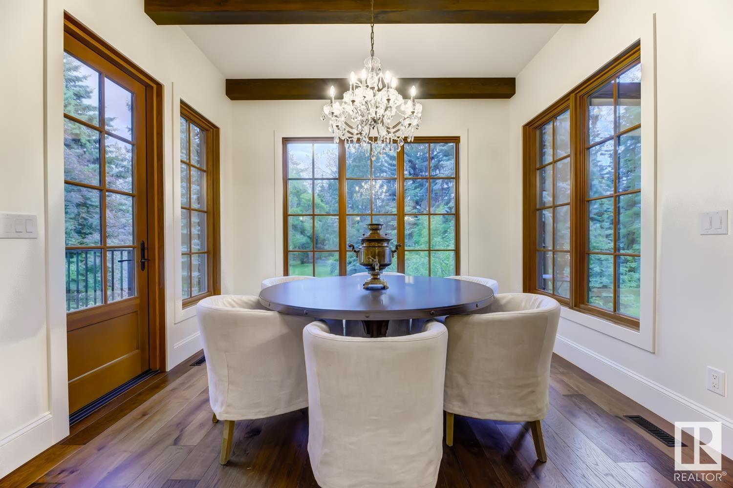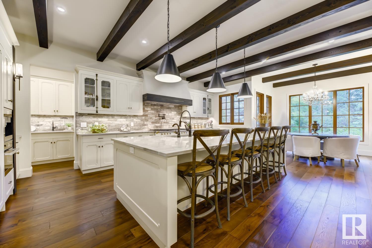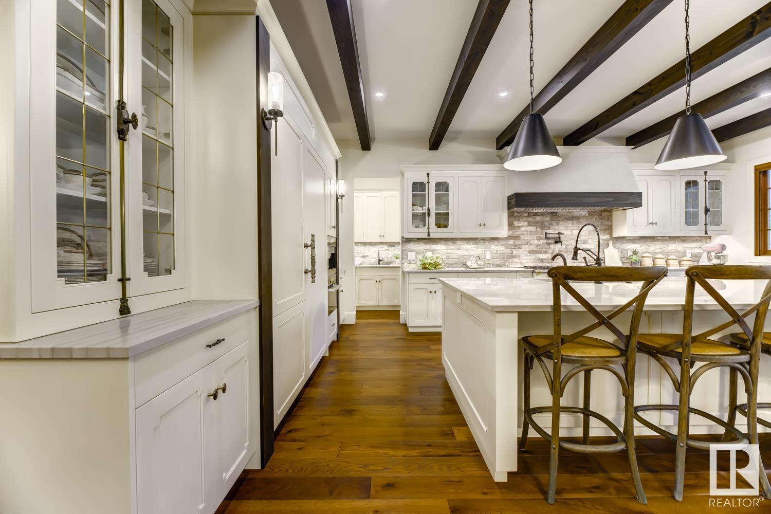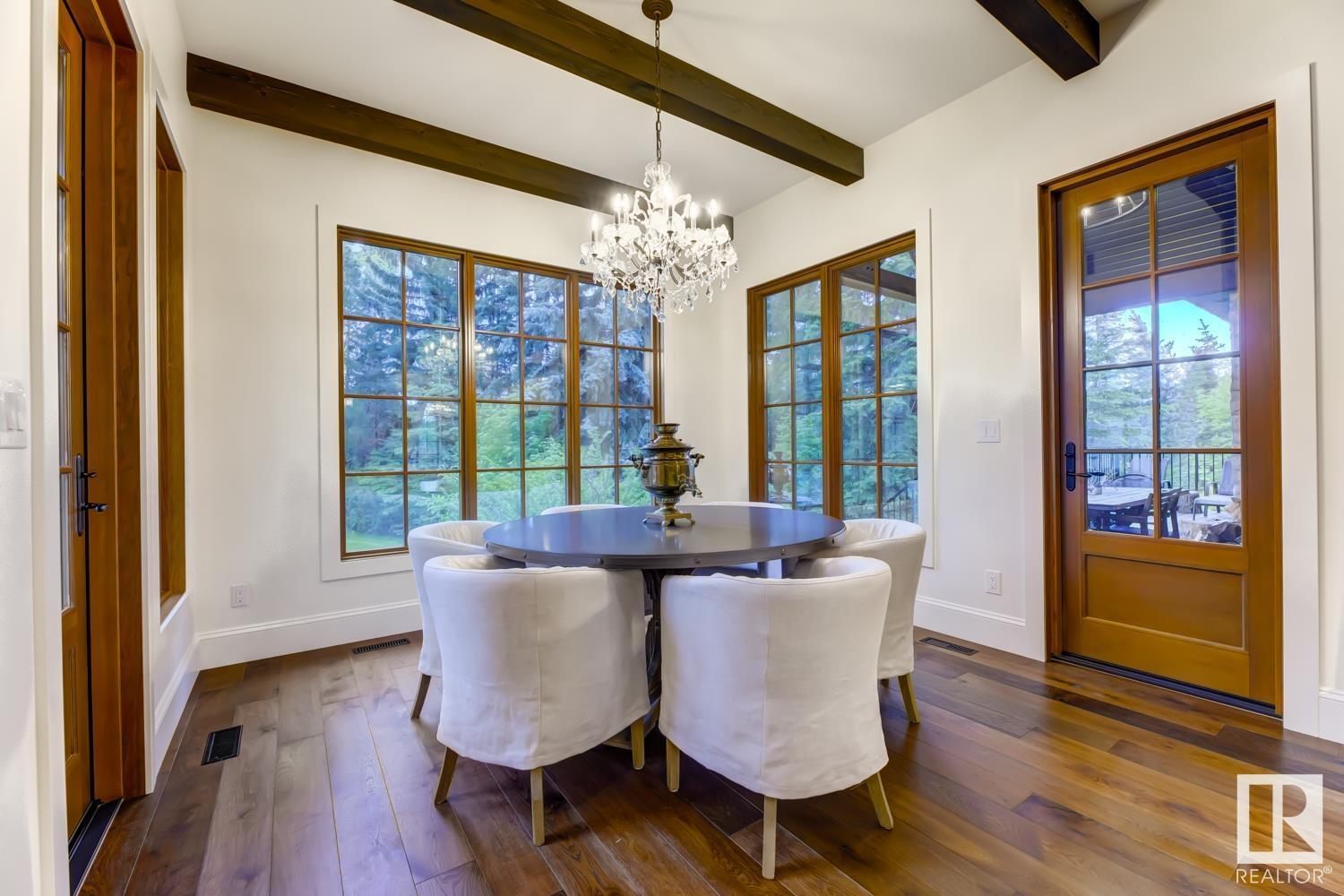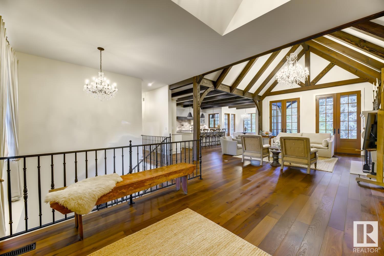 Reminiscent of the stone farmhouses of Burgundy France, experience elegant modern living paired w/ historical charm & exquisite European influence in a private, picturesque setting w/ this one-of-a-kind, executive estate bungalow, nestled on two meticulously landscaped acres in Sturgeon County, mere minutes from both Edmonton & St. Albert. Crafted by Heredity Homes & designed by Nadia Li of Go For Décor, this home blends historical charm w/ modern comfort. Exterior features include natural stone walls & Douglas Fir beams, while inside, smoked white oak floors, wrought iron details, & Belgian linen window treatments create a luxurious ambiance. A centerpiece wood-burning fireplace & vaulted ceilings add grandeur, complemented by a gourmet kitchen w/ Lacanche oven & Miele appliances. The primary suite offers a private deck & spa-like en-suite, while the finished basement feat. 2 bedrooms, sauna, media room, gym, & wet bar. Outside, a carriage house w/ living space & expansive views completes this property. (id:51989)