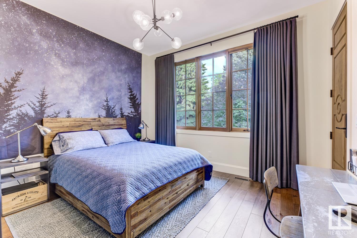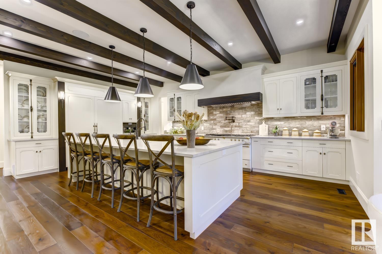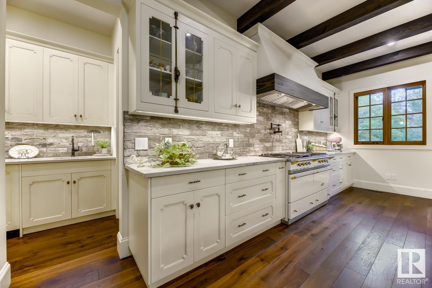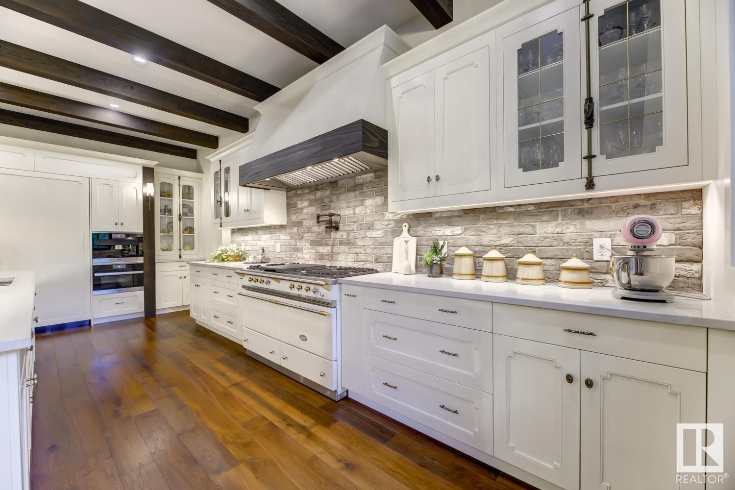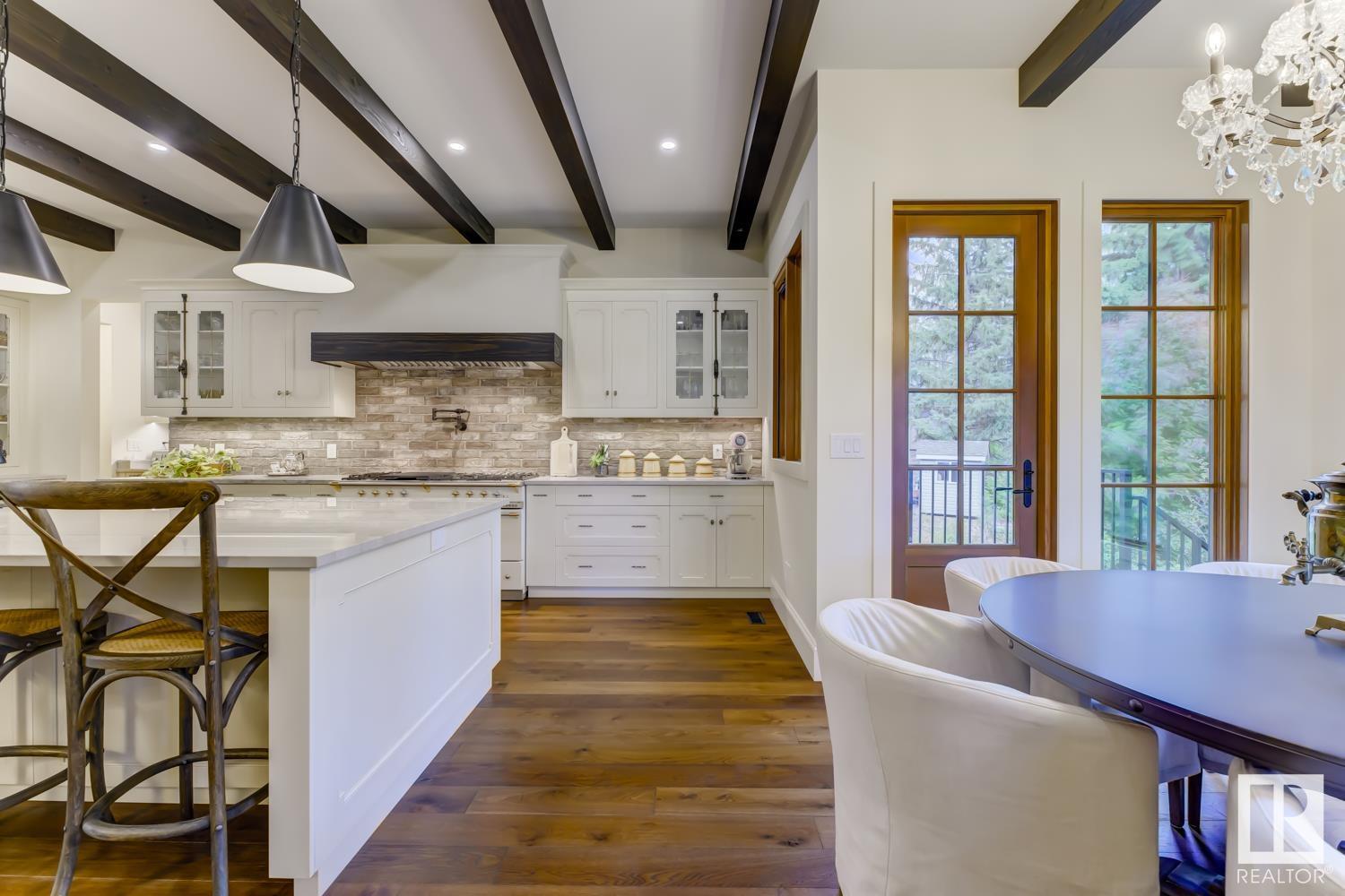 Reminiscent of the stone farmhouses of Burgundy France, experience elegant modern living paired w/ historical charm & exquisite European influence in a private, picturesque setting w/ this one-of-a-kind, executive estate bungalow, nestled on two meticulously landscaped acres in Sturgeon County, mere minutes from both Edmonton & St. Albert. Crafted by Heredity Homes & designed by Nadia Li of Go For Décor, this home blends historical charm w/ modern comfort. Exterior features include natural stone walls & Douglas Fir beams, while inside, smoked white oak floors, wrought iron details, & Belgian linen window treatments create a luxurious ambiance. A centerpiece wood-burning fireplace & vaulted ceilings add grandeur, complemented by a gourmet kitchen w/ Lacanche oven & Miele appliances. The primary suite offers a private deck & spa-like en-suite, while the finished basement feat. 2 bedrooms, sauna, media room, gym, & wet bar. Outside, a carriage house w/ living space & expansive views completes this property. (id:51989)