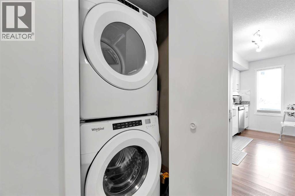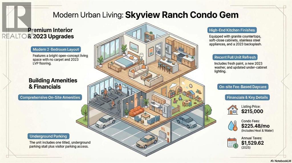 What a Gem! Yes - this one is as good as it looks!This BRIGHT and well-maintained 2-bedroom, 1-bath condo is located on the second floor and features UPGRADED LVP FLOORING (2023) and a functional open-concept layout that maximizes space and NATURAL LIGHT. The 2-bed layout offers flexibility, with the second bedroom also ideal as a home office or den. All of this comes with EXTREMELY LOW CONDO FEES!Enjoy your PRIVATE north-facing BALCONY, perfect for morning coffee or evening relaxation. The kitchen is finished with GRANITE COUNTERTOPS, SOFT-CLOSE CABINETS, upgraded STAINLESS-STEEL APPLIANCES, and a NEW TILE BACKSPLASH with UNDER-CABINET LIGHTING (2023).Recent updates include FRESH PAINT and a NEW WASHER (2023). This secure building offers UNDERGROUND PARKING, VISITOR PARKING, plus amenities including a FITNESS CENTER, COMMON/PARTY ROOM, and an ON-SITE DAYCARE (fee-based)!Located near schools, shopping and major routes! Hurry Up! (id:51989)