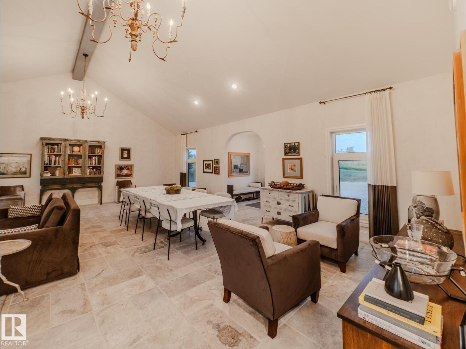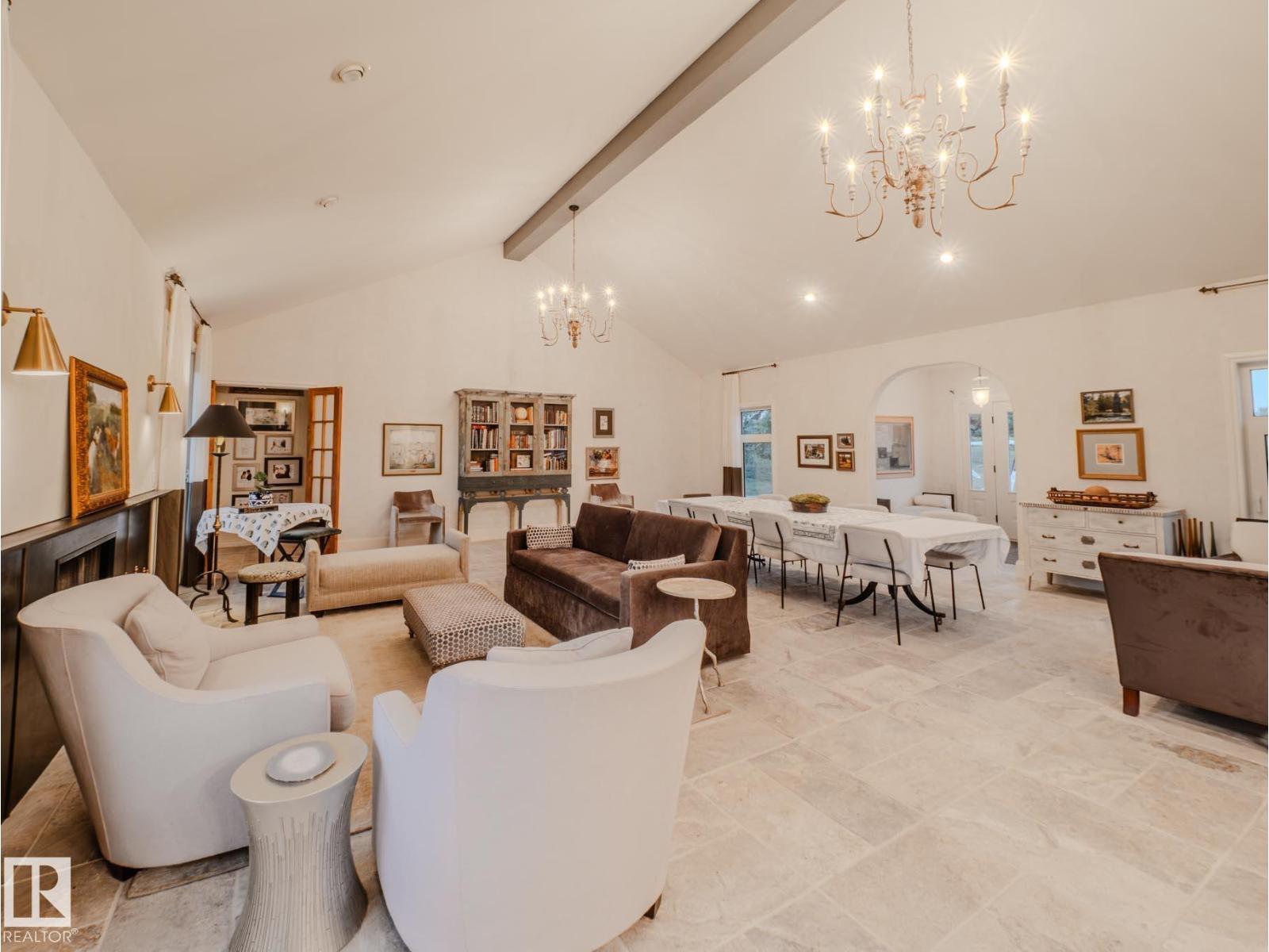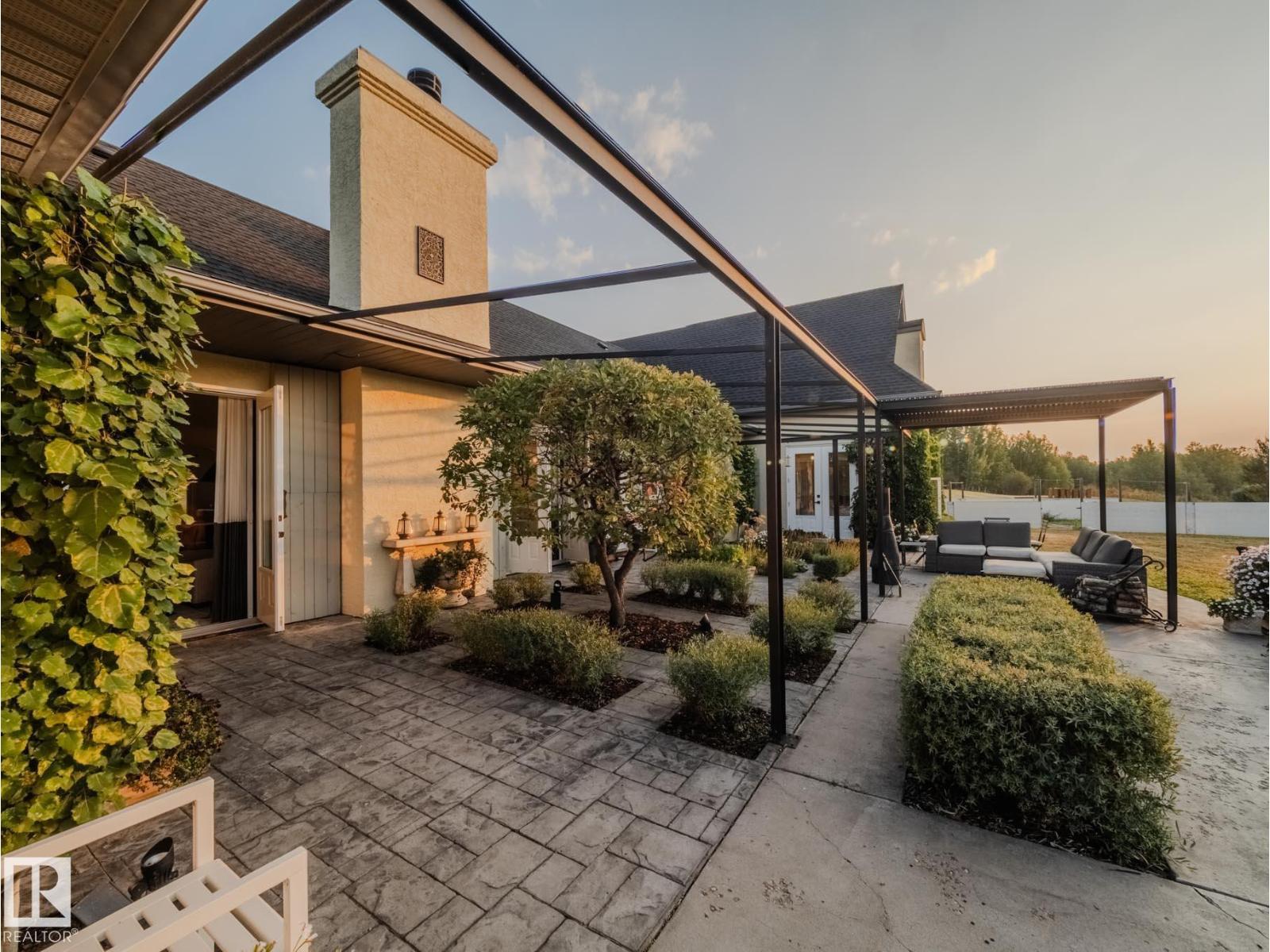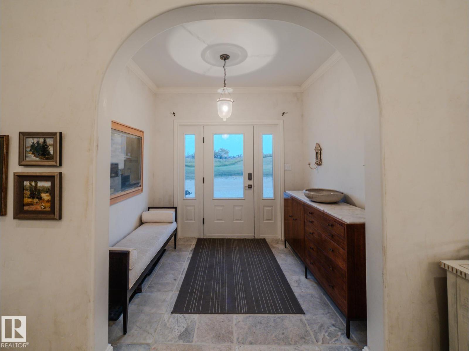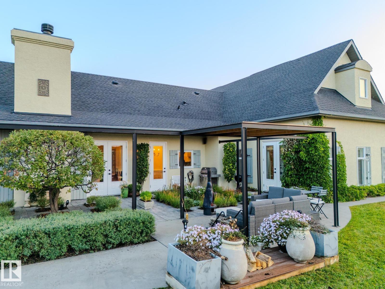 MODERN EUROPEAN MASTERPIECE....NOT A DETAIL OVERLOOKED.....20 ACRES......10 MIN TO THE CITY.... COLD ROLLED STEEL/HERRINGBONE TILES/OLD WORLD CRAFTSMANSHIP....WORDS CANNOT DESCRIBE THE PATIO....~!WELCOME HOME!~ A world class acreage in the heart of Strathcona County, one of a kind design w/accents and decor curated from around the globe... Greeted by hand blasted heated travertine floors... something you'd expect from a villa in the south of France. Soaring ceilings, beams & a dramatic great room is just the beginning! The right wing has a library, classic mill work & a bedroom w/ensuite. To the left is the Gourmet Kitchen w details at every glance. Down the hall, another bedroom + ensuite, bonus room up stairs w/built in banquet seating, & options galore! Then we have the back entrance (even this is like a magazine shoot... !) Last is the Primary retreat, custom cabinets, spa - just have to see. No basement to babysit, every corner has been re-worked, refined, and re-imagined to absolute perfection! (id:51989)