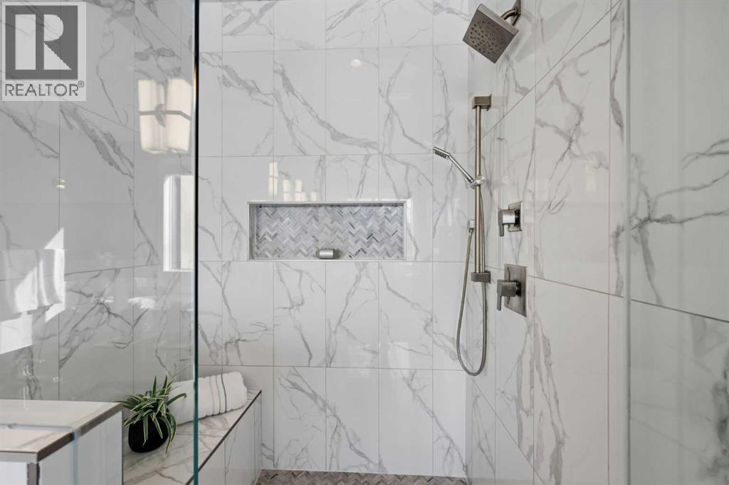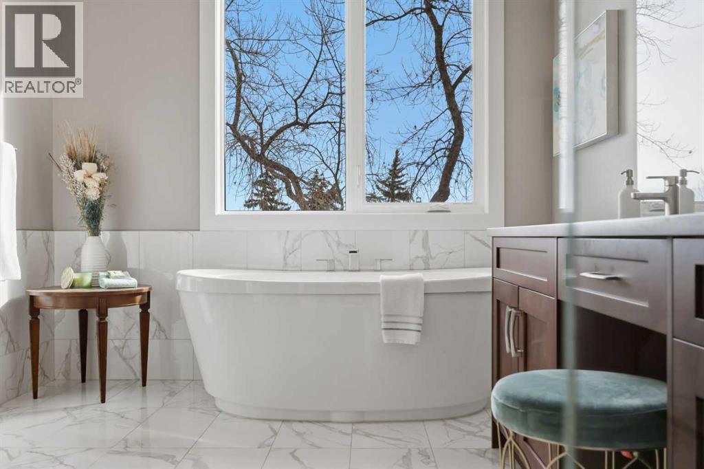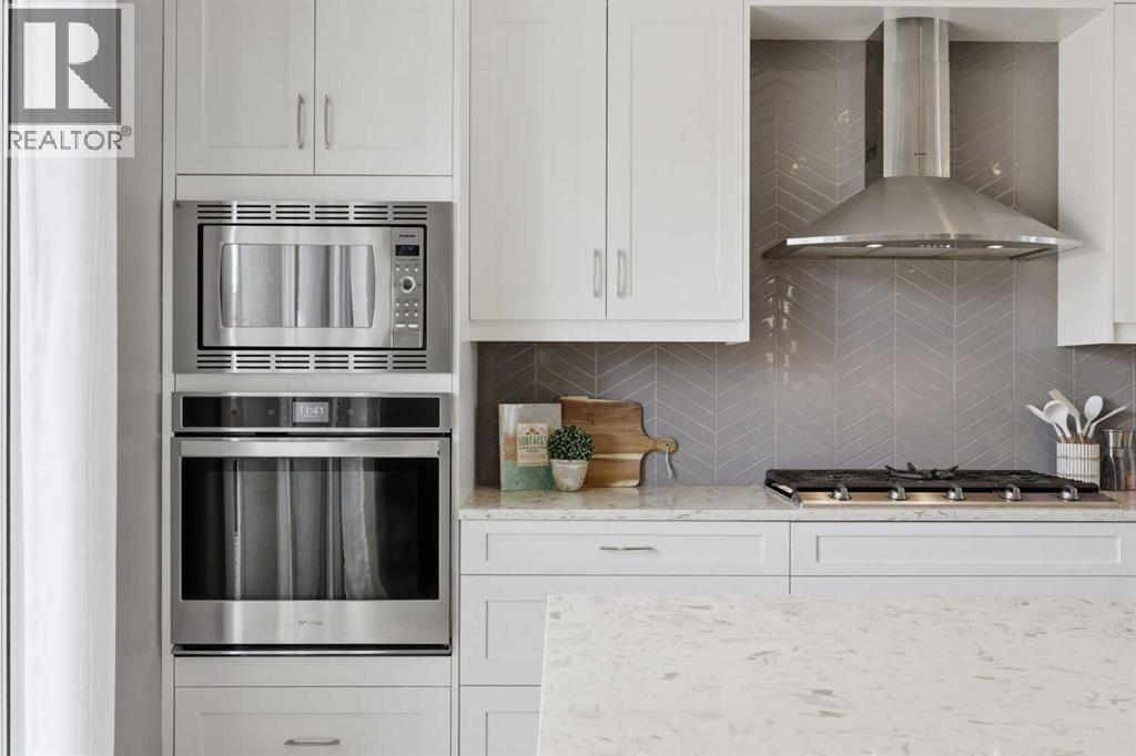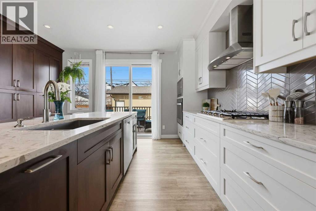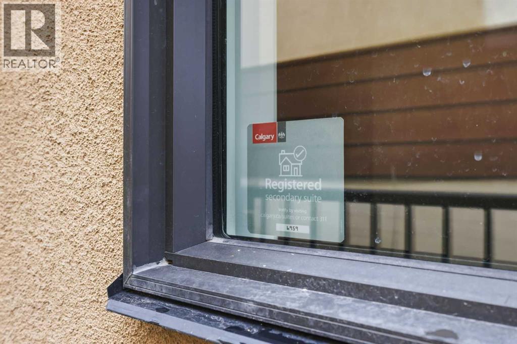 Discover this stunning, highly upgraded designer semi-detached infill offering over 3,250 sq ft of finely crafted living space in the vibrant community of Winston Heights. Featuring 5 bedrooms, 3.5 bathrooms, and a fully developed legal 2-bedroom basement suite with private entrance. Welcome to a bright, open main floor with soaring 9' ceilings, 8' doors, and rich wide-plank hardwood flooring. The living room centres around a dramatic gas fireplace clad in floor-to-ceiling textured grey stone tile, flanked by custom built-in cabinetry and oversized windows that frame direct park views. A dedicated main floor office offers the perfect work-from-home setup, while the spacious dining area flows into the show-stopping kitchen. Finished in a striking two-tone palette of crisp white full-height cabinetry paired with warm walnut lowers and a matching floor-to-ceiling built-in pantry, the kitchen features a glossy chevron herringbone backsplash, 5-burner gas cooktop, chimney hood fan, built-in wall oven and microwave, and a dedicated coffee and beverage station. The oversized quartz island with undermount black Blanco double sink seats four. A mudroom with built-in storage and stylish powder room complete the main level. Upstairs, the primary bedroom impresses with vaulted ceilings, a walk-in closet, treetop views, and a private balcony. The spa-inspired ensuite features a standalone soaker tub, glass-enclosed shower with built-in niche, dual-sink walnut vanity, brushed-nickel fixtures, sconce lighting, and Calacatta marble-look tile. Two additional bedrooms, a modern 4-piece bath, and a laundry room with side-by-side machines, upper cabinetry, and sink complete the upper level. Additional highlights include central air conditioning, a private west-facing backyard with wood deck, full fencing, and a double detached heated garage. The durable stucco exterior reflects the quality craftsmanship found throughout. The fully developed legal 2-bedroom lower suite (Suite #6959) off ers exceptional flexibility with its own private entrance, contemporary kitchen, full appliance package, spacious living area, 4-piece bath, and separate laundry. Residents of Winston Heights enjoy highly rated schools, a recreation and aquatic centre, golf, tennis, off-leash parks, scenic pathways, quick access to 16 Ave and Deerfoot, and downtown Calgary just minutes away. (id:51989)